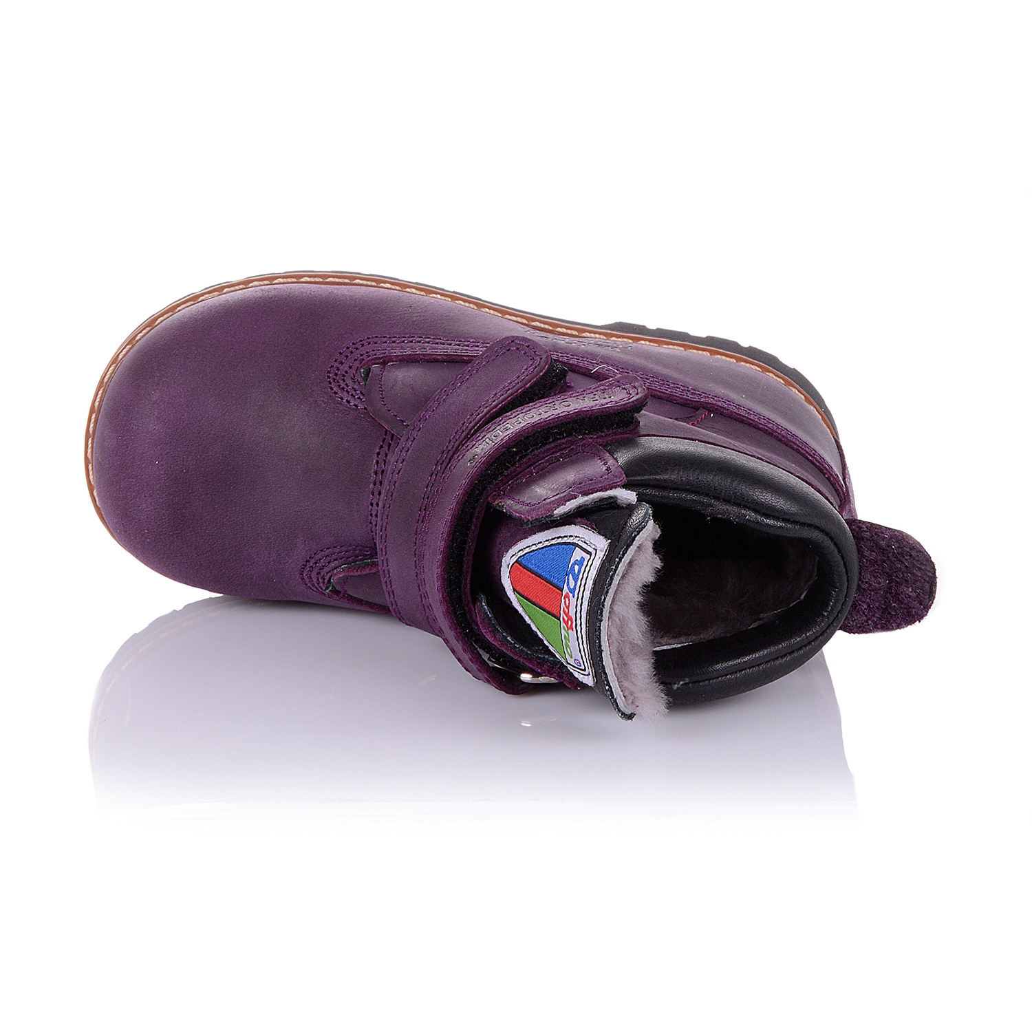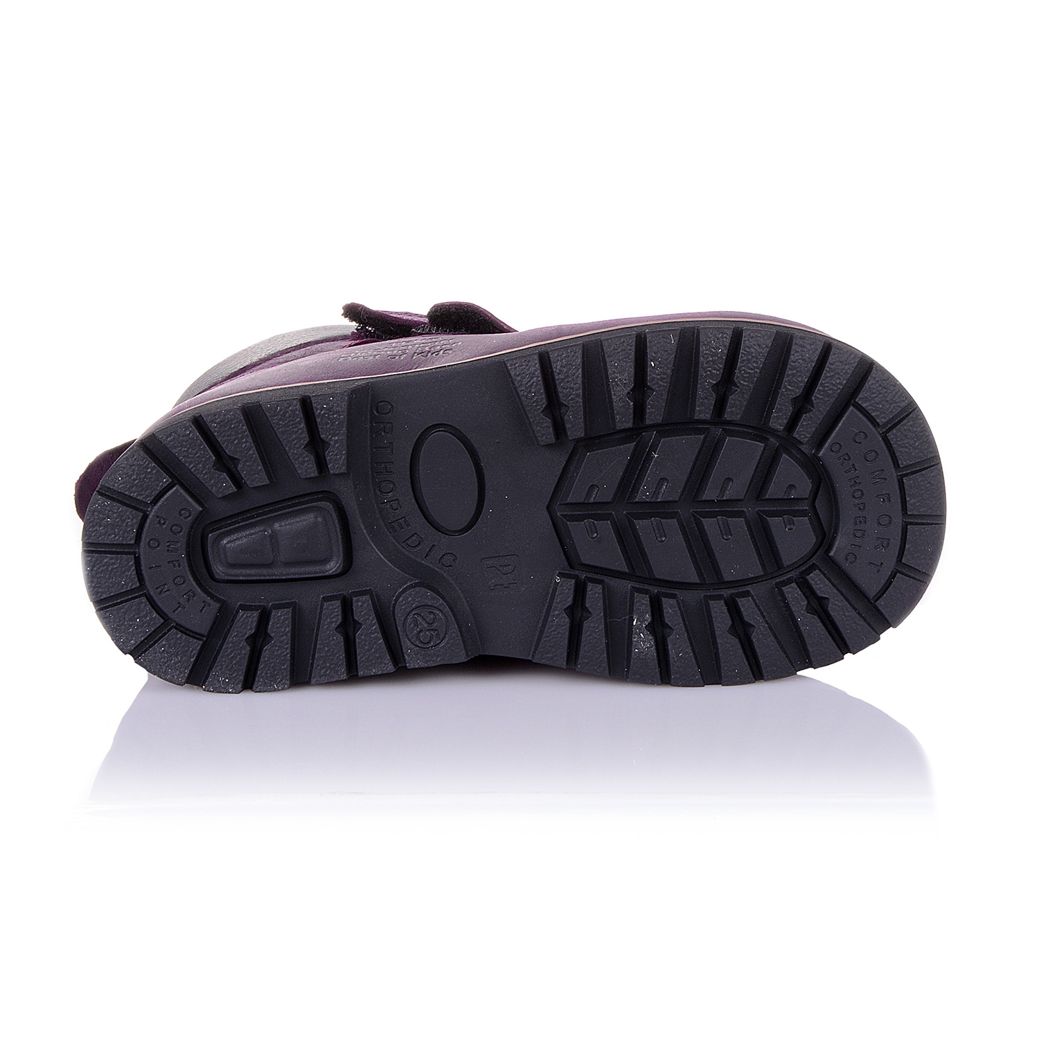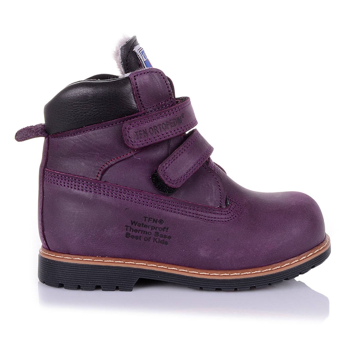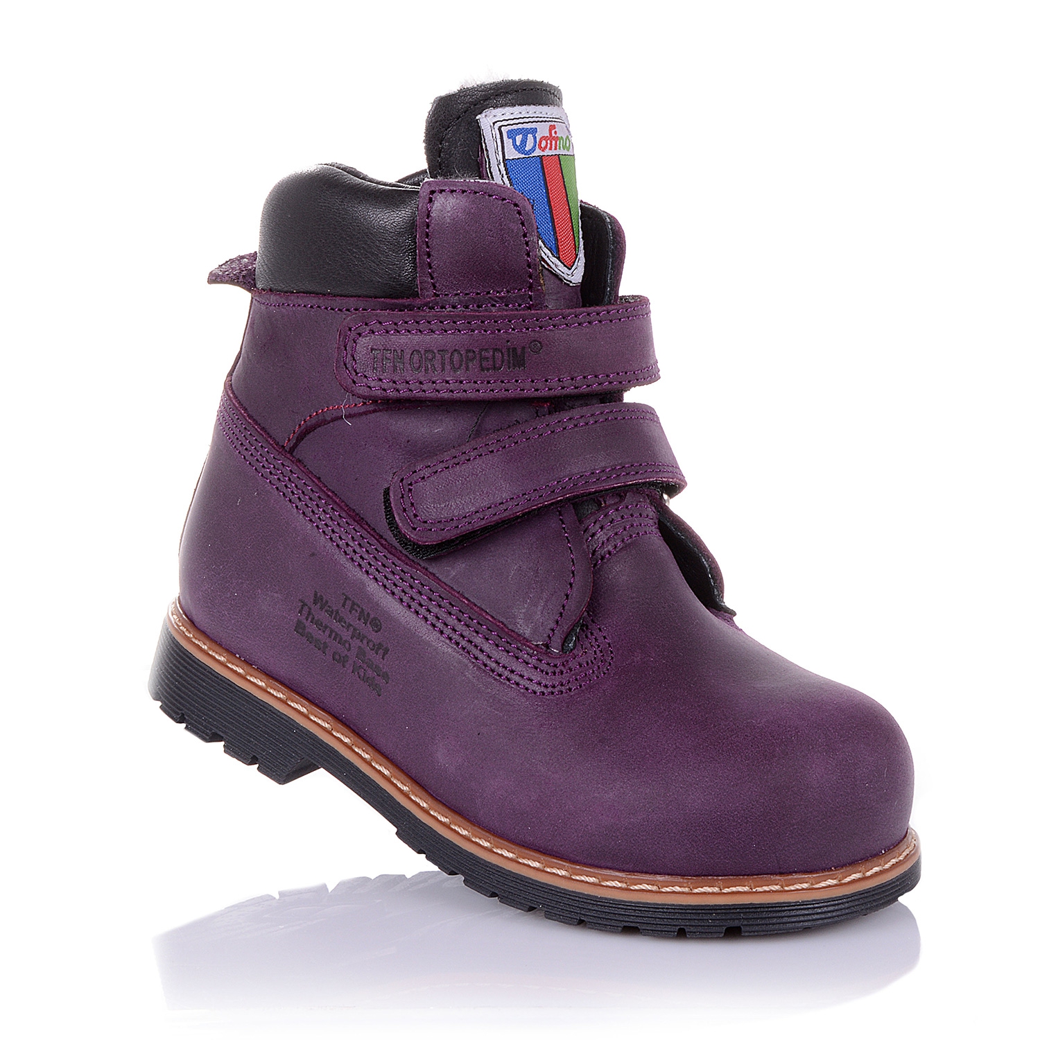 Зимние ортопедические ботинки фиолетового цвета. Сверху регулируются двумя липучками. Снаружи кожа (жирный нубук), внутри - натуральный мех (цигейка). Есть ортопедический каблук Томаса, высокий твердый задник и супинатор.