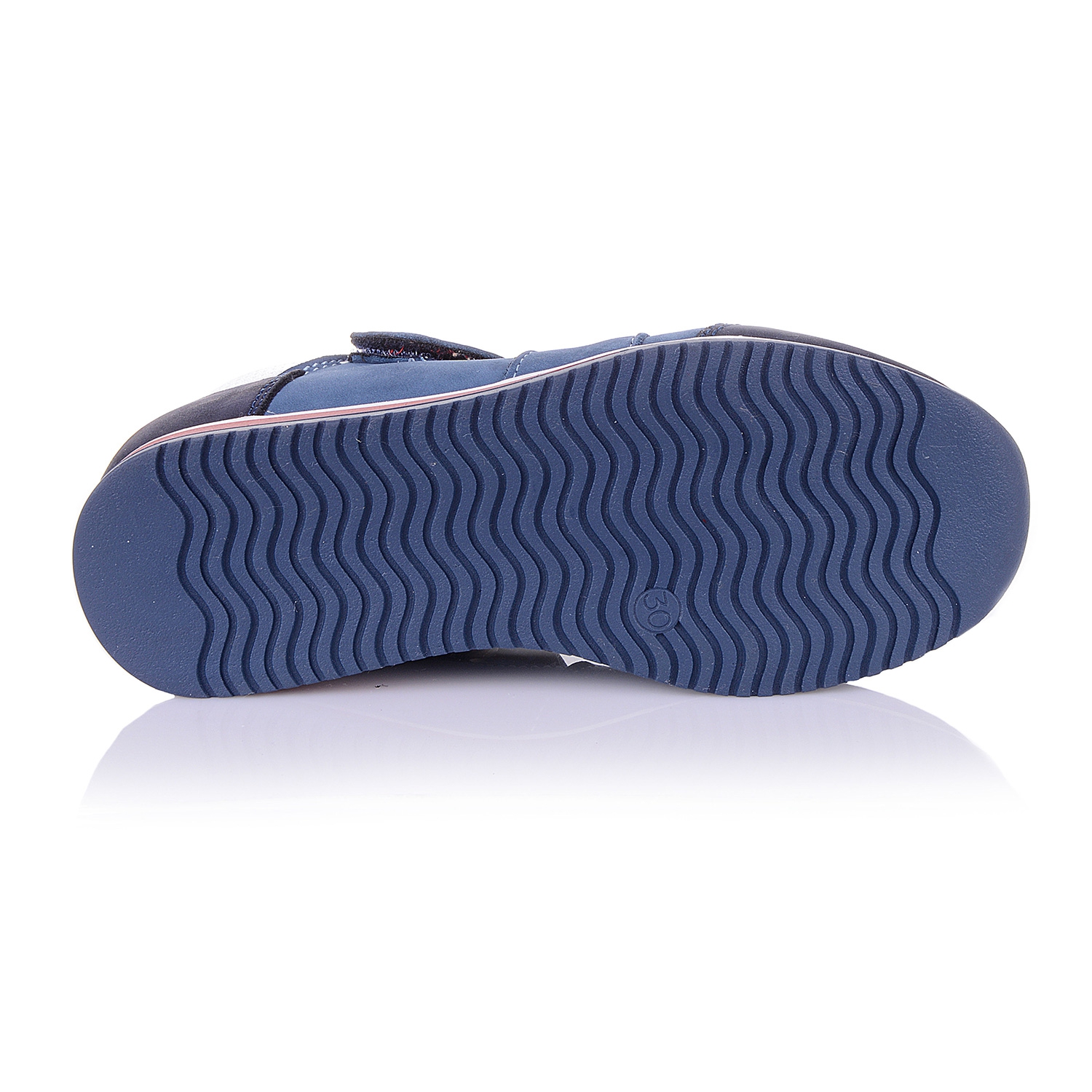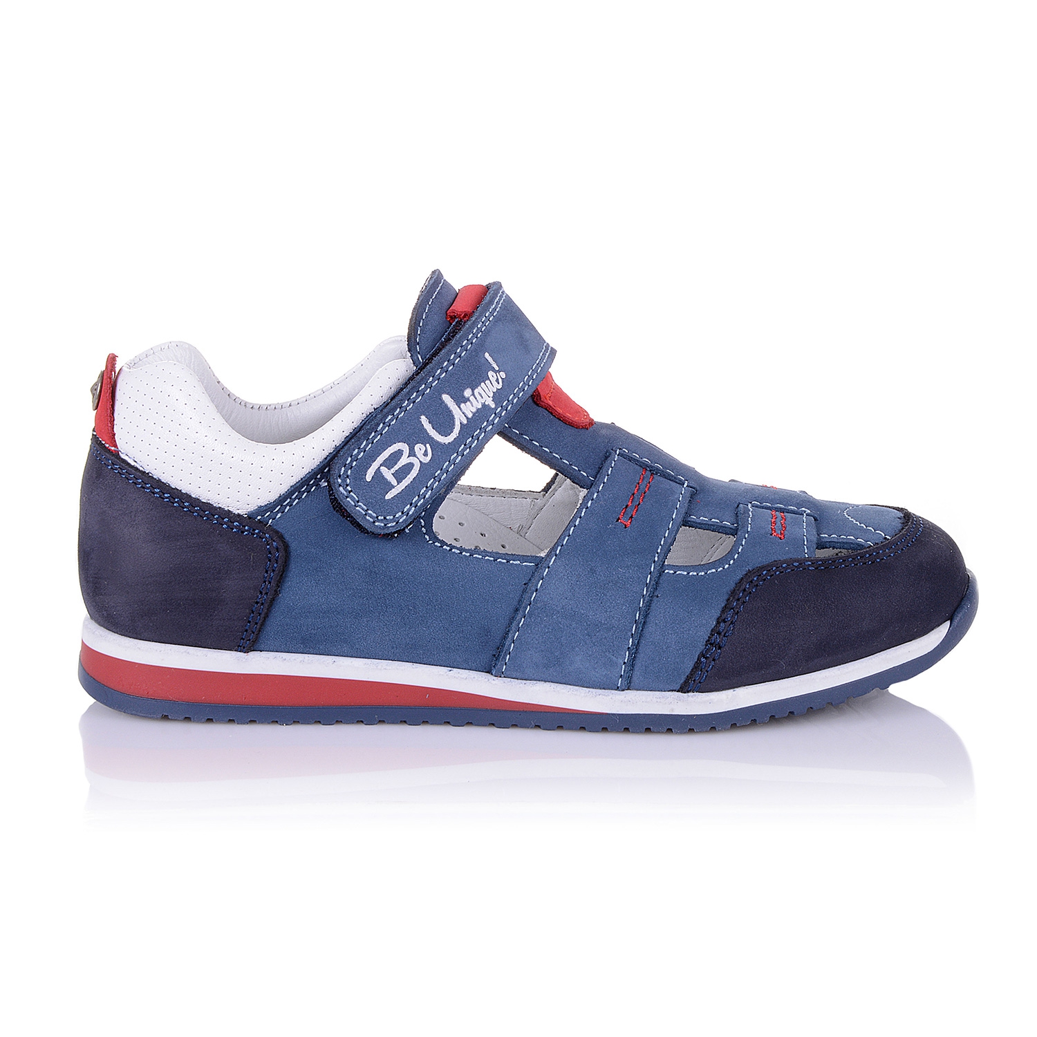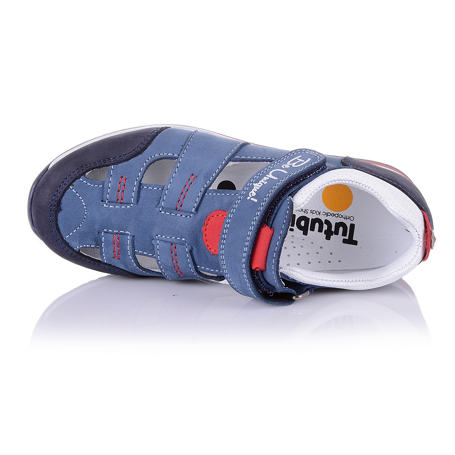 Закрытые ортопедические босоножки синего со вставками темно-синего цвета на ребристой подошве, практичная и модная модель. Удобная фиксация липучкой позволяет подобрать обувь на ногу разной полноты и высоты свода. Кожаная стелька с супинатором и твердый задник обеспечивают физиологически правильное положение ножки. Анатомическая подошва, износостойкая из термокаучука, с ребристой поверхностью которая снимает ударную нагрузку на пяточную кость и обеспечивает хорошее сцепление с твердой поверхностью. В обуви такого качества ваш ребенок будет чувствовать себя уверенно и комфортно!