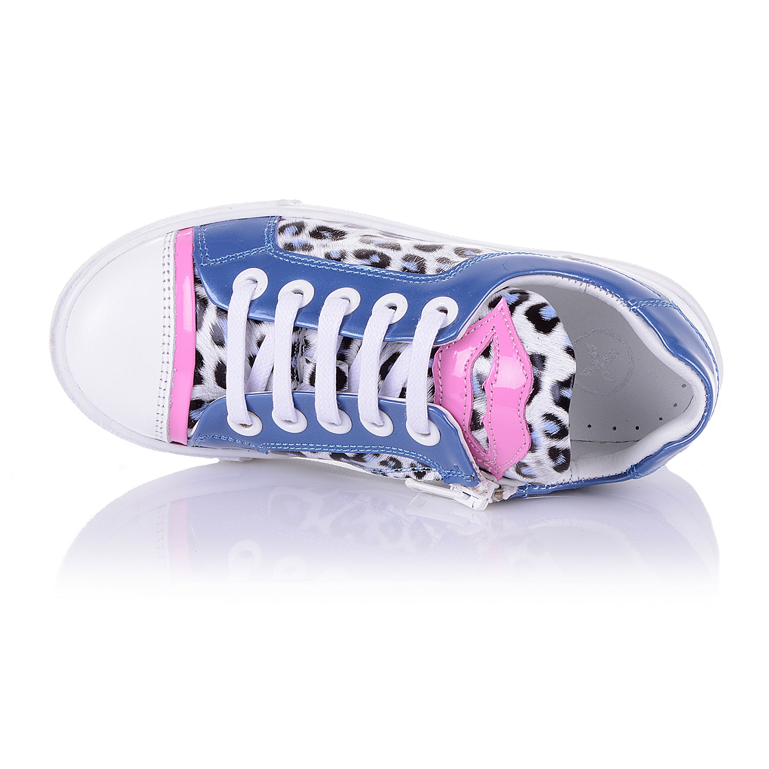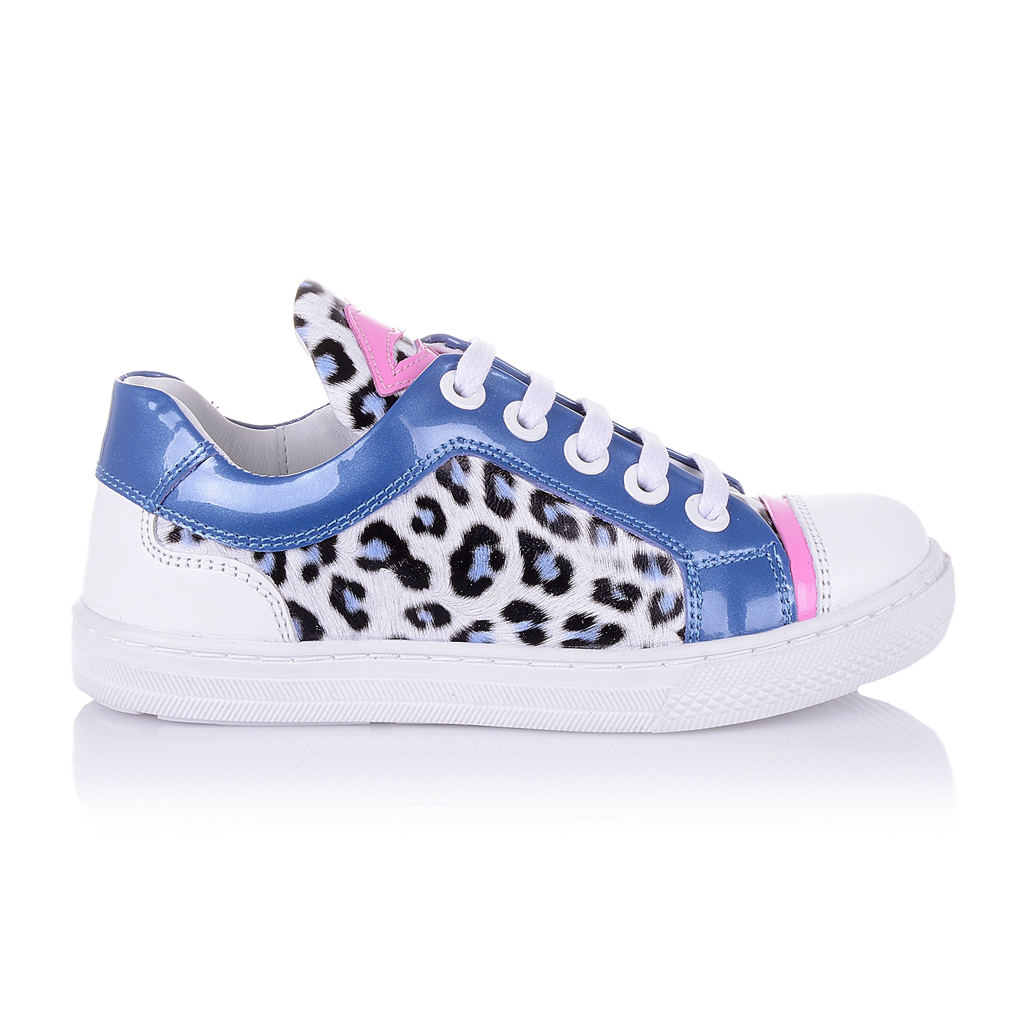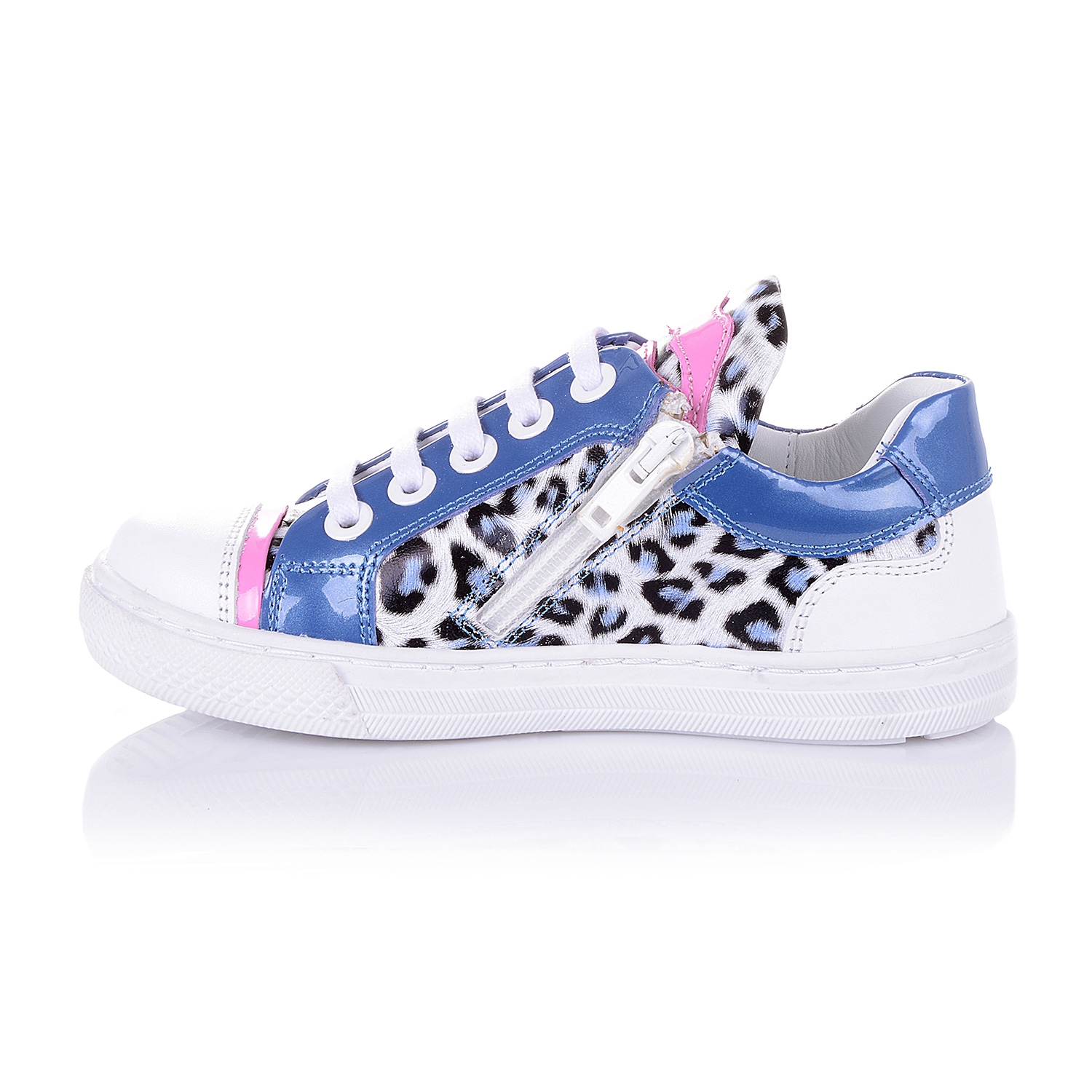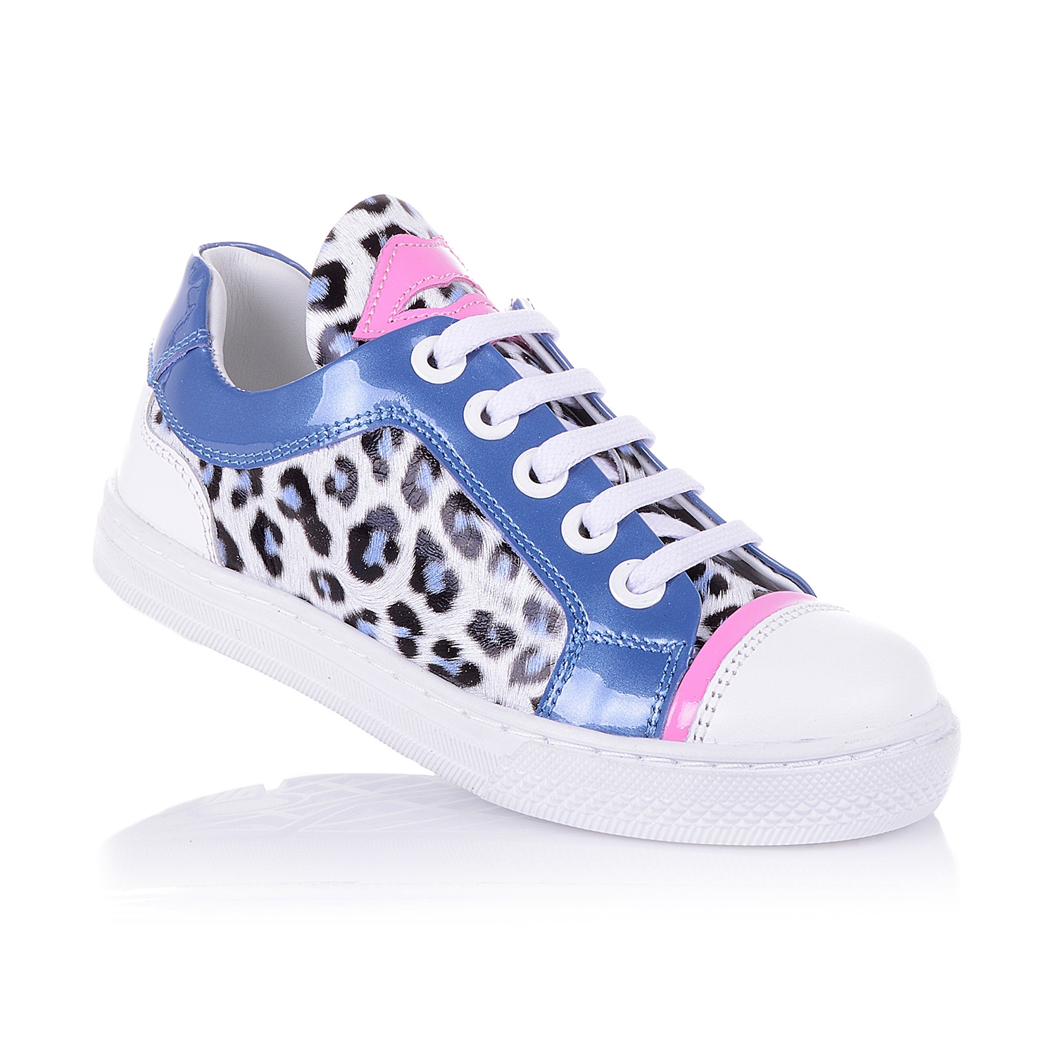Модные кроссовки для девочки на белой подошве, выполнены из лаковой кожи с анималистическим принтом со вставками голубого и розового цвета, выглядят ярко и сразу бросаются в глаза. Кожаная стелька с супинатором и твердый задник обеспечивают физиологически правильное положение ножки, а удобная фиксация на молнию сбоку и шнуровку позволит выбрать обувь на ногу разной полноты и высоты свода. Анатомическая износостойкая подошва из термокаучука с имитацией каблука Томаса, очень мягкая и амортизирует, обеспечивая комфортную походку. Ваш ребенок будет в восторге от данной модели.