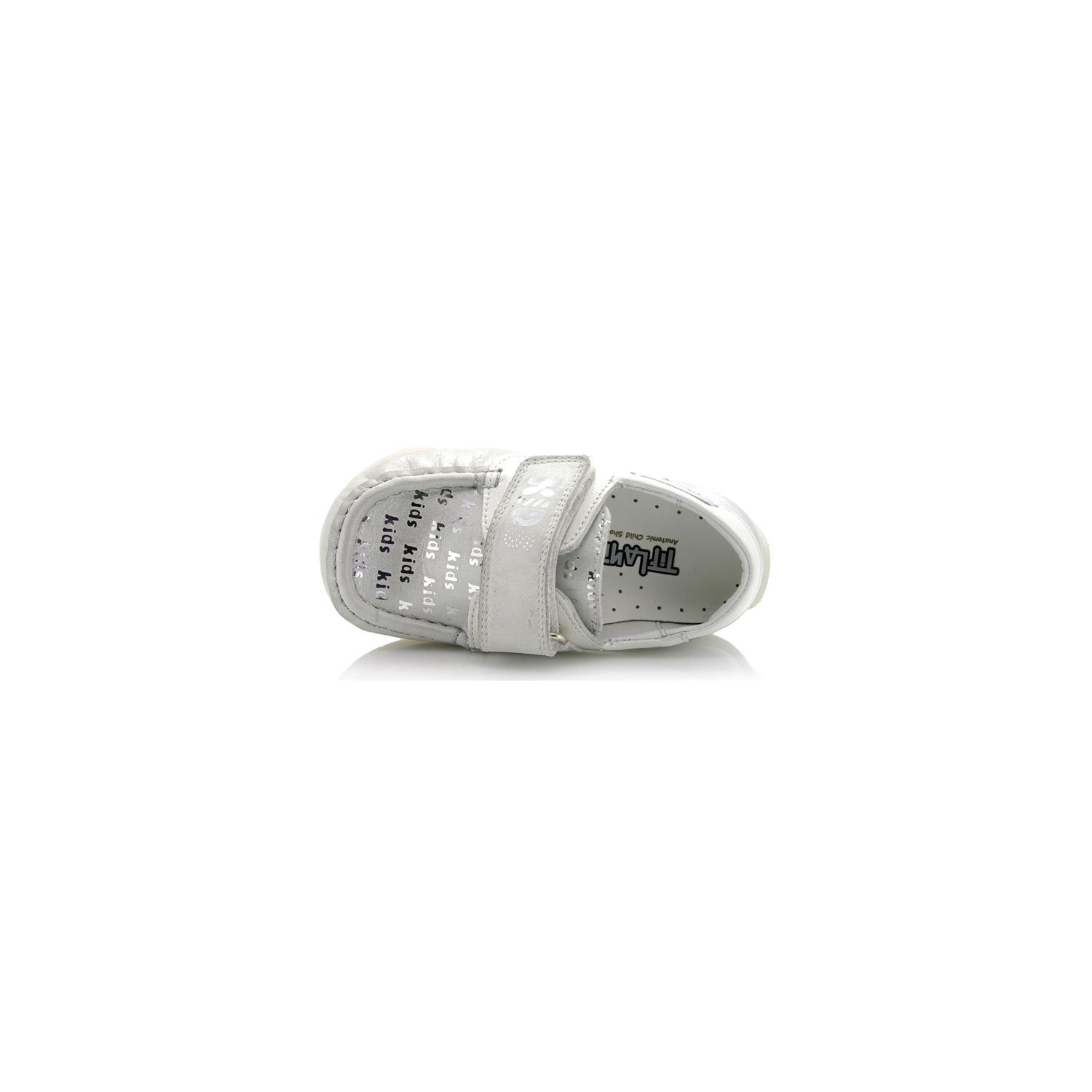 Мокасины Tiflani белого цвета с серебристым напылением, на широкой липучке. Снаружи и внутри кожаные. Есть супинатор и твердая пятка.
