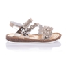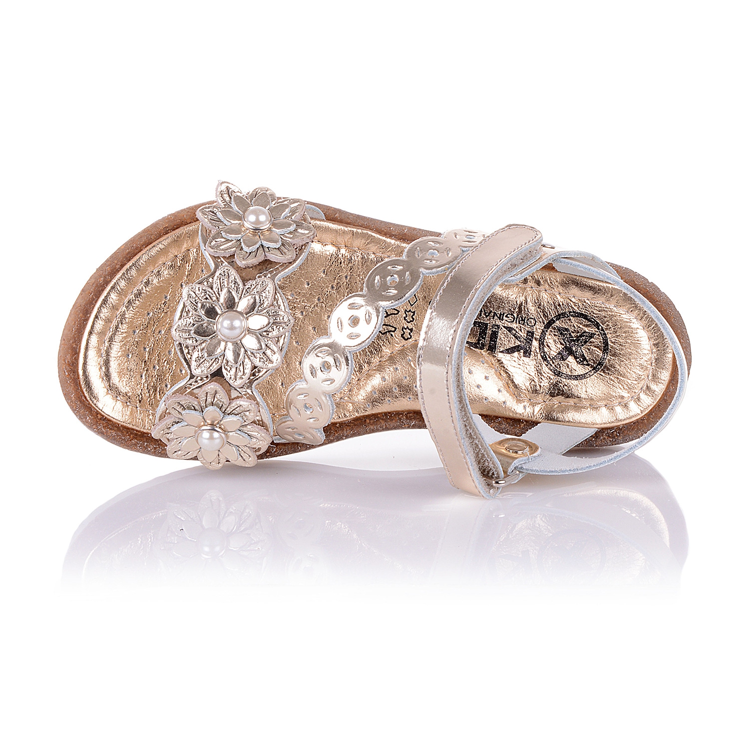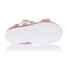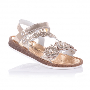 Утонченные ортопедические босоножки из мягкой кожи золотого цвета с аппликацией из мелких цветочков. Удобная фиксация на липучку поможет зафиксировать туфли на ногу разной высоты свода. Кожаная стелька с супинатором обеспечивают физиологически правильное положение ножки. Анатомическая подошва, износостойкая из термокаучука, с имитацией пробкового материала. В такой паре обуви ребёнок будет себя чувствовать легко и непринуждённо.