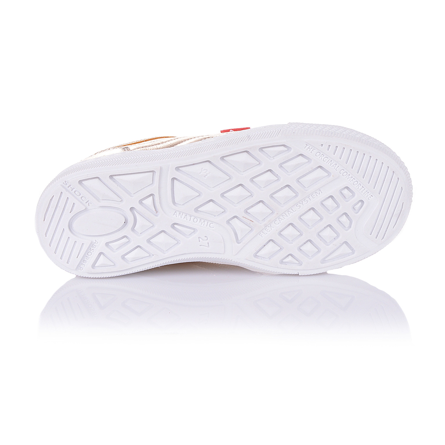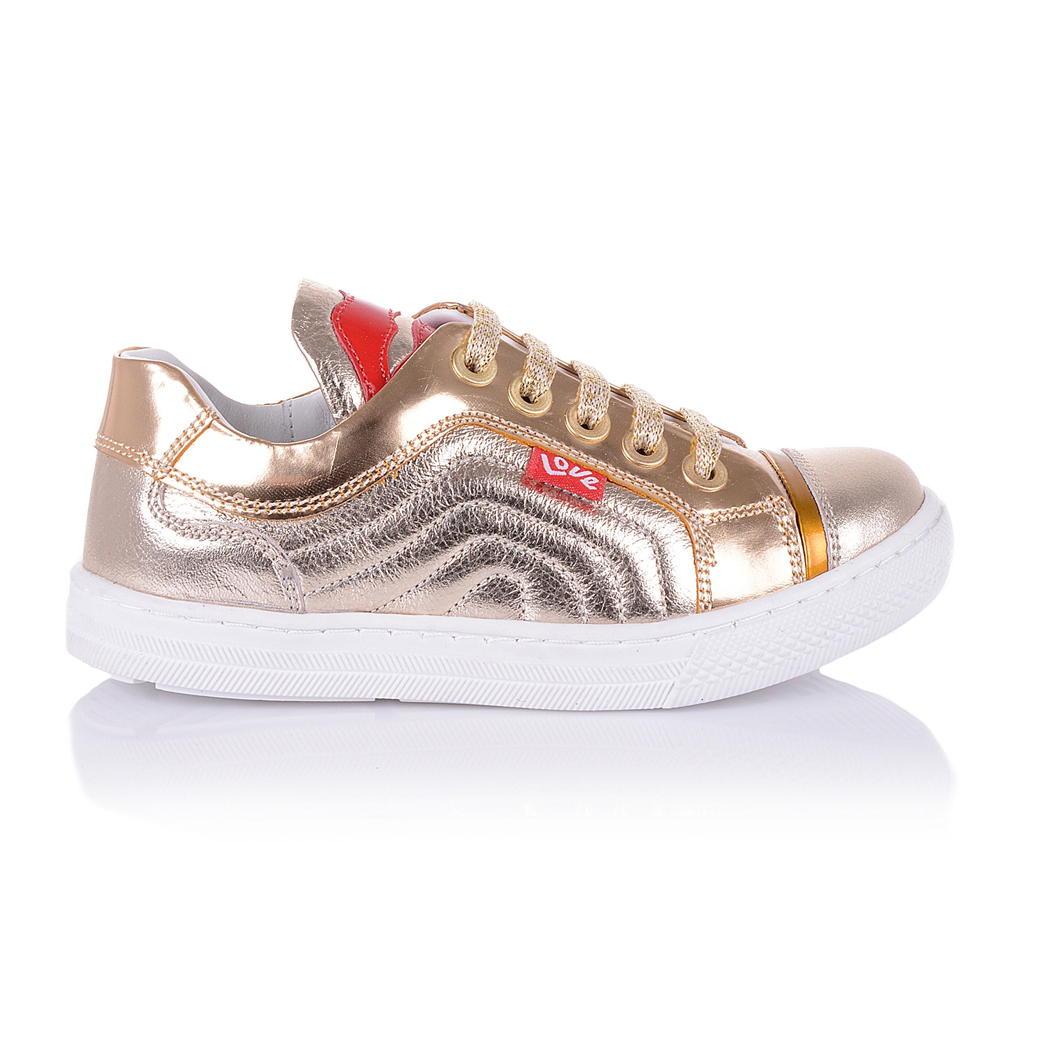 Модные кроссовки для девочки на белой подошве, выполнены из кожи золотистого цвета с глянцем, выглядят ярко и сразу бросаются в глаза. Кожаная стелька с супинатором и твердый задник обеспечивают физиологически правильное положение ножки, а удобная фиксация на молнию сбоку и шнуровку позволит выбрать обувь на ногу разной полноты и высоты свода. Анатомическая износостойкая подошва из термокаучука с имитацией каблука Томаса, очень мягкая и амортизирует, обеспечивая комфортную походку. Ваш ребенок будет в восторге от данной модели.