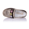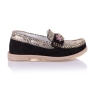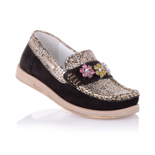 Мокасины черного цвета, выполнены из нубука с золотой кожаной вставкой, украшены красивыми аксессуарами в виде камней. Внутри кожаные, снаружи кожа+нубук. Стелька с супинатором, твердым задником и прочной подошвой обеспечивают физиологически правильную фиксацию ножки.