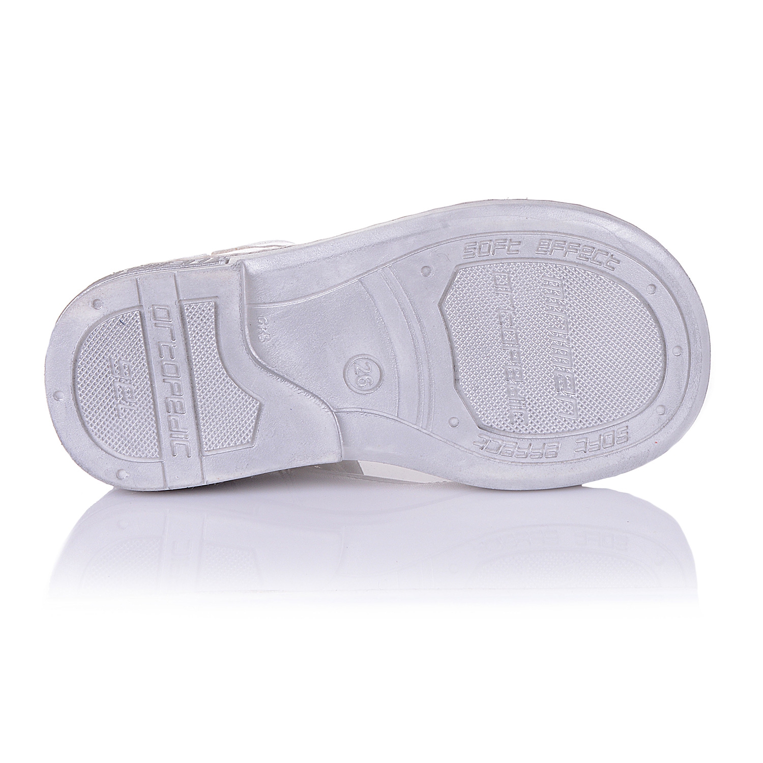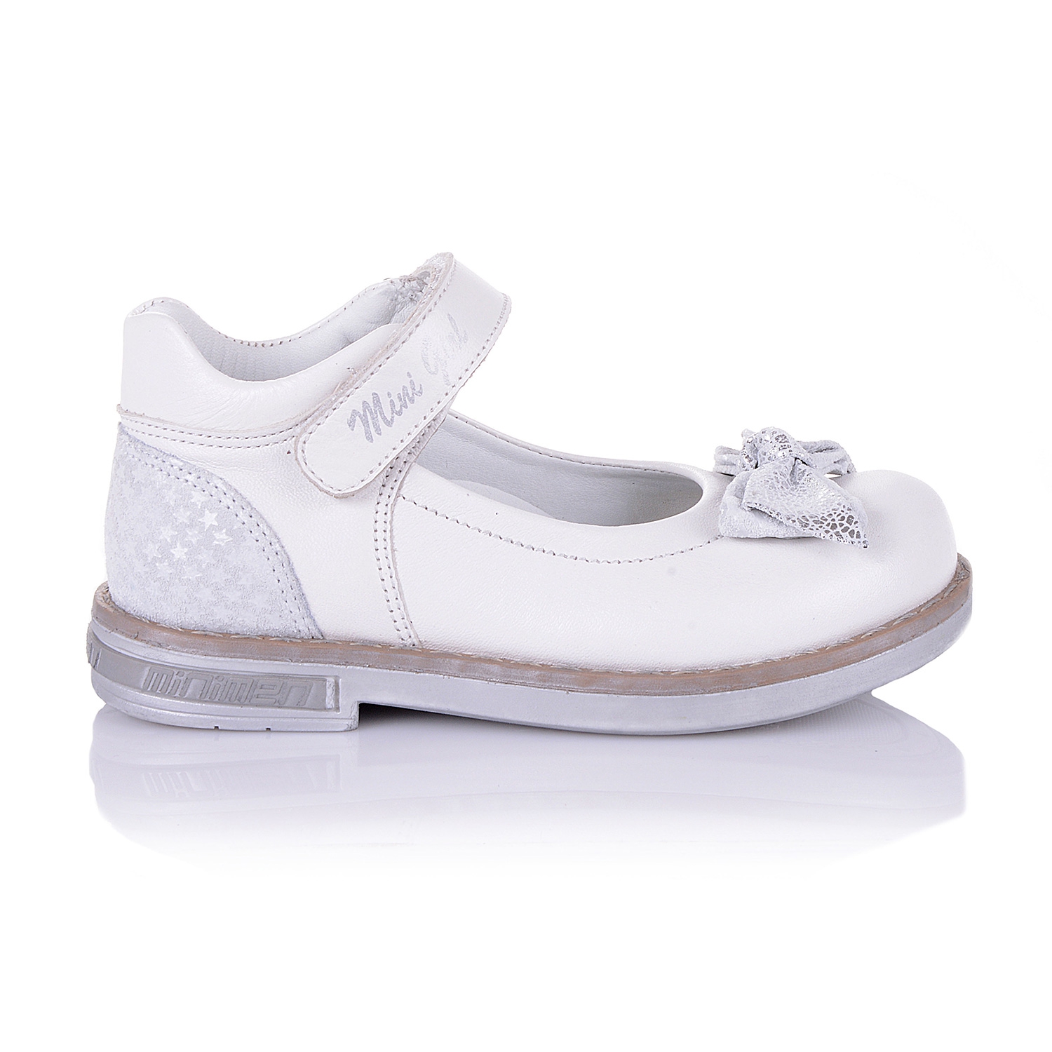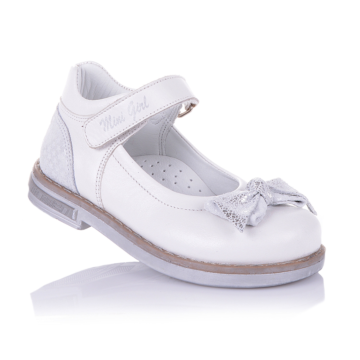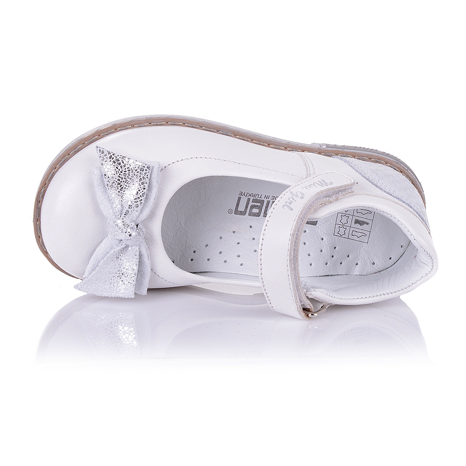 Ортопедические туфельки для девочки из эксклюзивной кожи белого цвета. Внутренняя и внешняя часть изделия выполнена из натуральной кожи. Удобная фиксация на липучку позволяет подобрать туфли на ногу разной полноты и высоты свода. Дышащая стелька с супинатором и твердый задник обеспечивают физиологически правильное положение ножки. Подошва, износостойкая из термокаучука, со скошенным каблуком Томаса и антишоковыми вставками, которые снимают ударную нагрузку на пяточную кость. Одевая такую пару обуви, Ваш ребенок будет чувствовать себя комфортно и эксклюзивно.