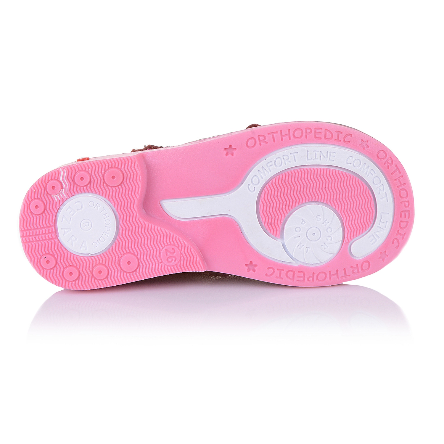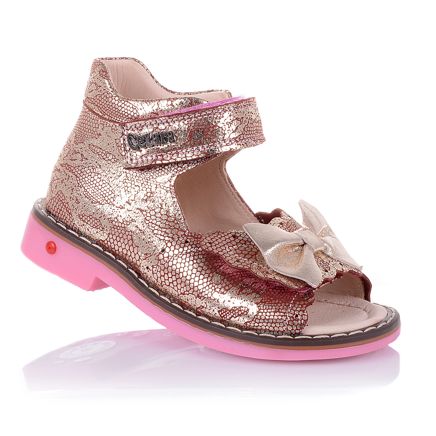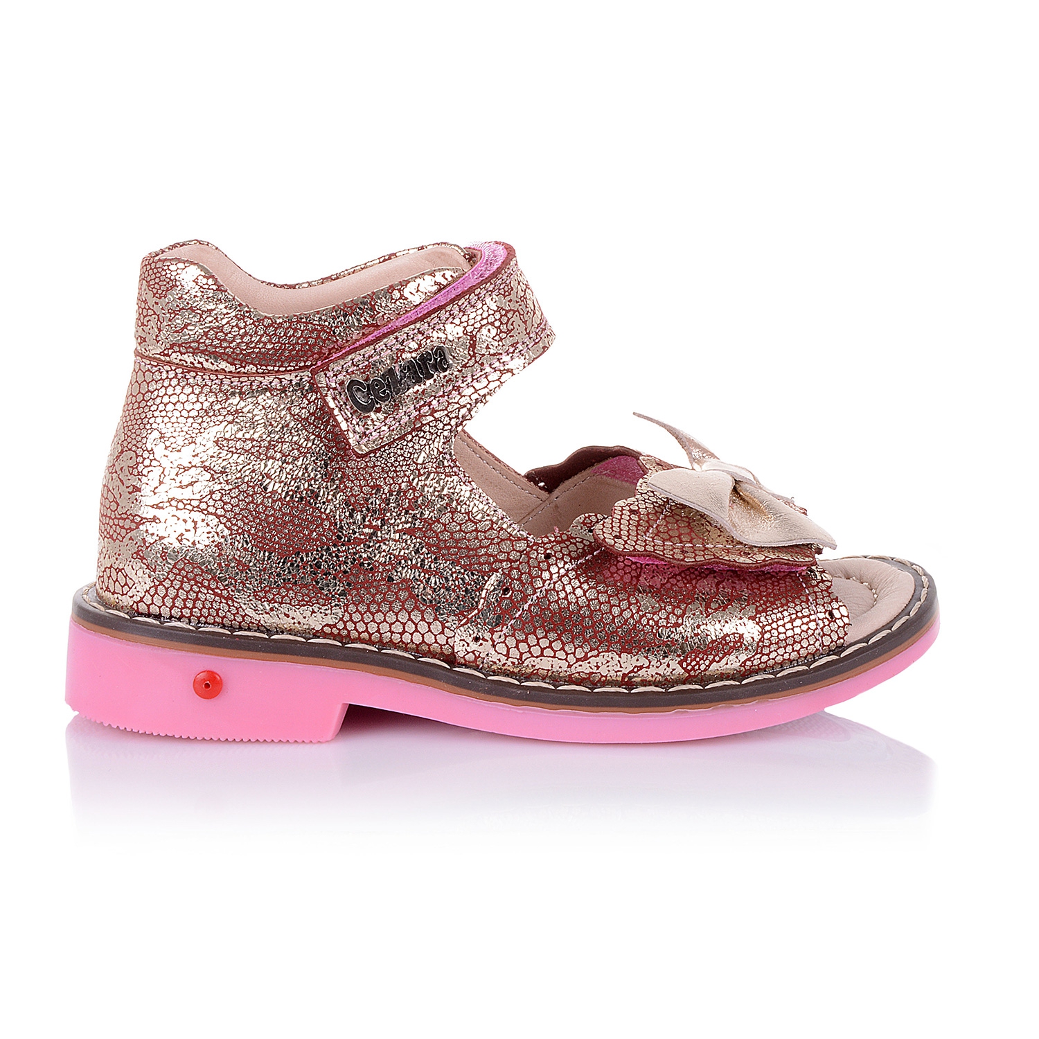 Эксклюзивные ортопедические босоножки с золотистым принтом на розовой коже. Удобная фиксация двумя липучками позволяет подобрать туфли на ногу разной полноты и высоты свода. Кожаная стелька с супинатором и твердый задник обеспечивают физиологически правильное положение ножки. Подошва, износостойкая из термокаучука, со скошенным каблуком Томаса и антишоковыми вставками, которые снимают ударную нагрузку на пяточную кость. Цветовое решение этой модели универсальное и подойдет почти под любую одежду.Ваша маленькая модница будет в восторге.