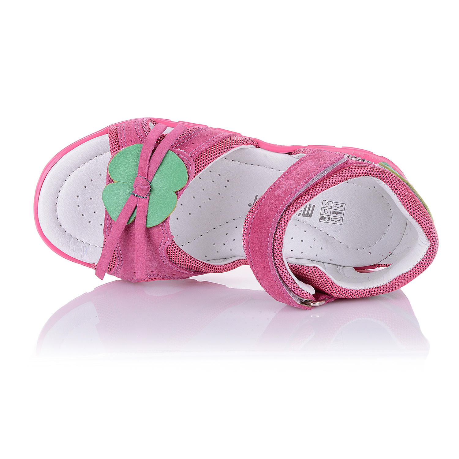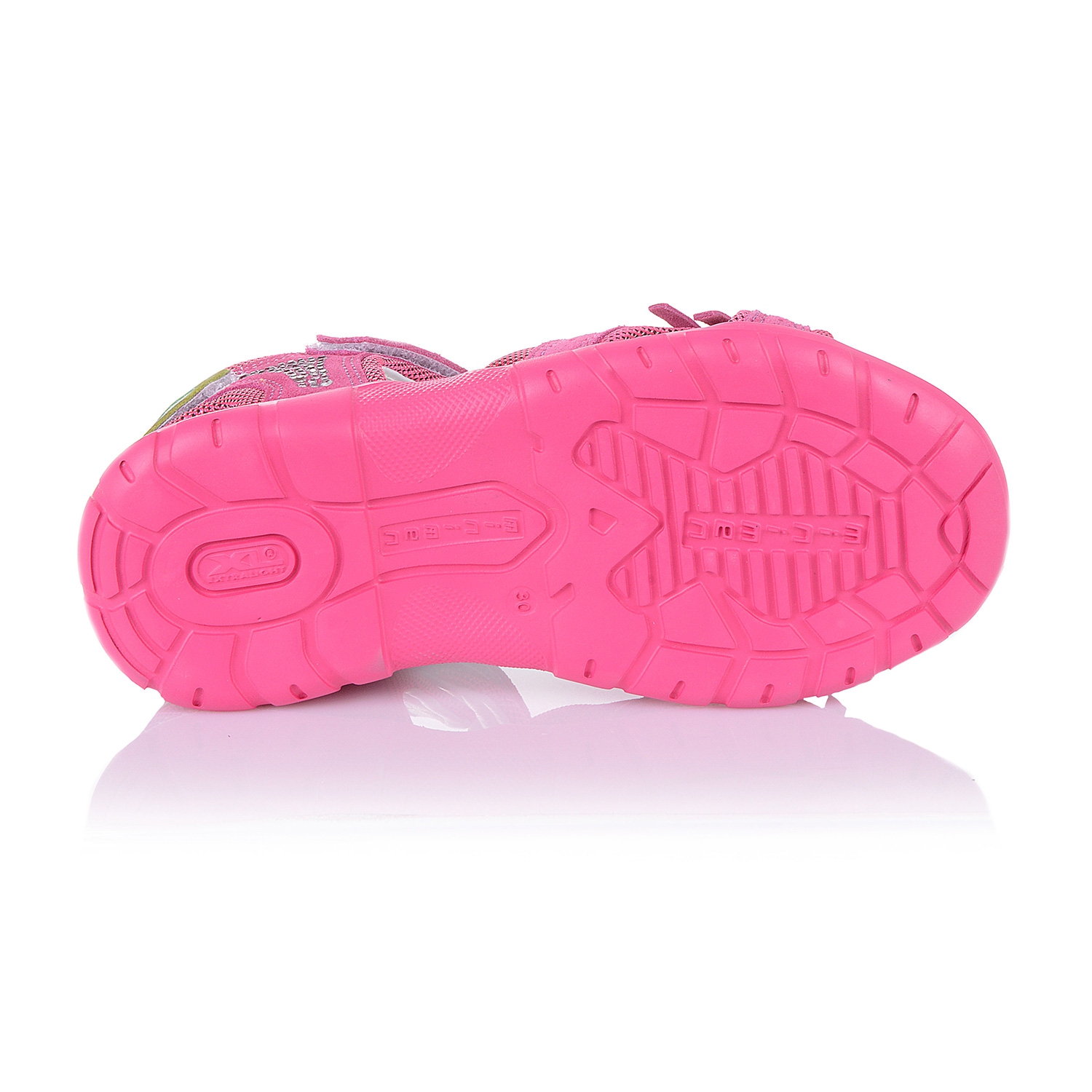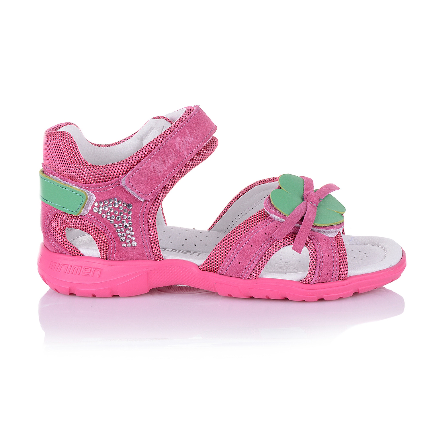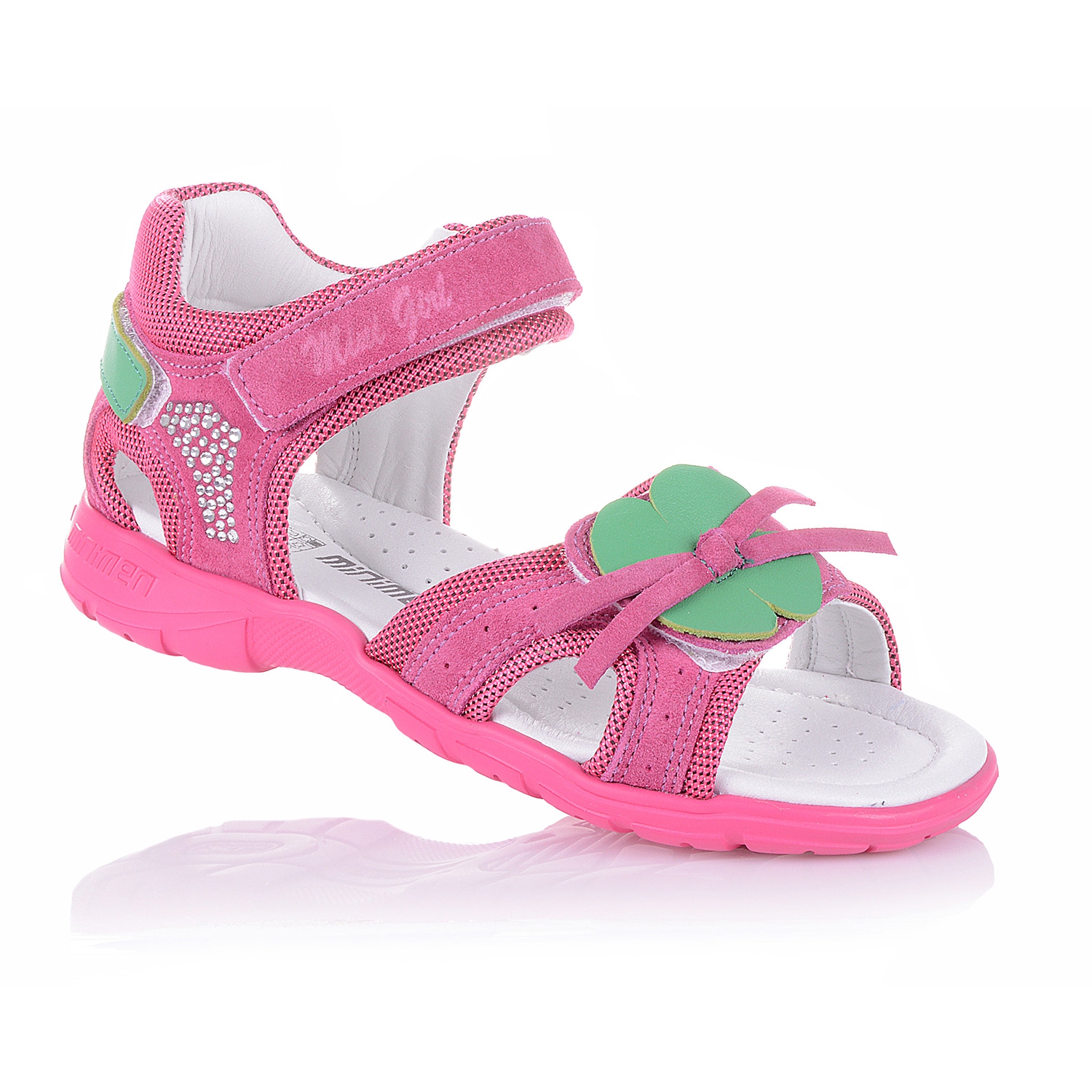 Яркие босоножки с легкой подошвой XLight малинового цвета со стразиками и аппликацией зеленого цвета, выполнены из кожи со вставками из текстиля. Внутренняя и внешняя часть изделия выполнена из натуральной кожи. Удобная фиксация на липучку позволяет подобрать обувь на ногу разной полноты и высоты свода. Стелька с супинатором и твердый задник обеспечивают физиологически правильное положение ножки. Анатомическая износостойкая подошва из термокаучука с антишоковыми вставками, которые снимают ударную нагрузку на пяточную кость. Такая модель идеально подойдет для ежедневных прогулок.