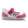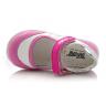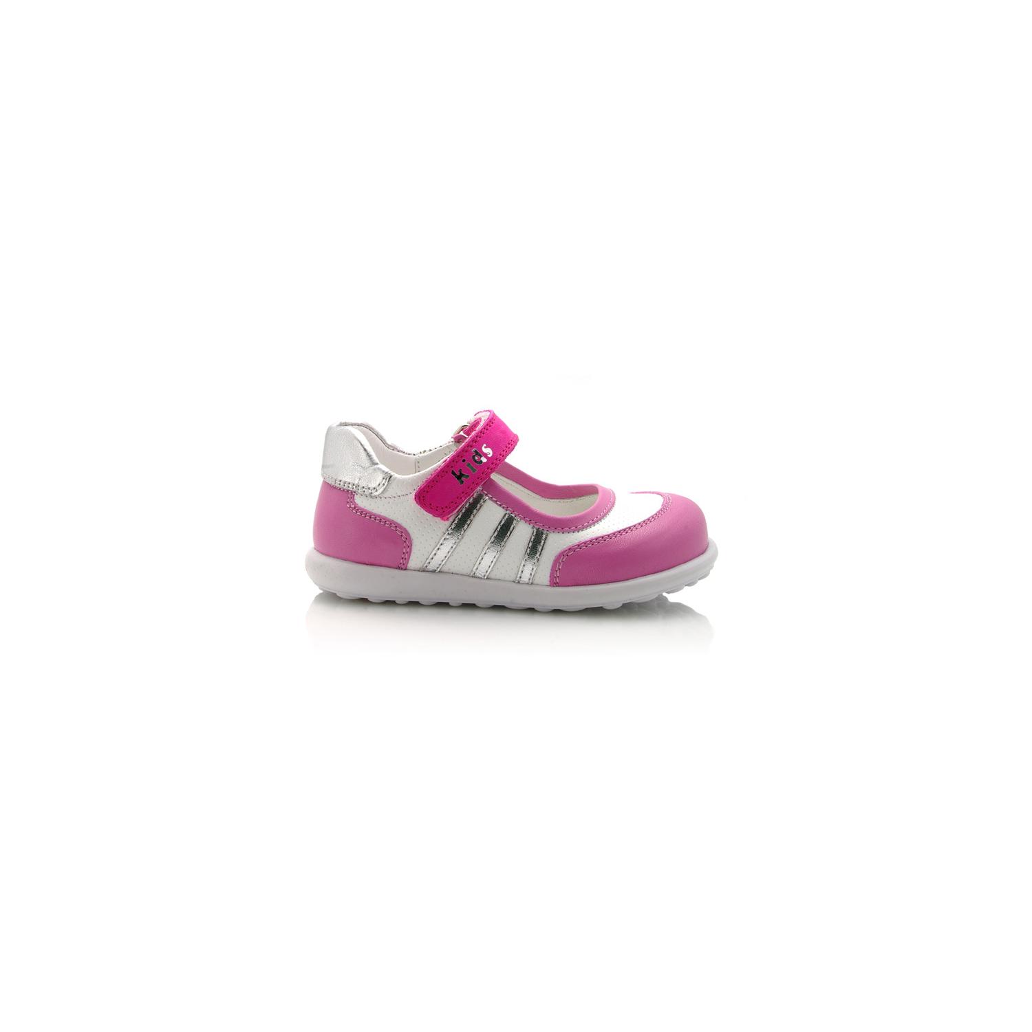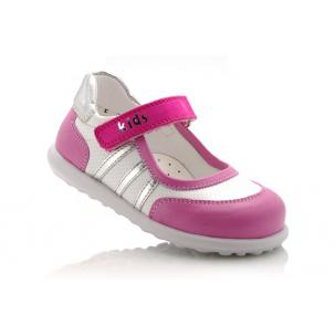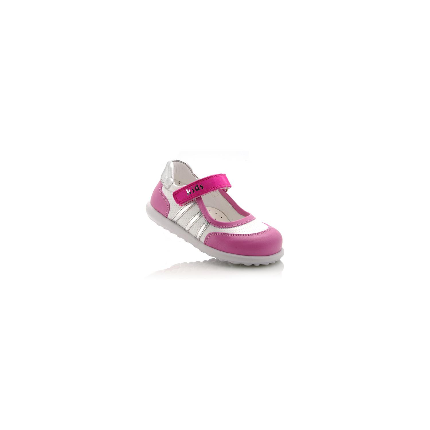 Туфли Tiflani розового цвета с белыми вставками, сверху фиксируются липучкой. Снаружи и внутри кожаные, есть супинатор и твердая пятка.
