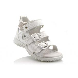 Босоножки Minimen белого цвета, фиксируются 2-мя застежками снизу и липучкой сверху. Снаружи и внутри кожаные, есть супинатор и твердая пятка.