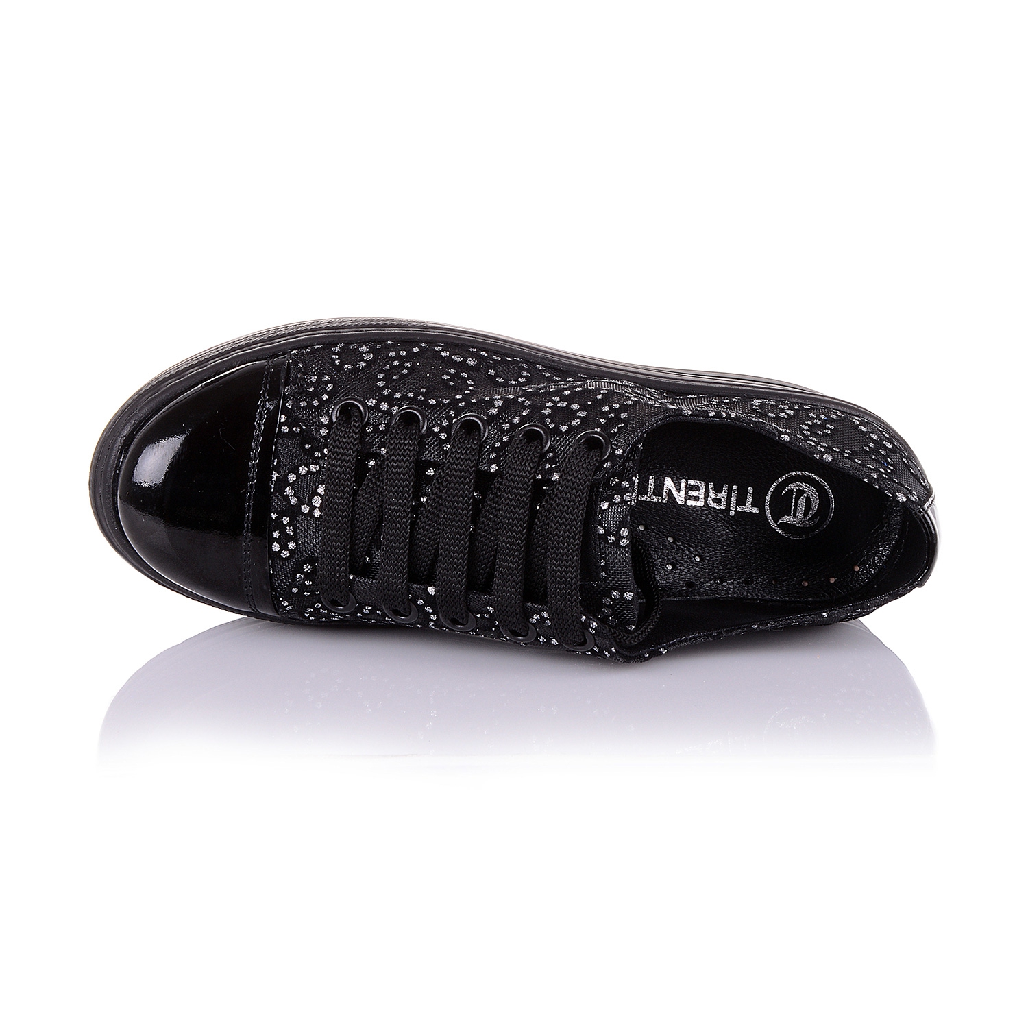 Модные кеды на высокой платформе- тренд нынешнего сезона. Отличное сочетание итальянского текстиля черного цвета с серебристым принтом, натуральной лаковой кожи на носке и широкой подошвы (высота 4см) придадут любому образу экстравагантности, будь то школьная форма или городской лук. Нога фиксируется с помощью шнуровки. Кожаная анатомическая стелька с твердым супинатором и мягкой прослойкой в пяточной части, поддержит свод стопы и поспособствует здоровому развитию мышц и мягкой походке. Подошва из термокаучука достаточно плотная, и легкая. Такие кеды- это стильно и комфортно!