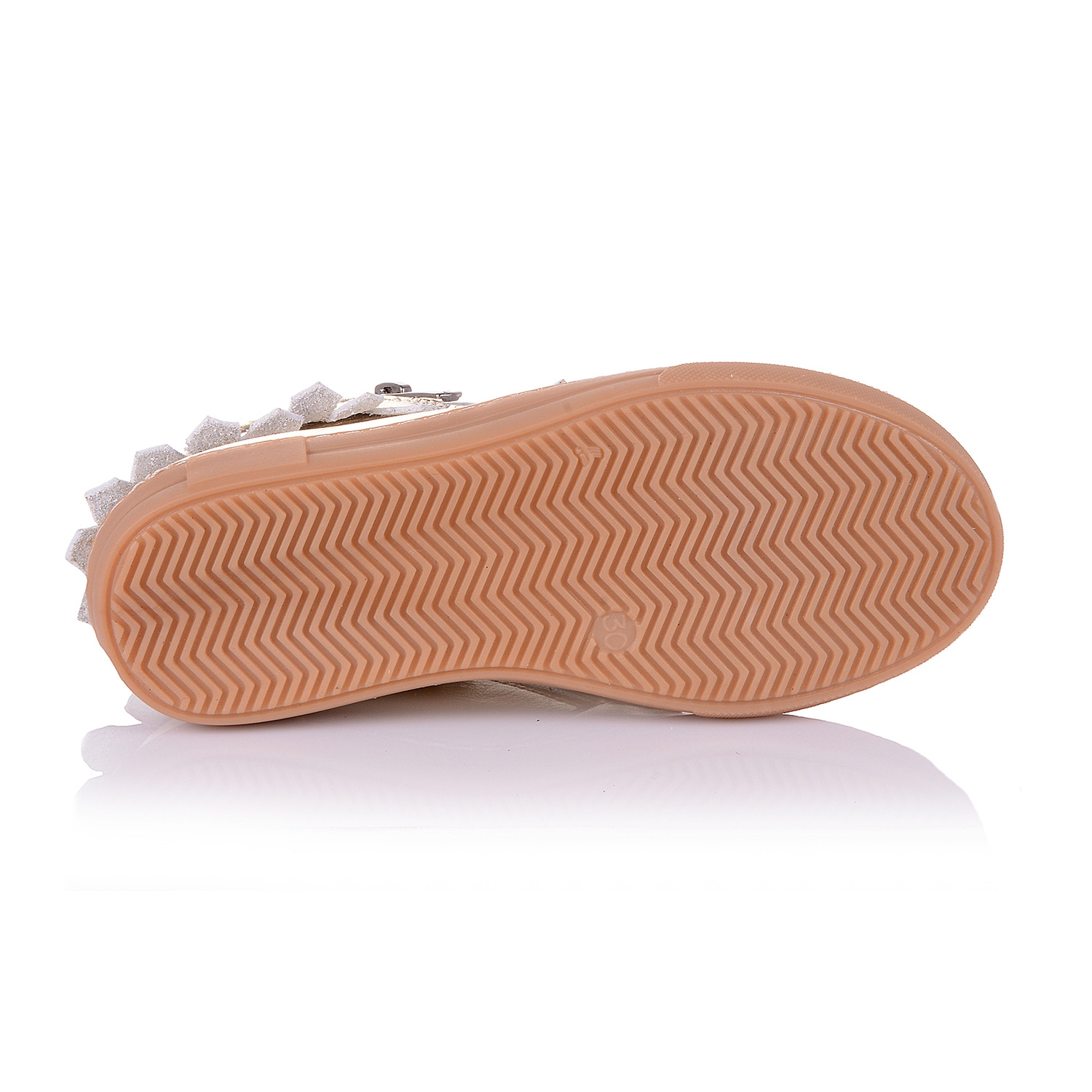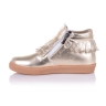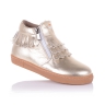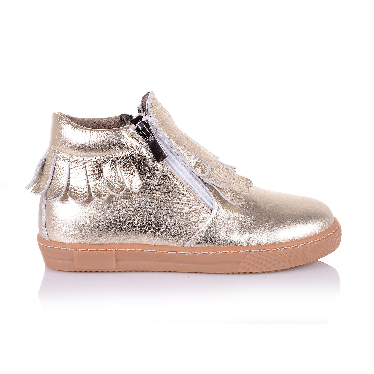 Модные ботинки для девочки на телесной подошве, выполнены из натуральной кожи золотистого цвета с глянцем. Украшением служит аккуратная бахрома, модель выглядит ярко и сразу бросается в глаза. Внутри- плотный флис. Удобная фиксация на две змейки поможет без труда надевать обувь быстро. Анатомическая стелька с твердым супинатором и мягкой прослойкой в пяточной части, поддержит свод стопы и поспособствует здоровому развитию мышц. О фиксации щиколотки позаботится жесткий задник. Подошва плотная из термокаучука, достаточно хорошо гнется. Экспериментируйте и создавайте самые красивые образы с обувью Тутуби.