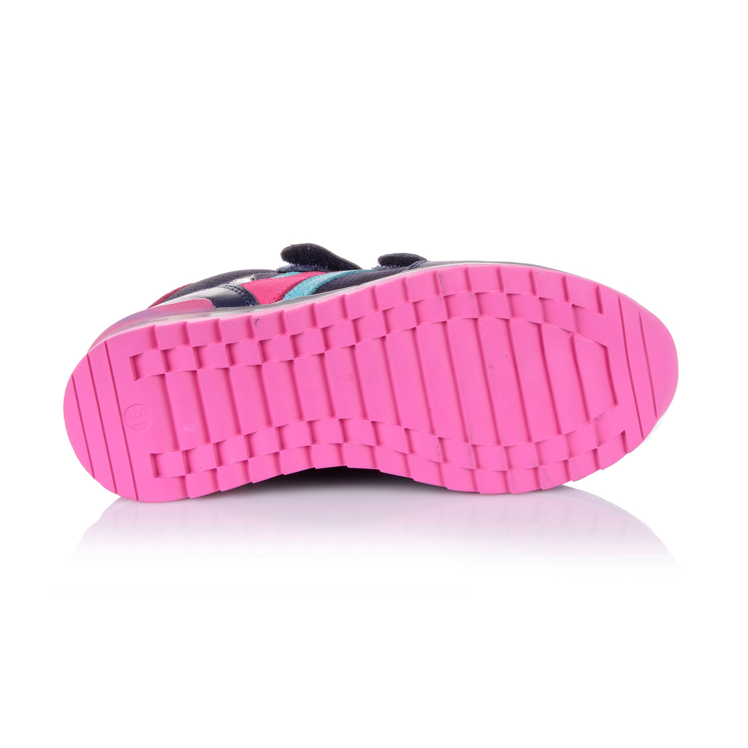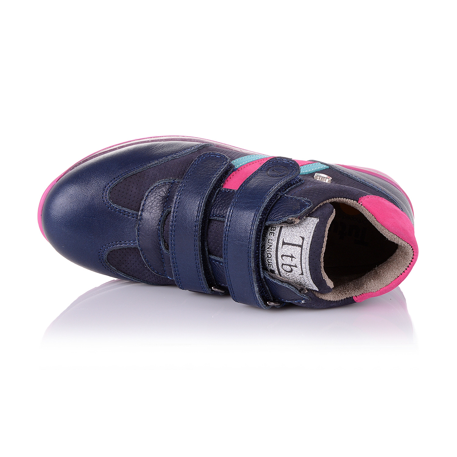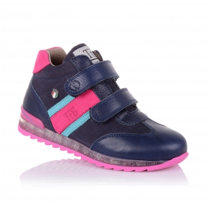 Стильные ботинки на ребристой подошве, выполнены из натуральной кожи темно-синего цвета и вставками из кожи розового и голубого цвета, выглядят ярко и сразу бросаются в глаза. Внутри- плотный флис. Удобная фиксация на две липучки позволяет подобрать обувь на ногу разной полноты и высоты свода. Анатомическая стелька с твердым супинатором и мягкой прослойкой в пяточной части, поддержит свод стопы и поспособствует здоровому развитию мышц. О фиксации щиколотки позаботится жесткий задник. Подошва плотная из термокаучука, достаточно хорошо гнется. Экспериментируйте и создавайте самые красивые образы с обувью Тутуби.