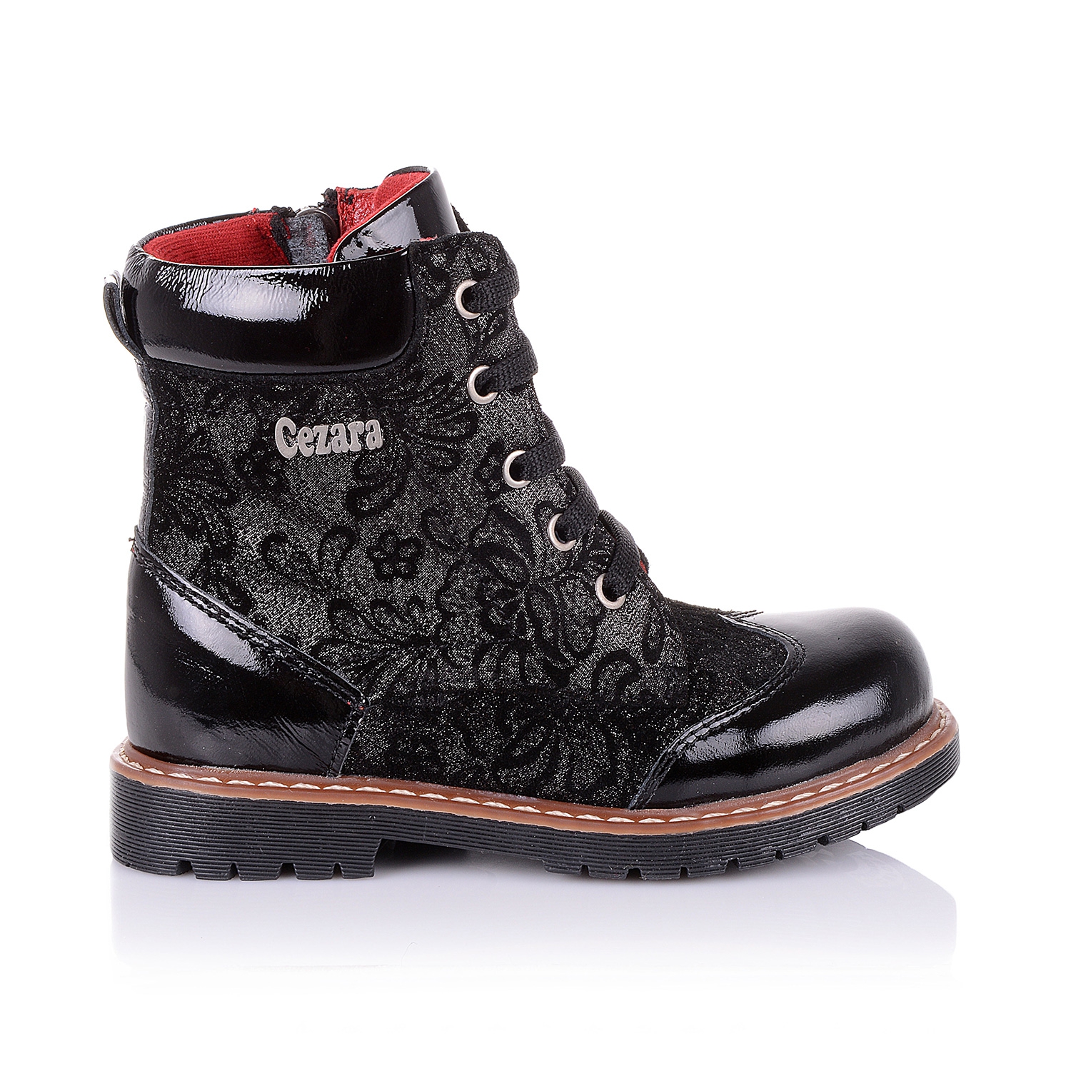 Шикарные и удобные ортопедические демисезонные ботинки на девочку- идеальны для города! Снаружи ботинки выполнены из натуральной лаковой кожи черного цвета со вставками из натурального нубука с принтом под гепюр, внутри- плотная мягкая байка. Надевать такие ботинки - секундное дело, ведь помимо шнурков в них есть ещё и молния сбоку. Каблук Томаса с удлиненным внутренним краем обеспечит правильную постановку ноги. Анатомическая стелька с супинатором поддержит свод стопы и поспособствует здоровому развитию мышц. О фиксации голенища и щиколотки позаботятся укрепленные берцы и жесткий задник. А хрупкие суставы будут защищены от чрезмерных нагрузок благодаря амортизационной вставке. Не отказывайте своему сокровищу носить правильную ортопедическую обувь класса премиум+.