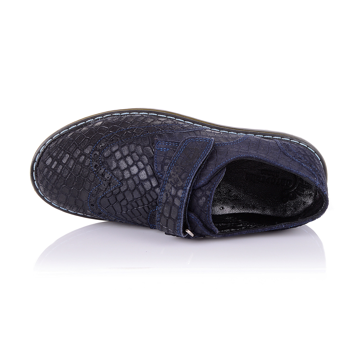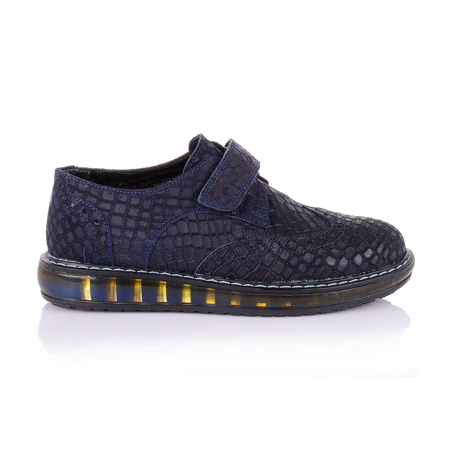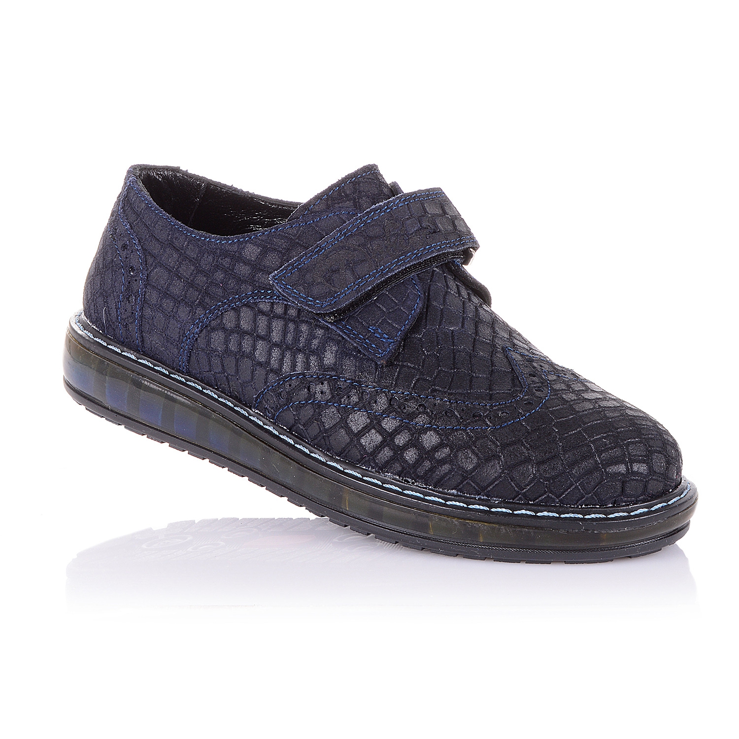 Супер-стильные туфли-брогги актуальны как к городскому образу, так и к школьной форме. Модель оригинальна сочетанием прозрачной подошвы с верхом из тисненного нубука. Выполнены туфли из натурального нубука темно-синего цвета снаружи, внутри гладкая натуральная кожа. Нога удобно фиксируется липучкой. Анатомическая стелька с твердым супинатором и мягкой прослойкой в пяточной части, поддержит свод стопы и поспособствует здоровому развитию мышц и мягкой походке. О фиксации щиколотки позаботится жесткий задник. Подошва плотная из термокаучука не скользит и хорошо амортизирует при походке. Любители экстравагантной классики оценят данную модель по достоинству. Рекомендовано украинскими ортопедами.