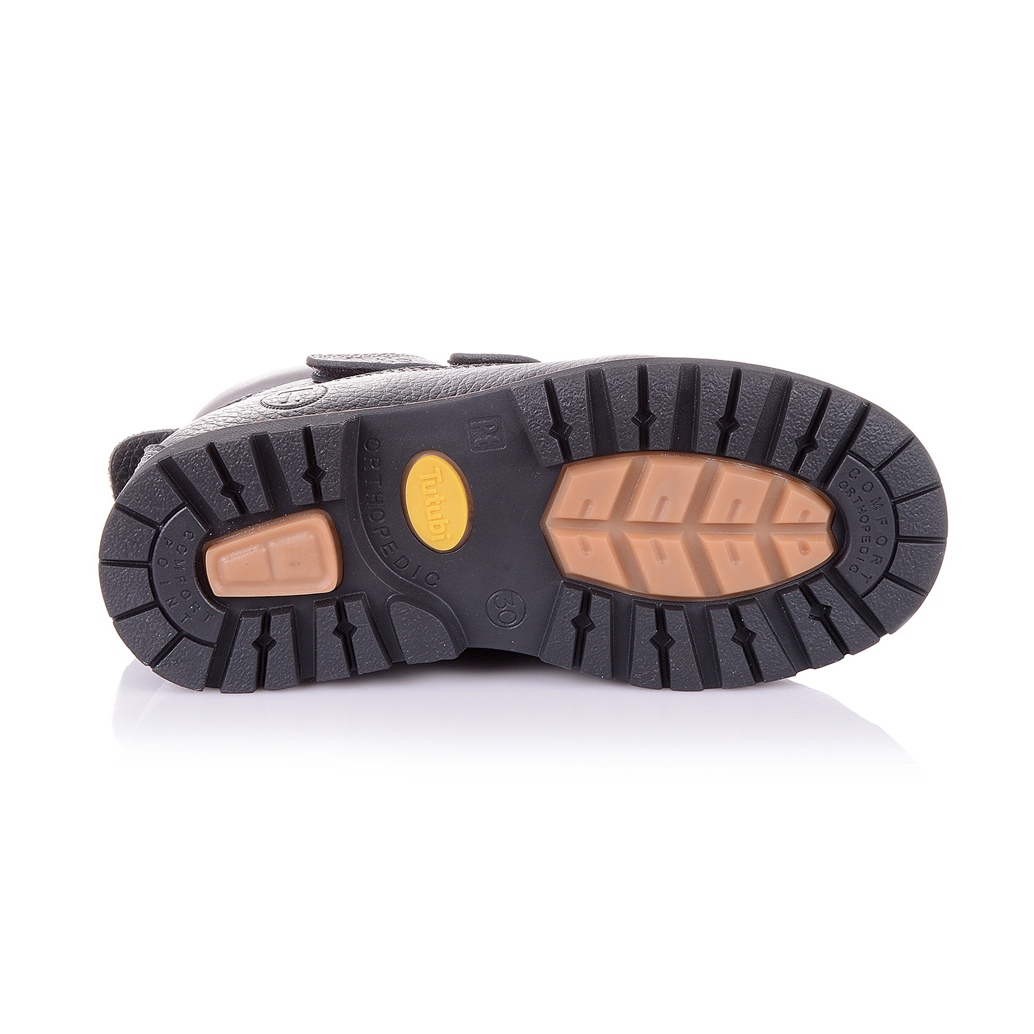 Практичные и удобные ортопедические ботинки- идеальны для города! Снаружи ботинки выполнены из натуральной кожи (имеет заводское водоотталкивающее покрытие) черного цвета, внутри- плотный флис. Удобная фиксация на две липучки позволяет подобрать обувь на ногу разной полноты и высоты свода. Каблук Томаса с удлиненным внутренним краем обеспечит правильную постановку ноги. Анатомическая стелька с супинатором поддержит свод стопы и поспособствует здоровому развитию мышц. О фиксации голенища и щиколотки позаботятся укрепленные берцы и жесткий задник. А хрупкие суставы будут защищены от чрезмерных нагрузок благодаря амортизационной вставке и высокому протектору на подошве. Не отказывайте своему сокровищу носить правильную ортопедическую обувь класса премиум+.