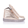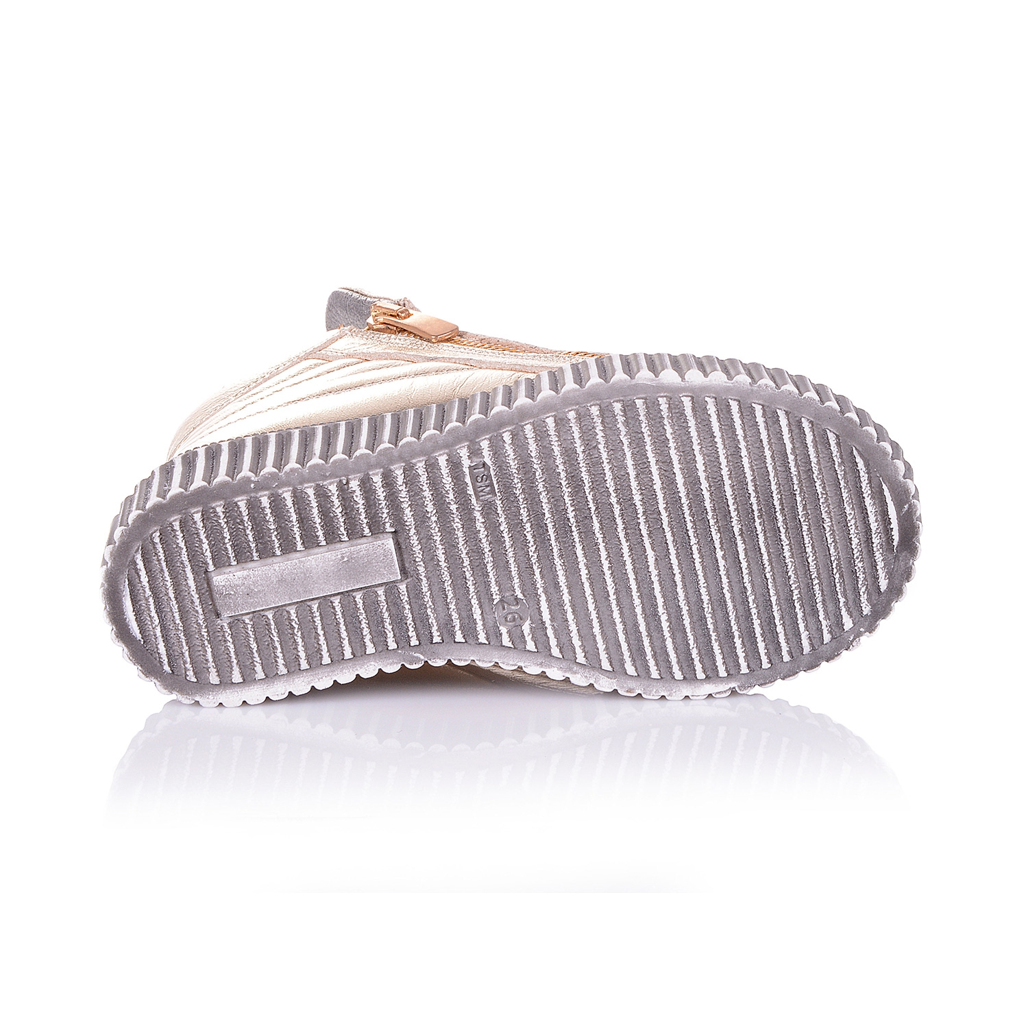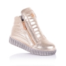 Модные ботинки на широкой подошве, выполнены из натуральной кожи золотистого цвета с отстрочкой- модель выглядит ярко и сразу бросается в глаза. Внутри- плотный флис. Удобная фиксация на змейку поможет без труда надевать обувь быстро. Кожаная анатомическая стелька с твердым супинатором и мягкой прослойкой в пяточной части, поддержит свод стопы и поспособствует здоровому развитию мышц. О фиксации щиколотки позаботится жесткий задник. Подошва плотная из термокаучука, достаточно хорошо гнется. Экспериментируйте и создавайте самые красивые образы с обувью X-Kids.