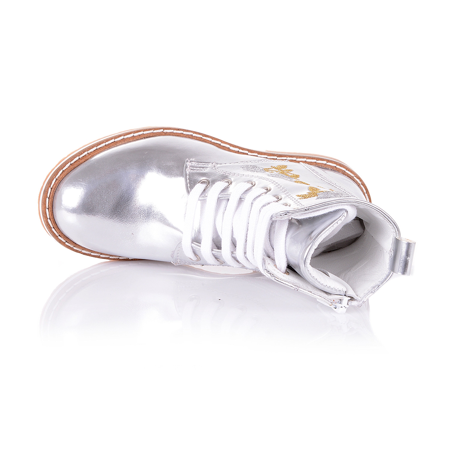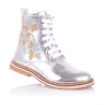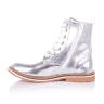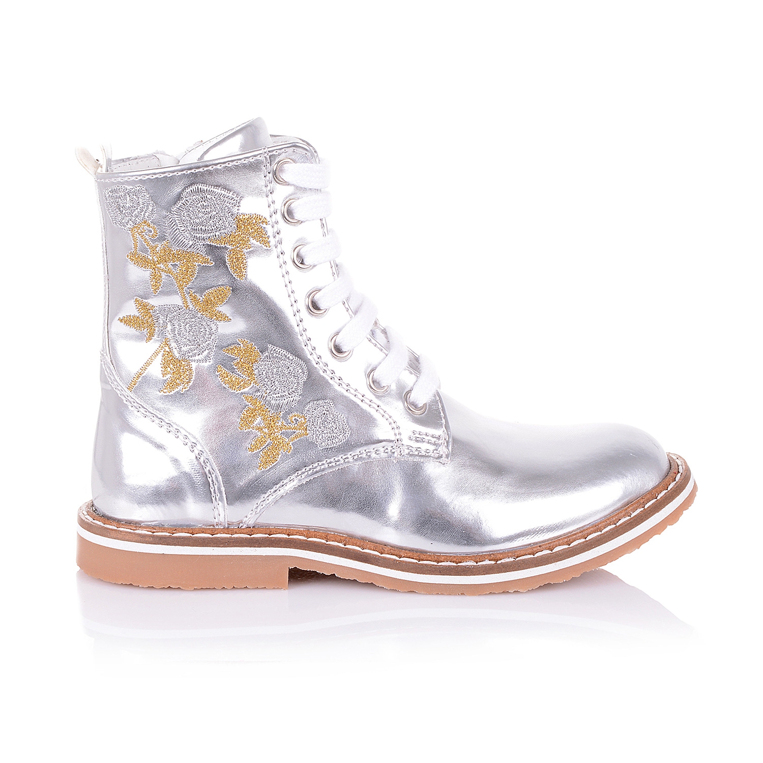 Шикарные ботинки из натуральной лаковой кожи серебристого цвета с вышивкой. Внутренняя мягкая кожаная стелька "SOFT EFFECT" с супинатором и твердый задник обеспечивают физиологически правильное положение ножки. Надевать такие ботинки - секундное дело, ведь помимо шнурков в них есть ещё и молния сбоку. Подошва износостойкая из термокаучука, обеспечивает амортизацию, комфортную походку и хорошее сцепление с твердой поверхностью. Обувь такого качества и дизайна приковывает взгляды!