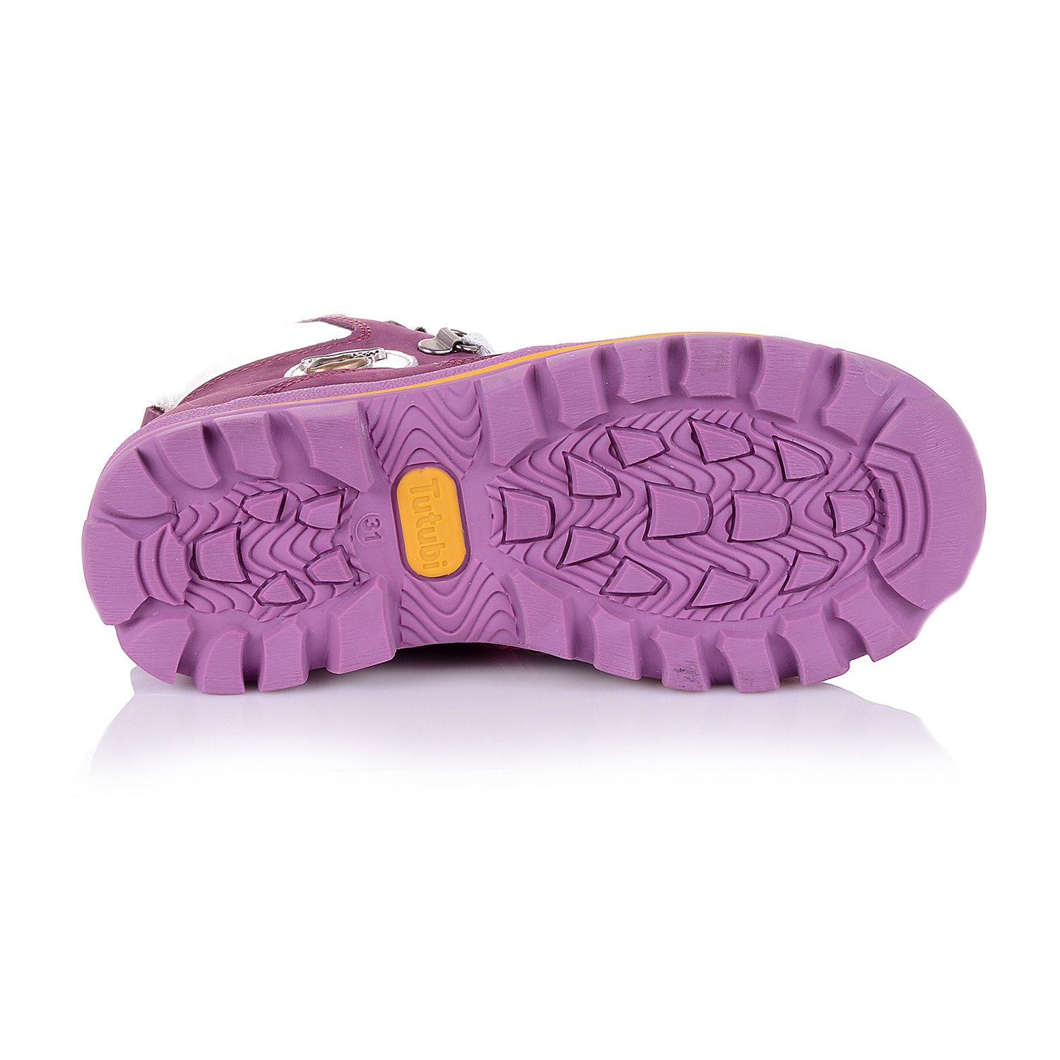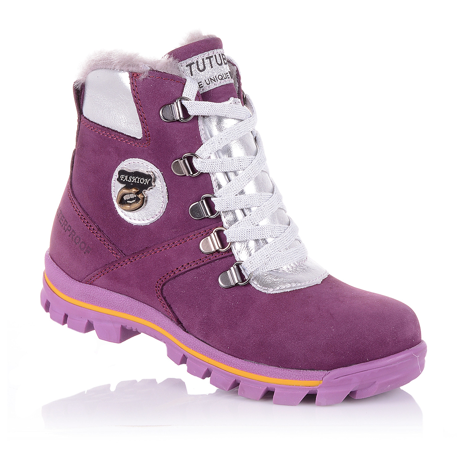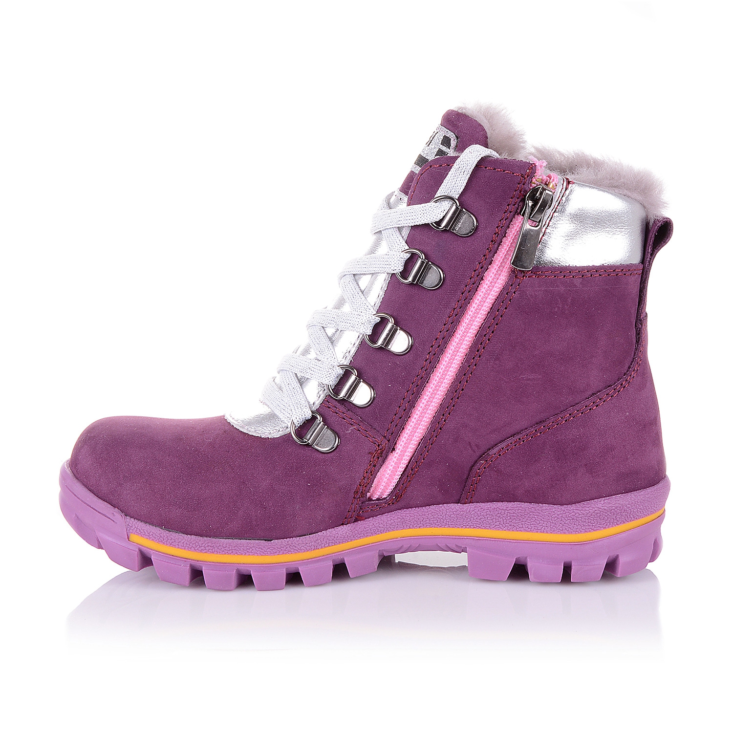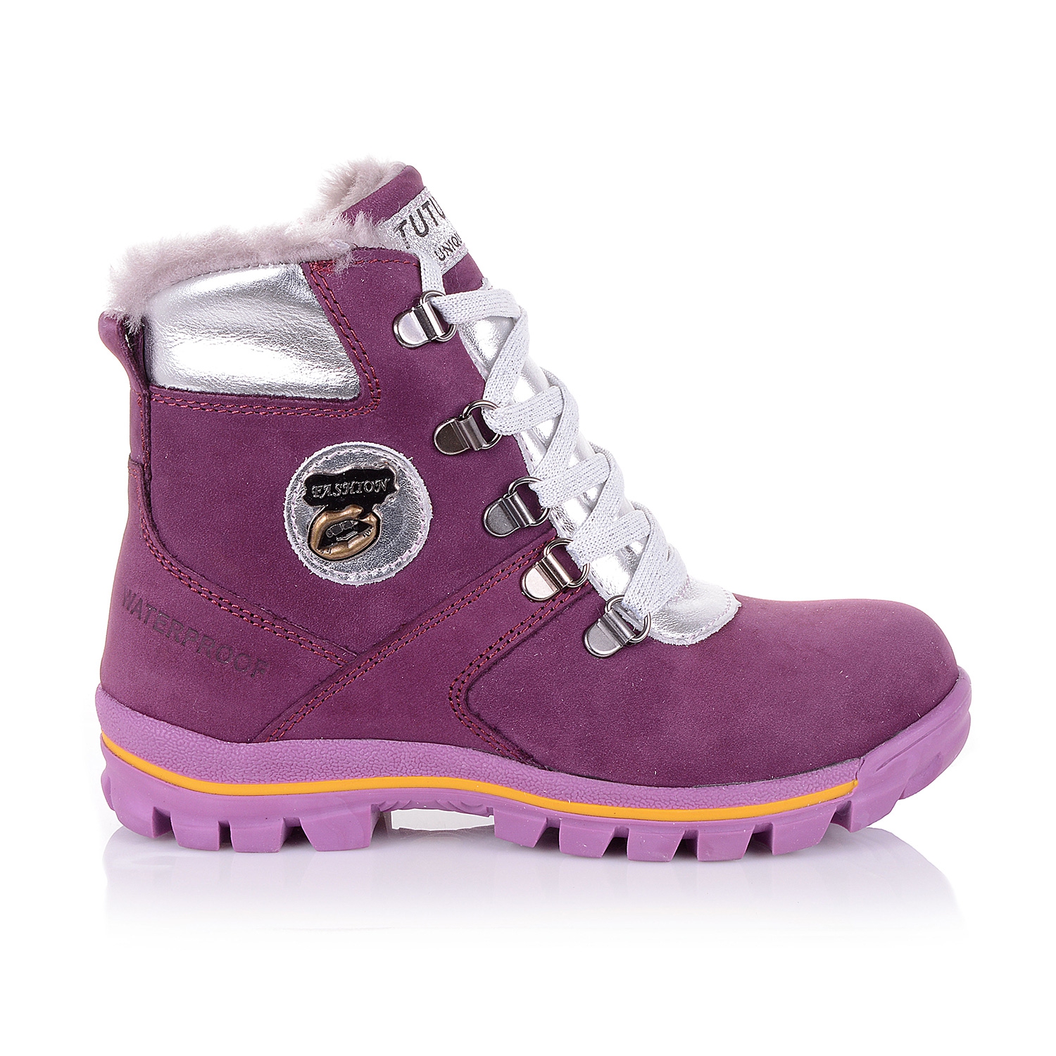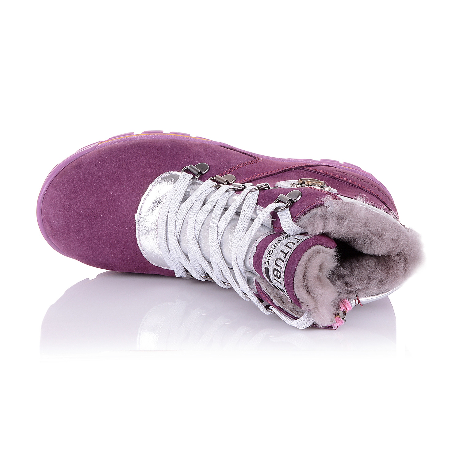 Очень красивые и аккуратные ботинки сезон зима. Снаружи ботинки выполнены из натурального нубука фиолетового цвета. Высокий сплошной язычок защищает от попадания снега и влаги. Надевать такие ботинки - секундное дело, ведь помимо шнурков в них есть ещё и молния сбоку. Анатомическая стелька с супинатором поддержит свод стопы и поспособствует здоровому развитию мышц. О фиксации голенища и щиколотки позаботятся укрепленные берцы и жесткий задник. А хрупкие суставы будут защищены от чрезмерных нагрузок благодаря амортизации термопластичной тракторной подошвы. В такой обуви класса премиум +, ребенок будет чувствовать себя удобно и эксклюзивно.