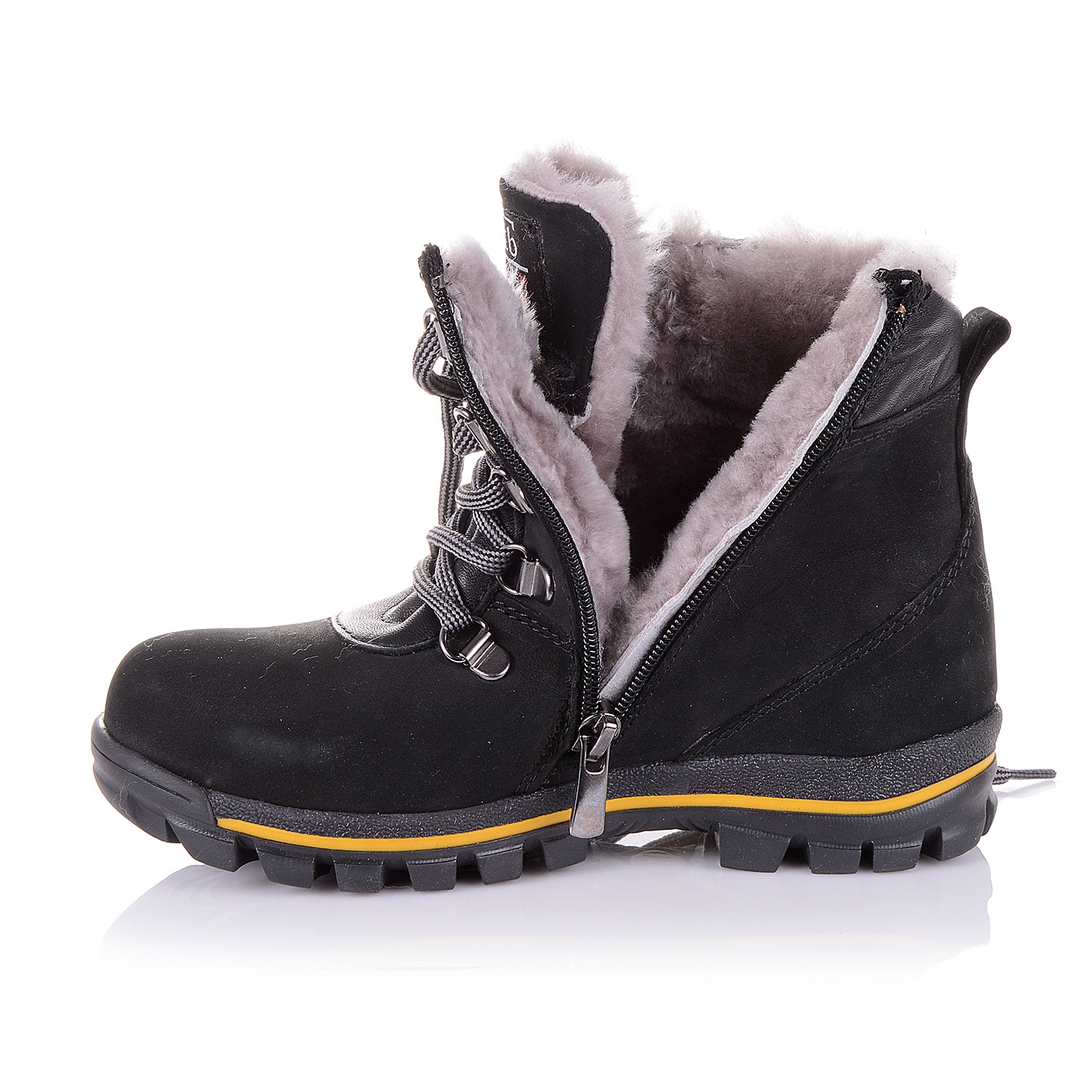 Практичные и аккуратные ботинки сезон зима. Снаружи ботинки выполнены из натурального нубука черного цвета. Высокий сплошной язычок защищает от попадания снега и влаги. Надевать такие ботинки - секундное дело, ведь помимо шнурков в них есть ещё и молния сбоку. Анатомическая стелька с супинатором поддержит свод стопы и поспособствует здоровому развитию мышц. О фиксации голенища и щиколотки позаботятся укрепленные берцы и жесткий задник. А хрупкие суставы будут защищены от чрезмерных нагрузок благодаря амортизации термопластичной тракторной подошвы. В такой обуви класса премиум +, ребенок будет чувствовать себя удобно и эксклюзивно.