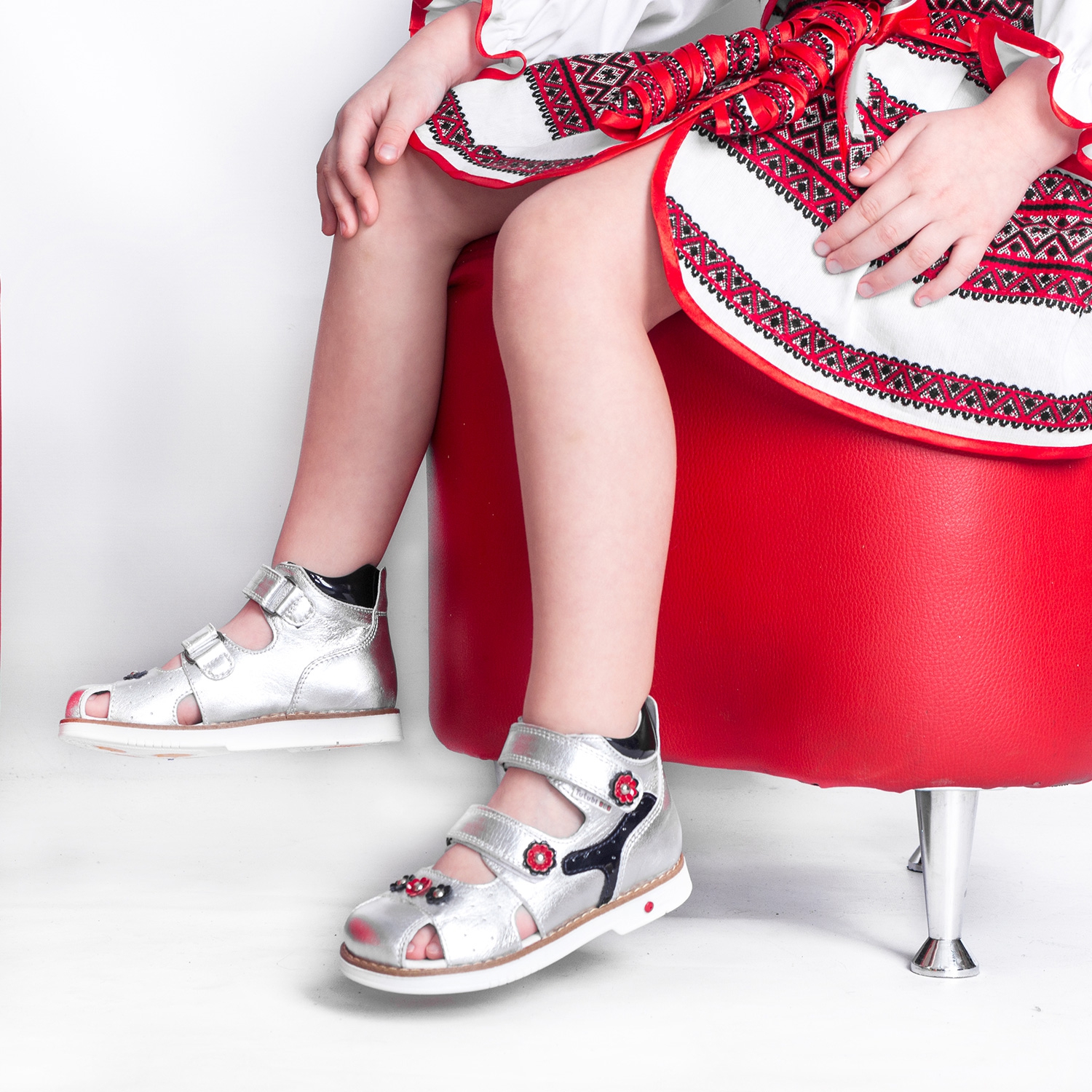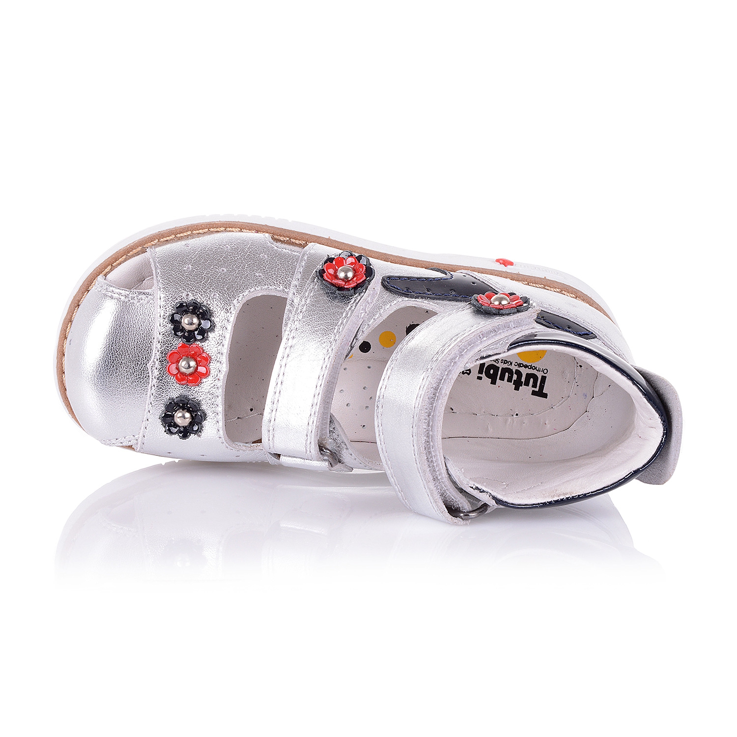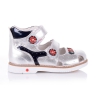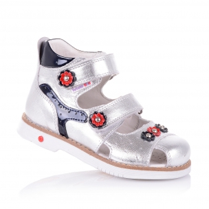 Закрытые ортопедические босоножки серебристого цвета из натуральной кожи- ультрамодная модель. Удобная фиксация двумя липучками позволяет подобрать босоножки на ногу разной полноты и высоты свода. Кожаная стелька с супинатором и твердый задник обеспечивают физиологически правильное положение ножки. Подошва, износостойкая из термокаучука, со скошенным каблуком Томаса и антишоковыми вставками, которые снимают ударную нагрузку на пяточную кость. В обуви такого качества ваш ребенок будет чувствовать себя уверенно и комфортно!