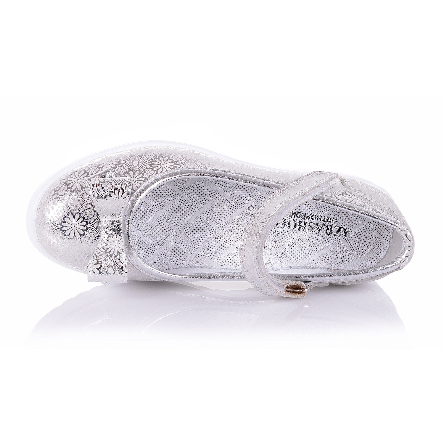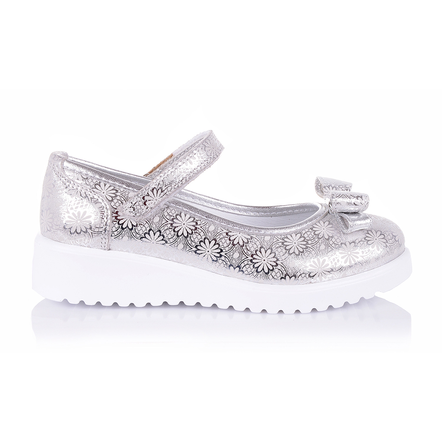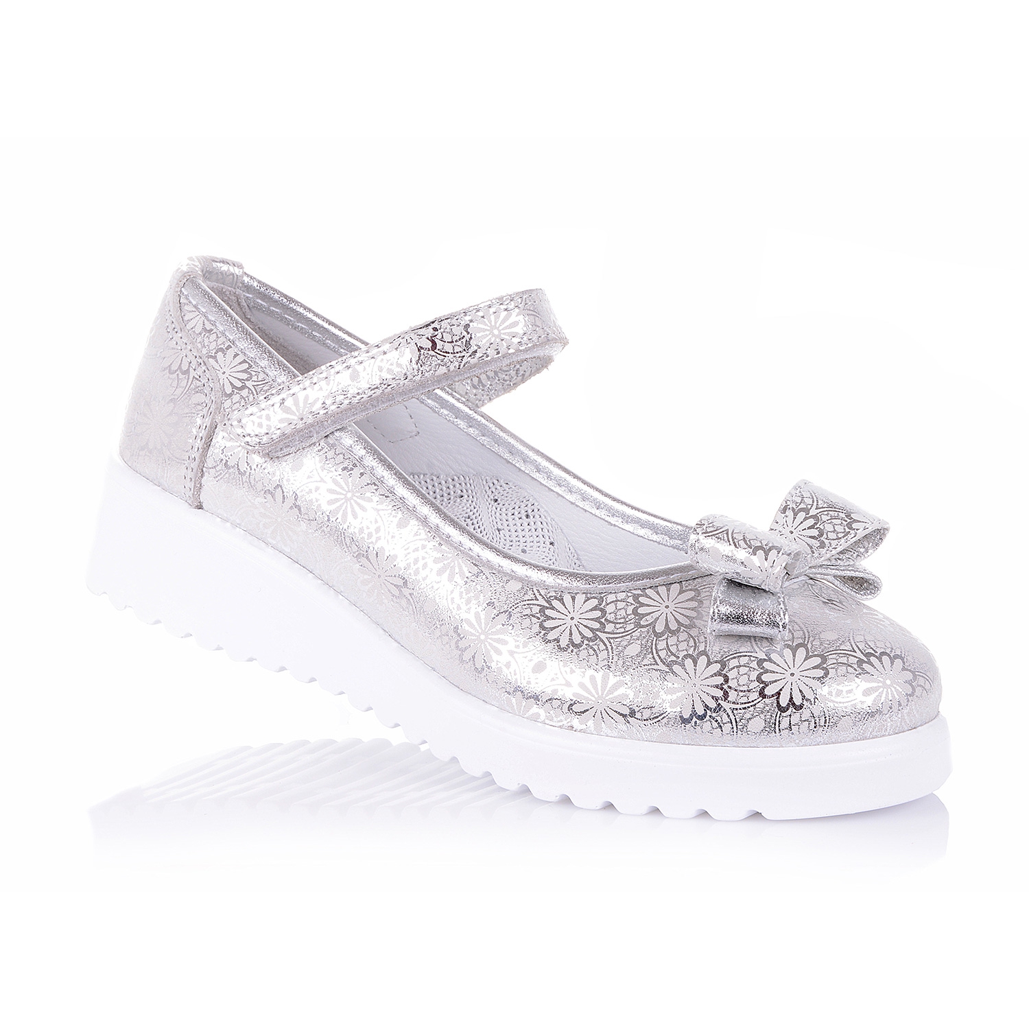 Стильная новинка- ортопедические туфли на девочку из эксклюзивного серебристого нубука с тиснением. Внутренняя мягкая кожаная стелька "SOFT EFFECT" с супинатором и твердый задник обеспечивают физиологически правильное положение ноги, а удобная фиксация на липучку позволит выбрать обувь на ногу разной полноты и высоты свода. Подошва, износостойкая из термокаучука. Эти туфли станут неотьемлемой частью гардероба вашего ребенка, а трендовое сочетание матового верха обуви с широкой подошвой создаст самый стильный образ!