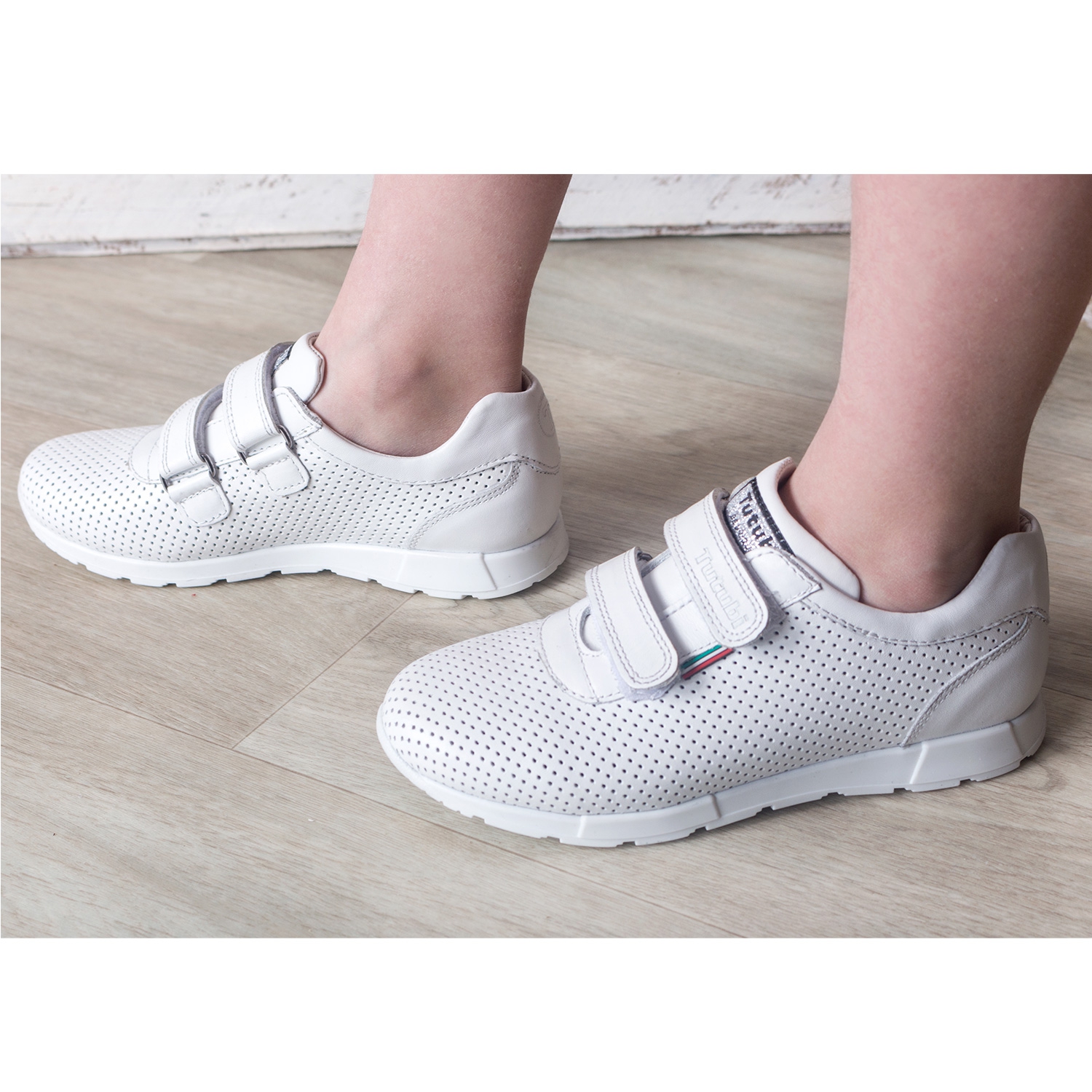 Прекрасная альтернатива закрытым босоножкам- перфорированные насквозь кроссовки на ребристой подошве, выполнены из натуральной кожи белого цвета. Внутренняя мягкая кожаная стелька "SOFT EFFECT" с супинатором и твердый задник обеспечивают физиологически правильное положение ноги, а удобная фиксация на две липучки позволит выбрать обувь на ногу разной полноты и высоты свода. Анатомическая износостойкая подошва из термокаучука, очень мягкая и амортизирует, обеспечивая комфортную походку. Обувь прочная и качественная подходит на сезон весна-лето.