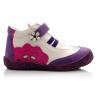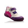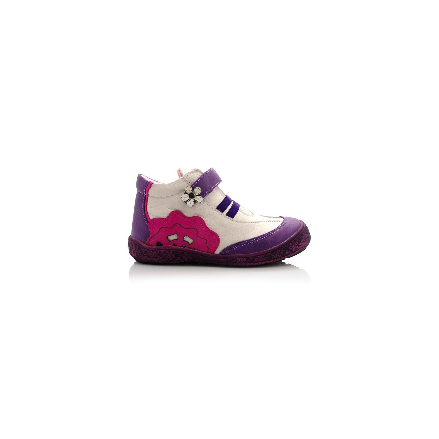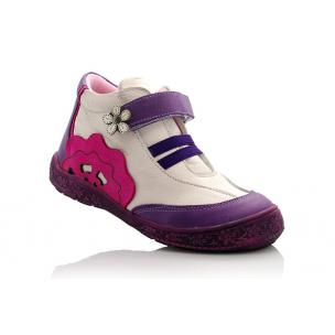 Ботинки Perlina сиренево-белого цвета с розовой вставкой. Снизу фиксируются двумя резиночками, сверху на липучке. Снаружи кожаные, внутри - флис. Есть твердая пятка и супинатор.