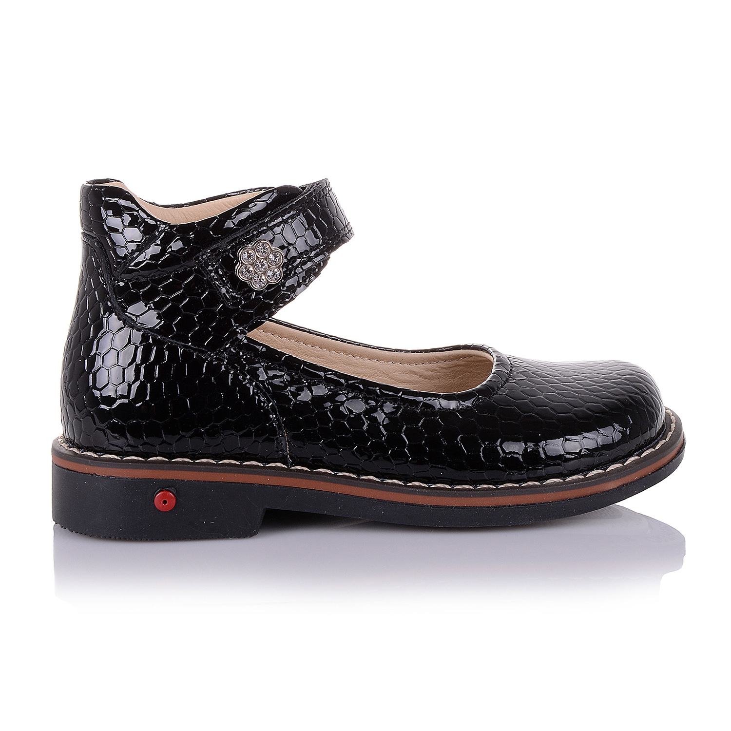 Шикарные ортопедические туфли из натуральной лаковой кожи черного цвета с принтом под питона, станут идеальным дополнением к образу вашей модницы! Внутренняя часть выполнена в бежевой коже, внешняя часть- из натуральной лаковой кожи. Удобная фиксация на липучку позволяет подобрать туфли на ногу разной полноты и высоты свода. Каблук Томаса с удлиненным внутренним краем обеспечит правильную постановку ноги. Анатомическая стелька с супинатором поддержит свод стопы и поспособствует здоровому развитию мышц. О фиксации голенища и щиколотки позаботятся укрепленные берцы и жесткий задник. А хрупкие суставы будут защищены от чрезмерных нагрузок благодаря амортизационной вставке. Одевая такую пару обуви, Ваш ребенок будет чувствовать себя комфортно и эксклюзивно. Соответствие размера: большемерят (возьмите на размер меньше).