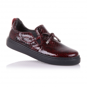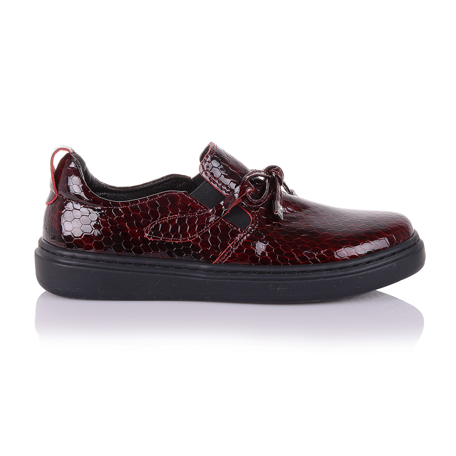 Стильные и универсальные мокасины, с которыми можно создать огромное количество образов. Обувь выполнена из натуральной лаковой кожи бордового цвета с супер-оригинальной лазерной отделкой под питона, украшена бантиком. Нога отлично фиксируется резинкой, что позволяет подобрать обувь на ногу разной полноты и высоты свода. Внутренняя часть выполнена в коже, внешняя часть- из натуральной лаковой, очень мягкой кожи. Кожаная анатомическая стелька с твердым супинатором поддержит свод стопы и поспособствует здоровому развитию мышц и мягкой походке. Подошва плотная из термокаучука. Эти мокасины станут неотьемлемой частью гардероба вашего ребенка.