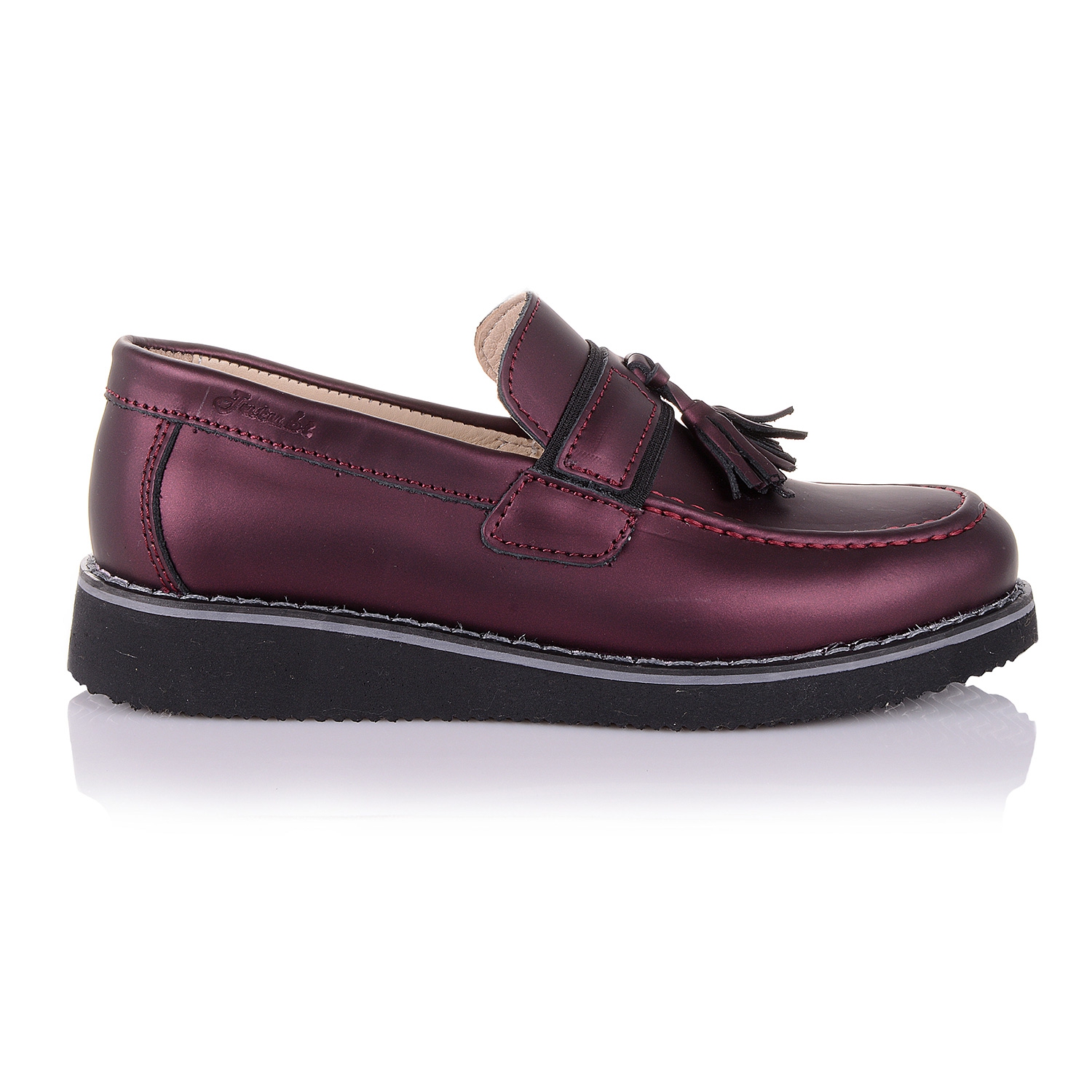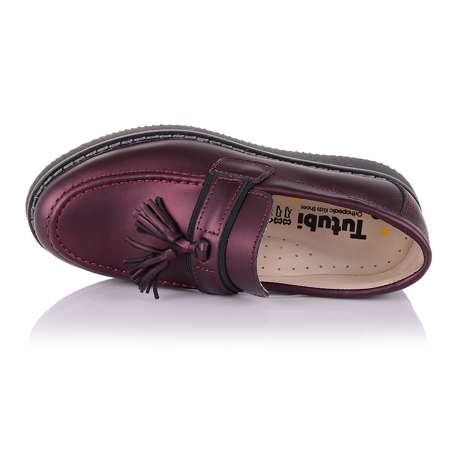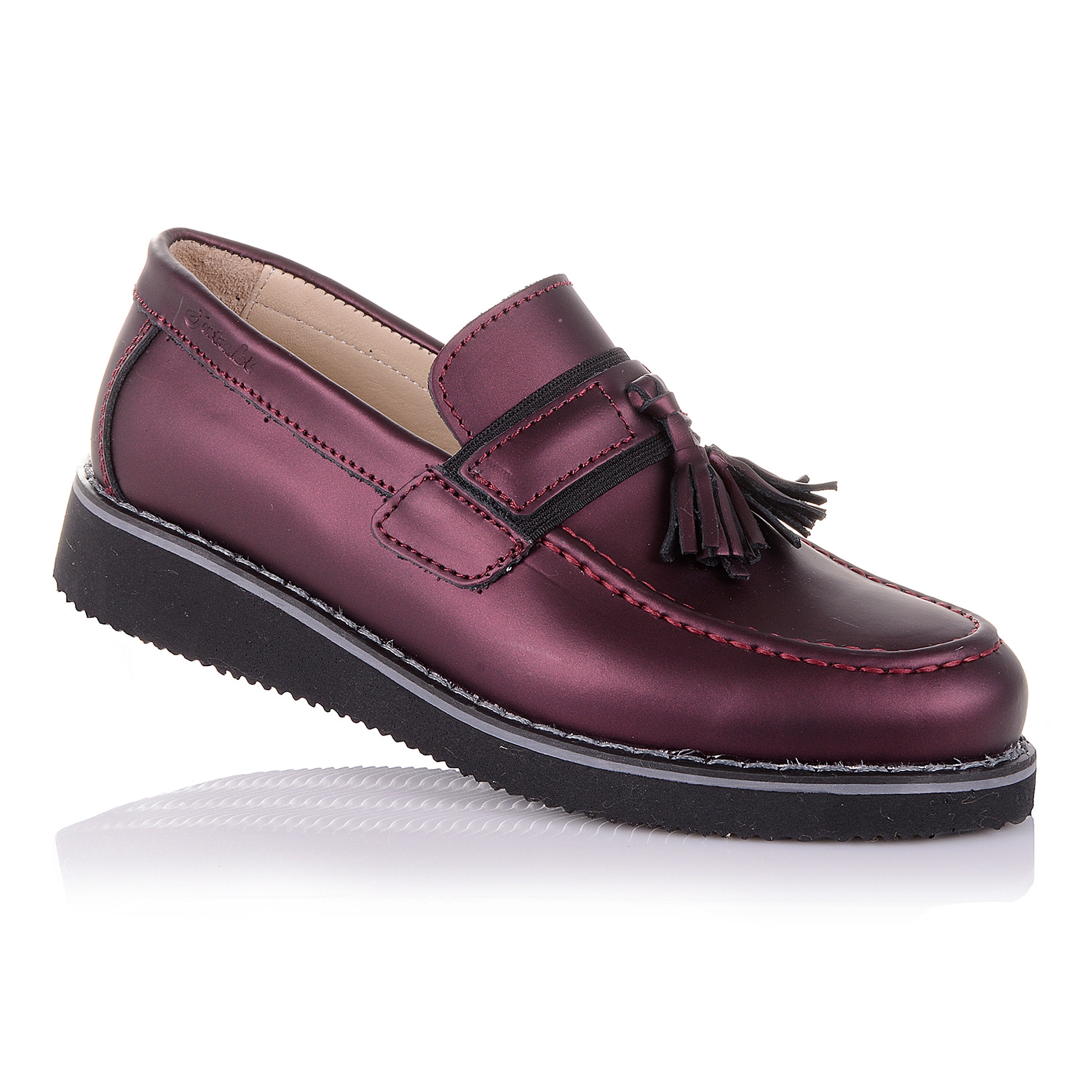 Стильные туфли лоферы с кисточками это великолепный образчик классического стиля с вплетением модных тенденций, что вместе создало гармоничную и красивую модель. Обувь выполнена из натуральной матовой кожи бордового цвета. Контрастная анатомическая стелька с твердым супинатором и мягкой прослойкой в пяточной части, поддержит свод стопы и поспособствует здоровому развитию мышц и мягкой походке. О фиксации щиколотки позаботится жесткий задник. Подошва плотная из термокаучука отлично амортизирует при походке. Позвольте вашему ребенку роскошь носить качественную ортопедическую обувь, привлекая восторженные взгляды окружающих.