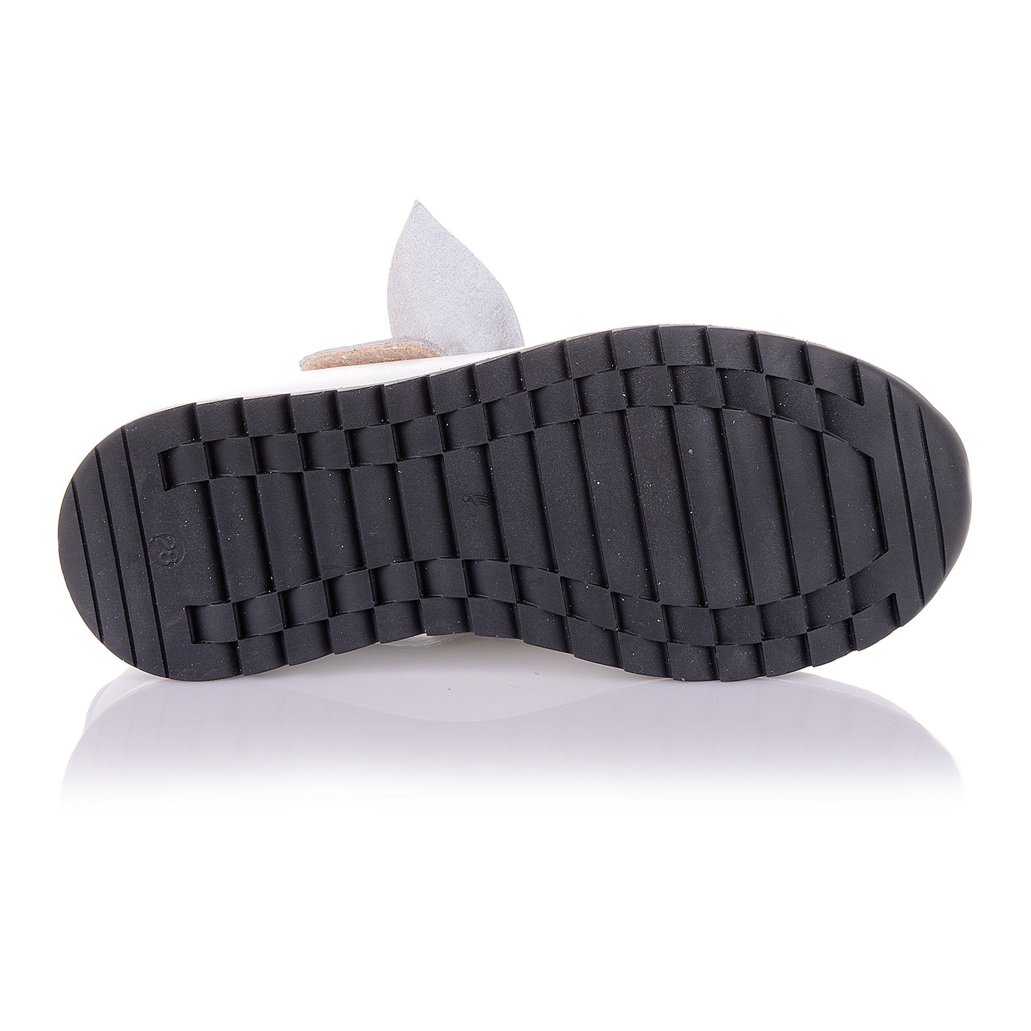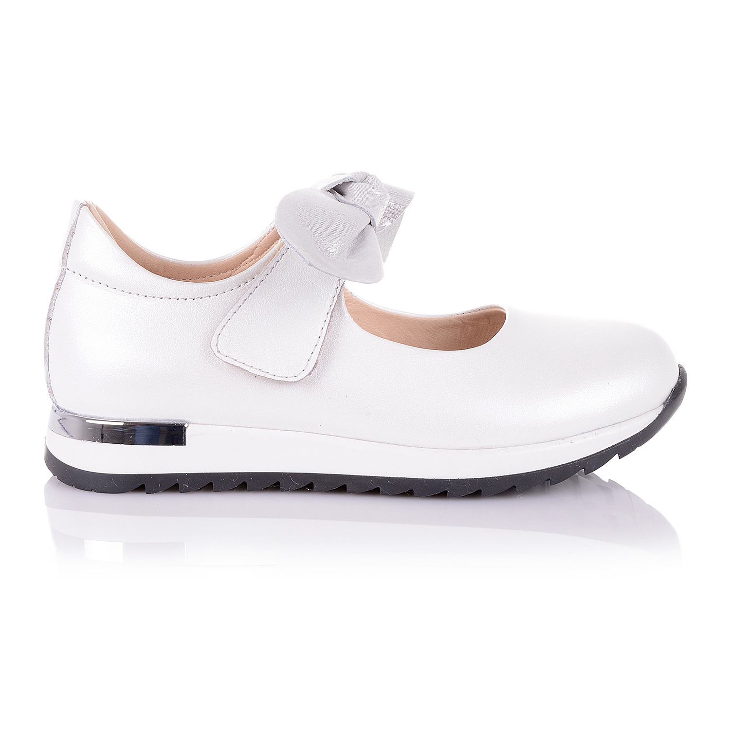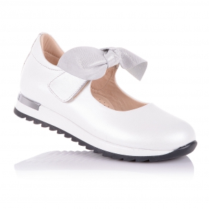 Супер-стильные туфли на кроссовочной подошве- оригинальный симбиоз удобства и красоты! Туфли выполнены из натуральной кожи белого цвета с большим серебристым бантом, подойдут практически под любой гардероб. Нога фиксируется липучкой. Внутренняя мягкая кожаная стелька "SOFT EFFECT" с супинатором и твердый задник обеспечивают физиологически правильное положение ножки. Подошва износостойкая из термокаучука, обеспечивает амортизацию, комфортную походку и хорошее сцепление с твердой поверхностью. Обувь такого качества и дизайна приковывает взгляды!