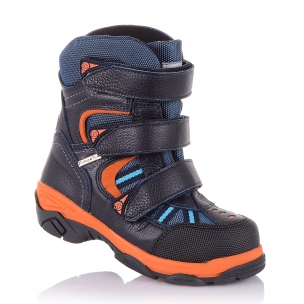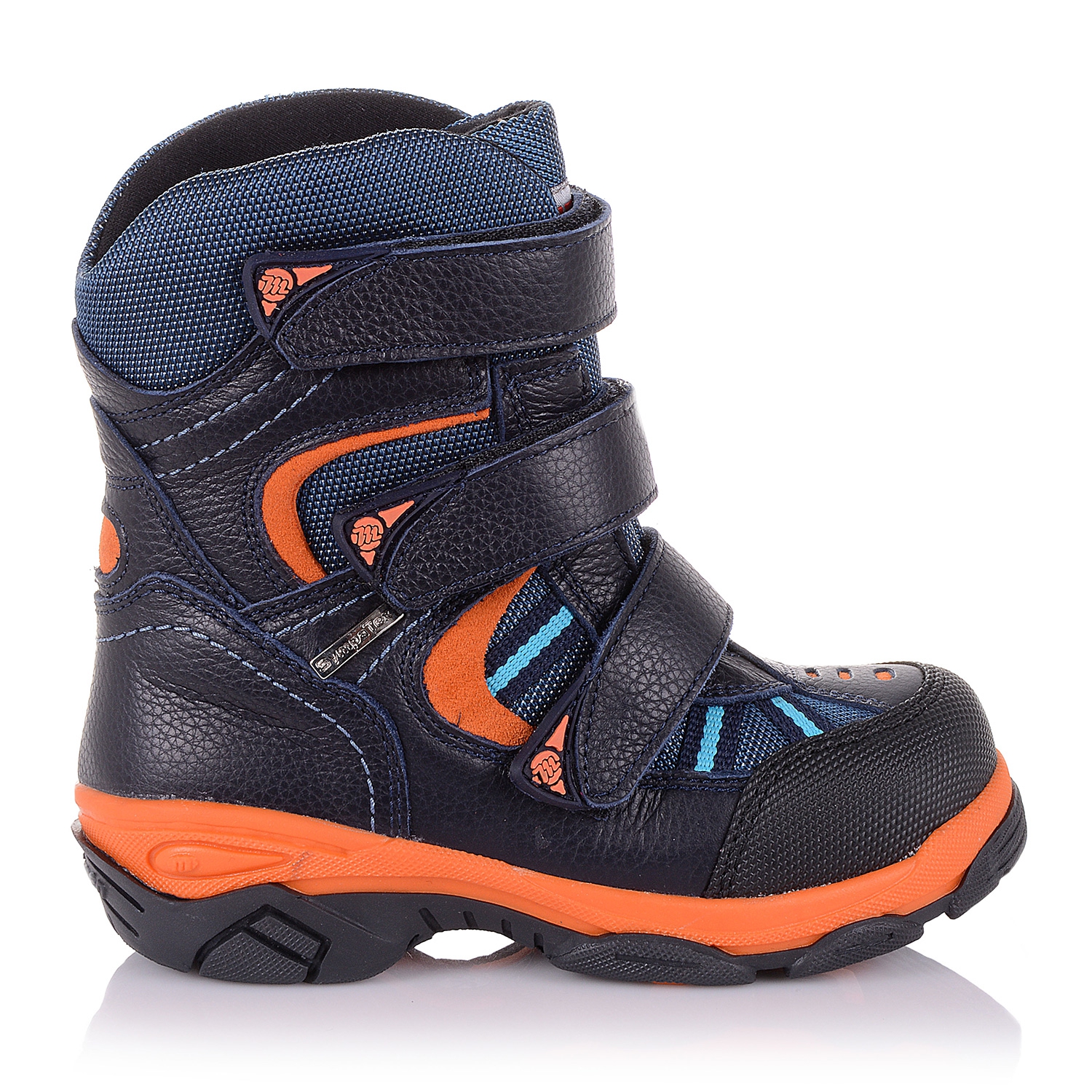 Термоботинки фирмы Minimen темно-синего цвета из натуральной кожи со вставками из мембранного текстиля, защитят от влаги и согреют в холодную погоду ножки ребенка! Подошва из термопласта, дополнительно прошита, разработана специально для холодного времени года, не скользит по мокрой поверхности за счет специальной ребристой подошвы. Закрытый язык с усиленной губкой и фиксация тремя липучками значительно понижает вероятность попадания воды внутрь. Носок - прорезиненный. Температурный режим до -30. Внутри: анатомическая стелька, утеплитель- теплый войлок. Кожа снаружи хромового дубления, а мембранная ткань GORE-TEX не промокает, но помогает ноге "дышать". Усилены носок и пятка для поддержания стопы в правильном положении (препятствует развитию плоскостопия). При выборе ортопедической и ортопрофилактической обуви очень важна уверенность в качестве, ведь Ваш ребенок достоин самого лучшего. Рекомендовано по всем показателям ортопедами!