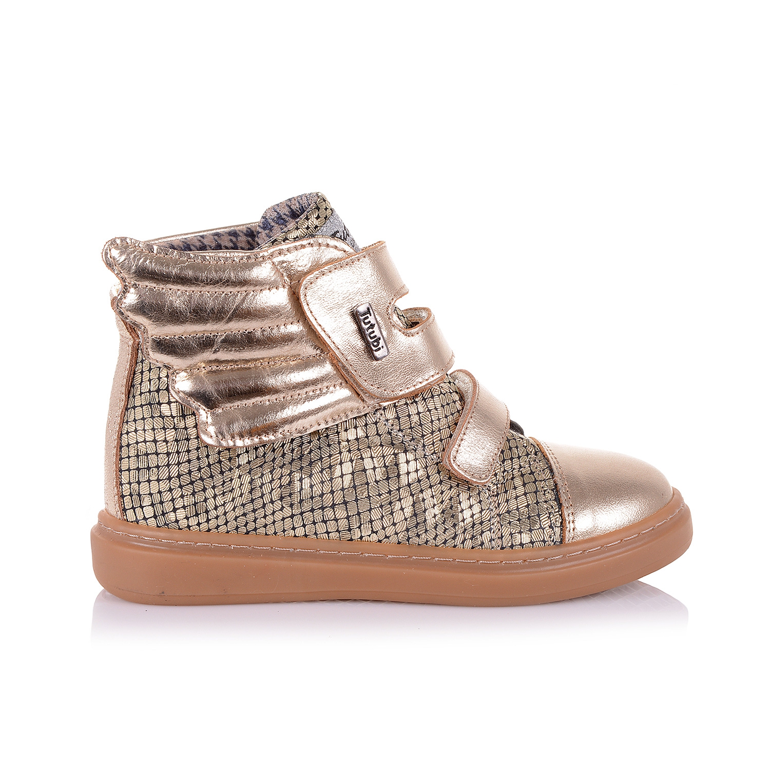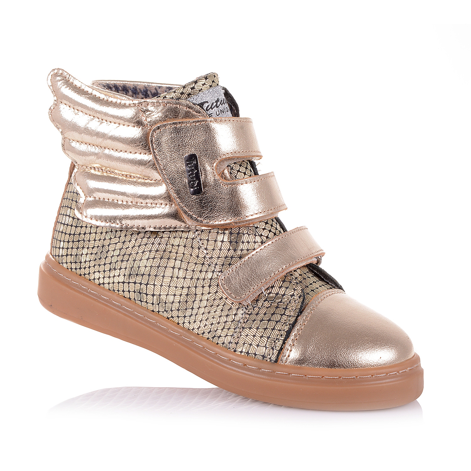 Шикарные демисезонные ботинки сезон осень 2017г. для незабываемого образа Вашей модницы. Ботинки выполнены из натуральной кожи золотистого цвета. Небольшое крыло придает образу оригинальности. Фиксация двумя липучками. Анатомическая стелька с супинатором поддержит свод стопы и поспособствует здоровому развитию мышц, а твердый задник обеспечивают физиологически правильное положение ножки. В такой обуви класса премиум +, ребенок будет чувствовать себя эксклюзивно!