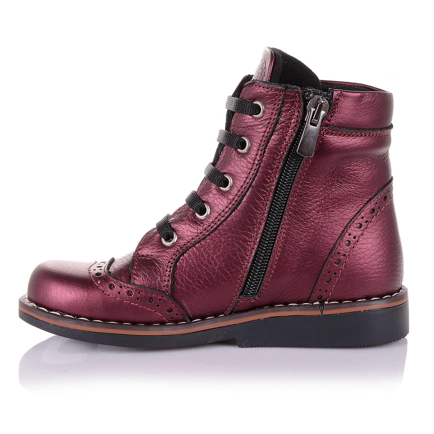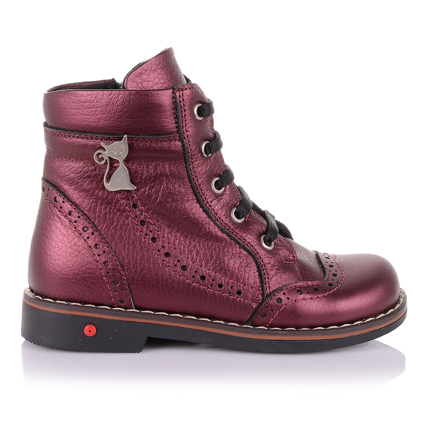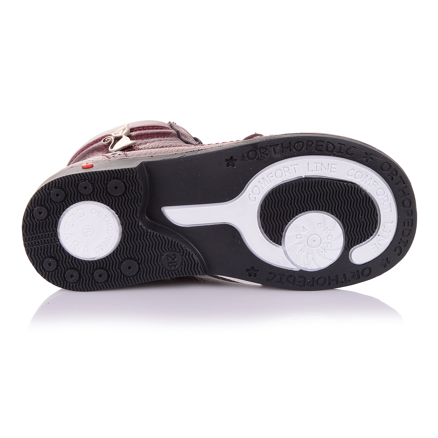 Шикарные и удобные ортопедические демисезонные ботинки на девочку- идеальны для города! Снаружи ботинки выполнены из натуральной кожи бордового цвета с отливом, внутри- плотный флис. Надевать такие ботинки - секундное дело, ведь помимо шнурков в них есть ещё и молния сбоку. Каблук Томаса с удлиненным внутренним краем обеспечит правильную постановку ноги. Анатомическая стелька с супинатором поддержит свод стопы и поспособствует здоровому развитию мышц. О фиксации голенища и щиколотки позаботятся укрепленные берцы и жесткий задник. А хрупкие суставы будут защищены от чрезмерных нагрузок благодаря амортизационной вставке. Обувь одобрена ортопедами! Не отказывайте своему сокровищу носить правильную ортопедическую обувь класса премиум+.