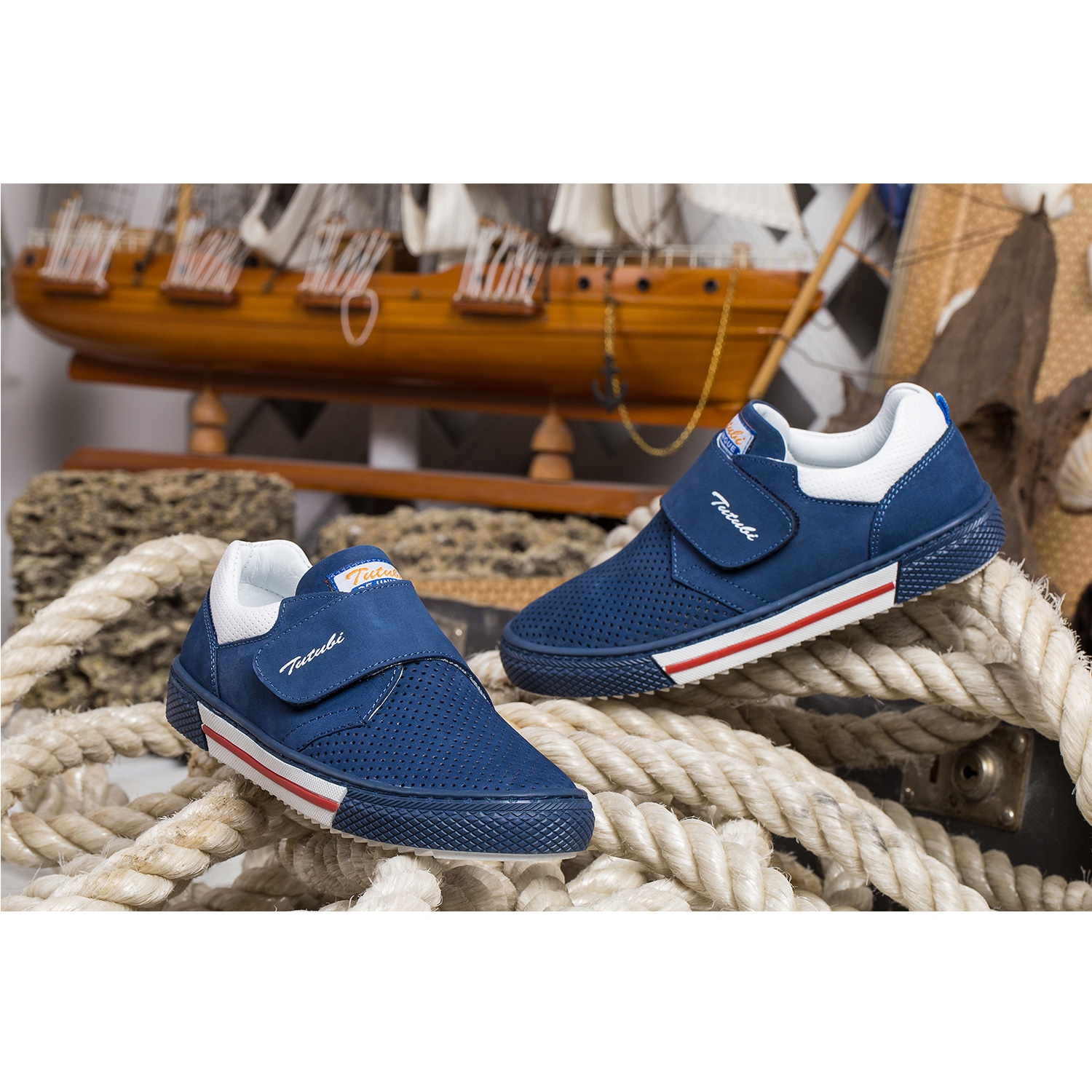 Прекрасная альтернатива закрытым босоножкам- перфорированные слипоны на плоской подошве, выполнены из эксклюзивного нубука синего цвета. Кожаная стелька с супинатором и твердый задник обеспечивают физиологически правильное положение ножки, а удобная фиксация на липучку позволит выбрать обувь на ногу разной полноты и высоты свода. Анатомическая износостойкая подошва из термокаучука с имитацией каблука Томаса и антишоковыми вставками, очень мягкая и амортизирует, обеспечивая комфортную походку. Обувь прочная и качественная подходит на сезон весна-лето.