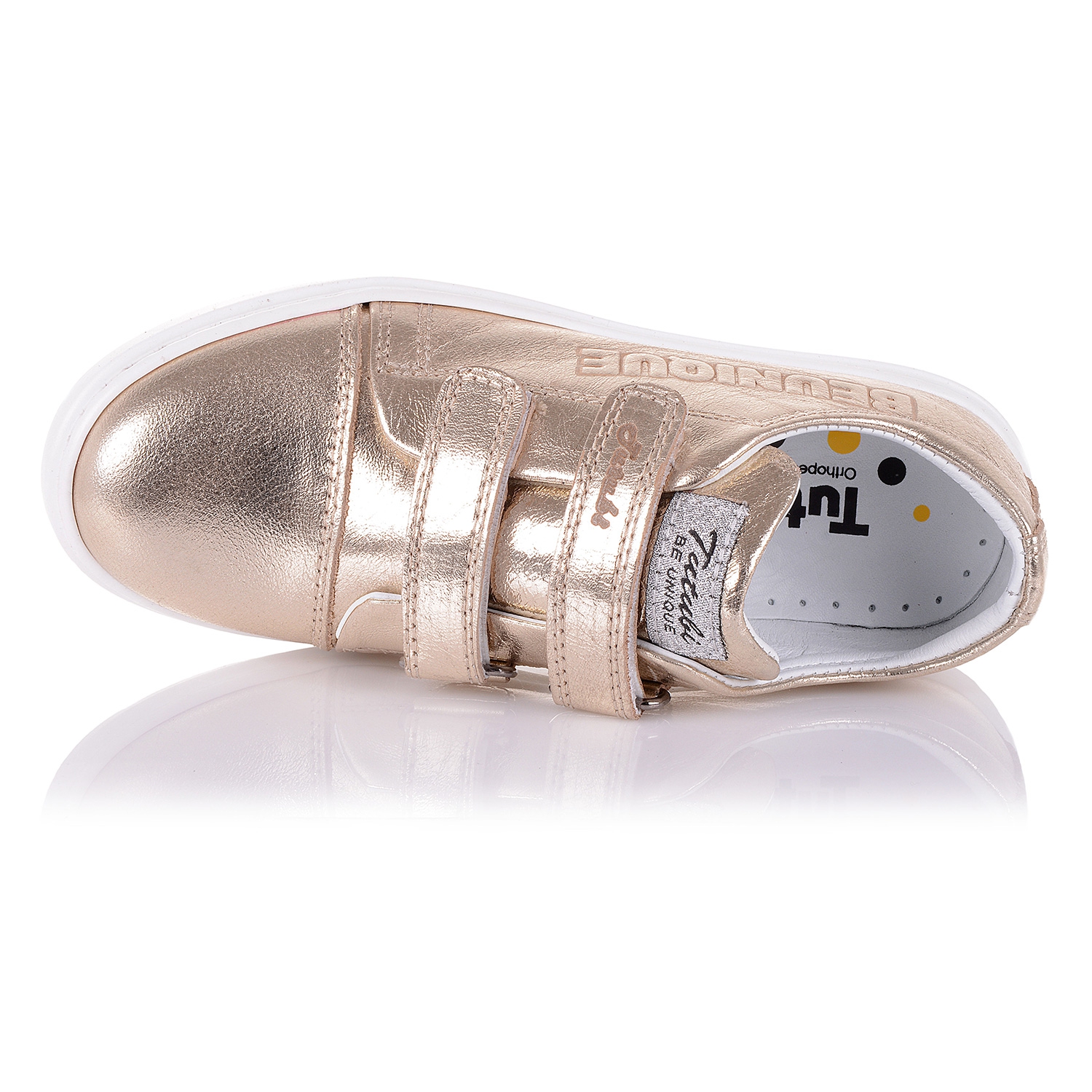 Супер-стильные слипоны, великолепный образ классического стиля с вплетением модных тенденций. Обувь выполнена из натуральной кожи золотистого цвета. Нога фиксируется двумя липучками. Кожаная анатомическая стелька с твердым супинатором и мягкой прослойкой в пяточной части, поддержит свод стопы и поспособствует здоровому развитию мышц и мягкой походке. О фиксации щиколотки позаботится жесткий задник. Подошва плотная из термокаучука. Позвольте вашему ребенку роскошь носить качественную ортопедическую обувь, привлекая восторженные взгляды окружающих.