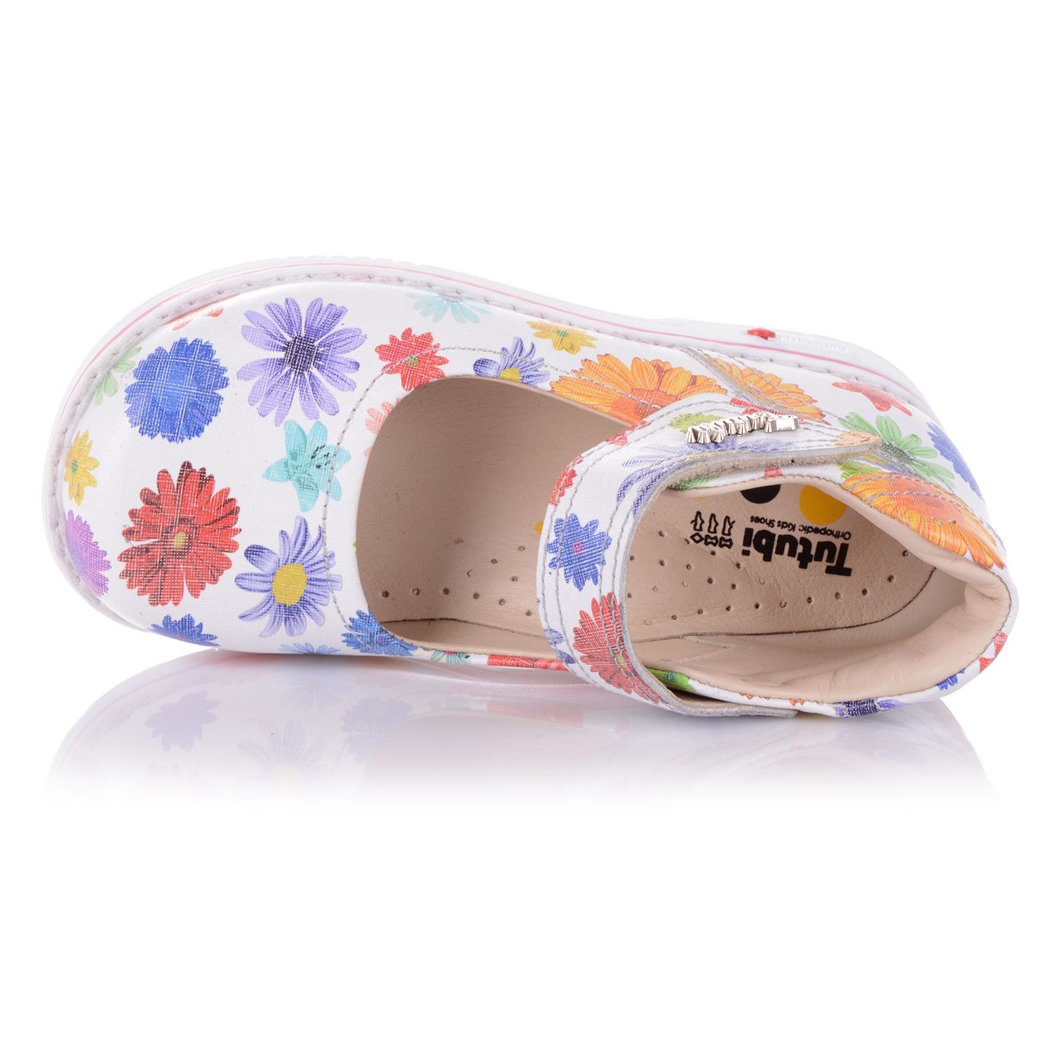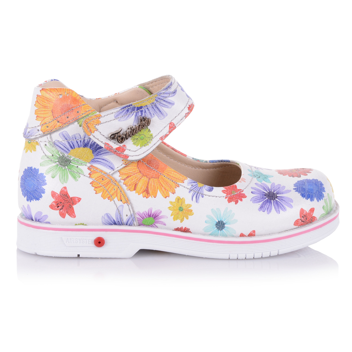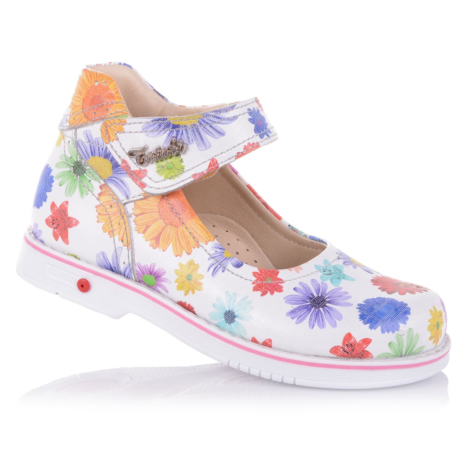 Модные ортопедические туфельки для девочки из эксклюзивной кожи с цветочным принтом. Удобная фиксация на липучку позволяет подобрать обувь на ногу разной полноты и высоты свода. Дышащая стелька с супинатором и твердый задник обеспечивают физиологически правильное положение ножки. Подошва, износостойкая из термокаучука, со скошенным каблуком Томаса и антишоковыми вставками, которые снимают ударную нагрузку на пяточную кость. Одевая такую пару обуви, Ваш ребенок будет чувствовать себя комфортно и эксклюзивно.