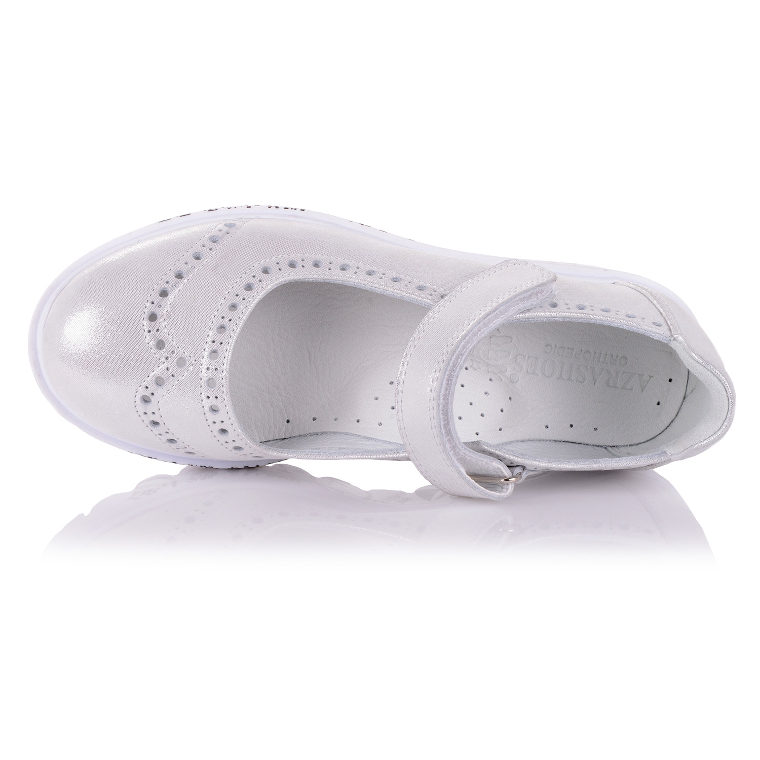 Стильная новинка- ортопедические туфли на девочку из эксклюзивного нубука серебристого цвета. Внутренняя мягкая кожаная стелька "SOFT EFFECT" с супинатором и твердый задник обеспечивают физиологически правильное положение ноги, а удобная фиксация на липучку позволит выбрать обувь на ногу разной полноты и высоты свода. Подошва, износостойкая из термокаучука. Эти туфли станут неотьемлемой частью гардероба вашего ребенка, а трендовое сочетание матового верха обуви с широкой подошвой создаст самый стильный образ!