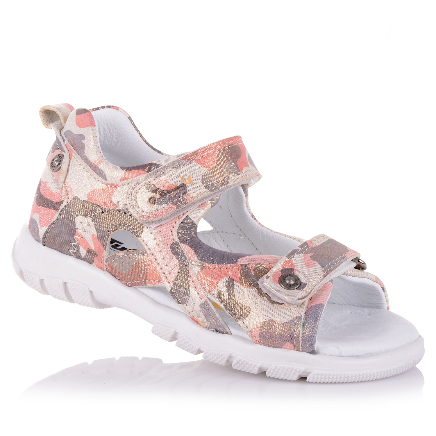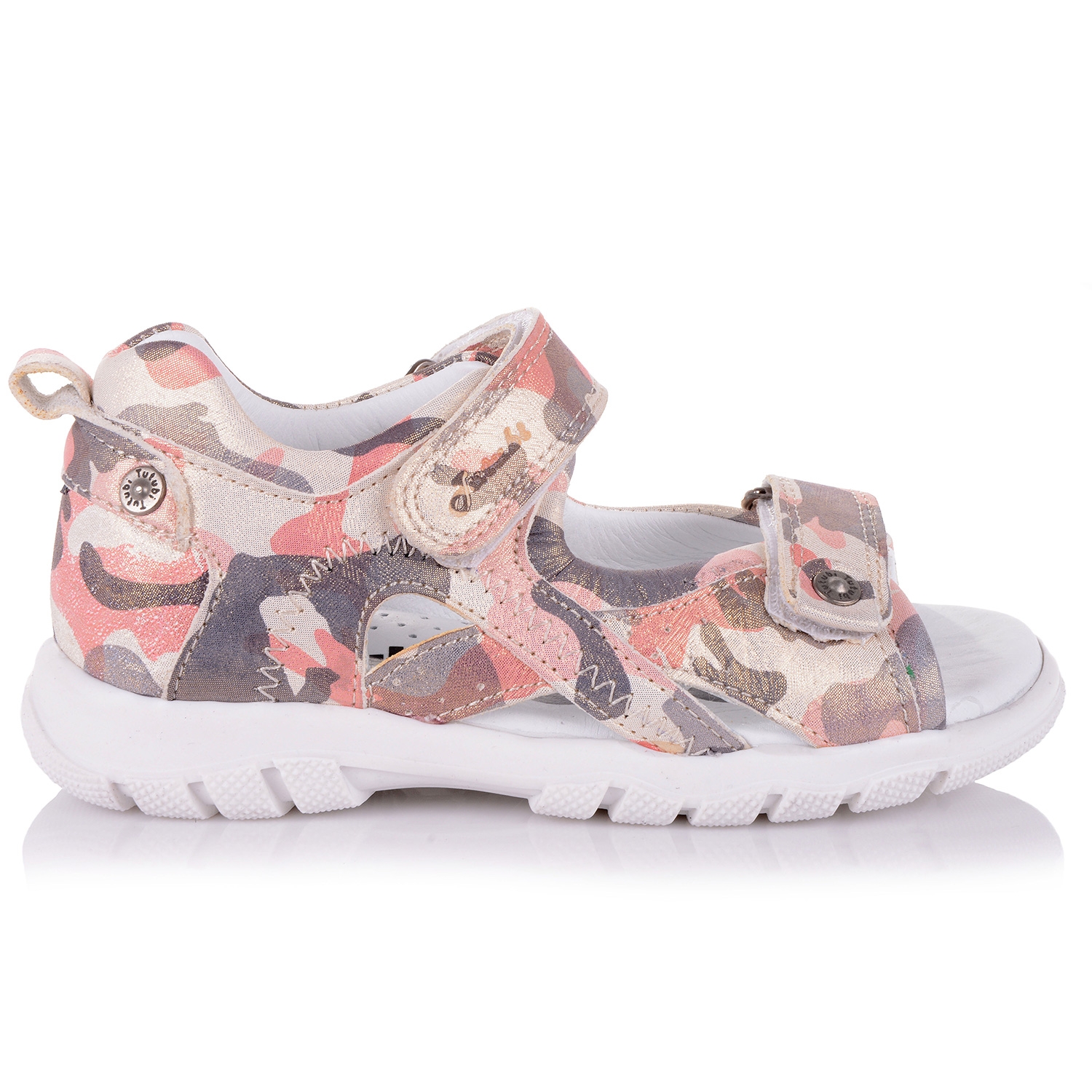 Супер-модные босоножки фирми Tutubi. Внешняя часть выполнена из натурального нубука с тиснененным принтом. Внутрення часть изделия - из изнатуральной кожи. Удобная фиксация на две липучки позволяет подобрать обувь на ногу разной полноты и высоты свода. Стелька с супинатором и твердый задник обеспечивают физиологически правильное положение ножки. Легкая анатомическая износостойкая подошва из термокаучука с антишоковыми вставками, которые снимают ударную нагрузку на пяточную кость. Такая модель идеально подойдет для ежедневных прогулок.