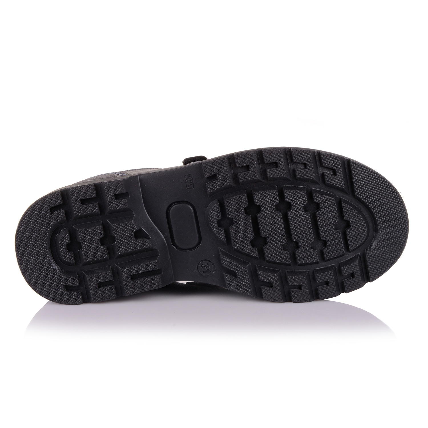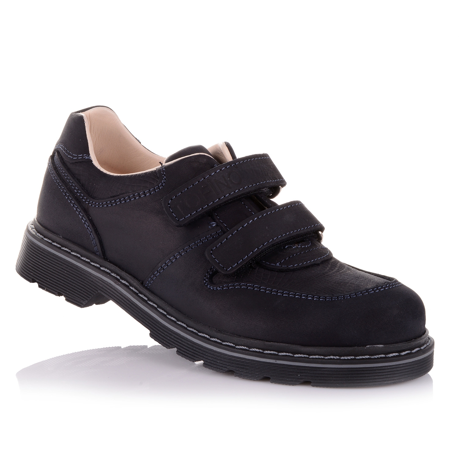 Шкільне взуття виконане із жирного нубуку темно-синього кольору з вибивним принтом. Нога зручно фіксується двома липучками. Шкіряна анатомічна устілка з твердим супінатором і м'яким прошарком в частині п'яти, підтримує склепіння стопи та сприяє здоровому розвитку м'язів, а також м'якій ході. Про фіксацію щиколотки потурбується жорсткий задник. Підошва щільна з термокаучука із скошеним каблуком. Любителі екстравагантної класики оцінять цю модель належним чином.