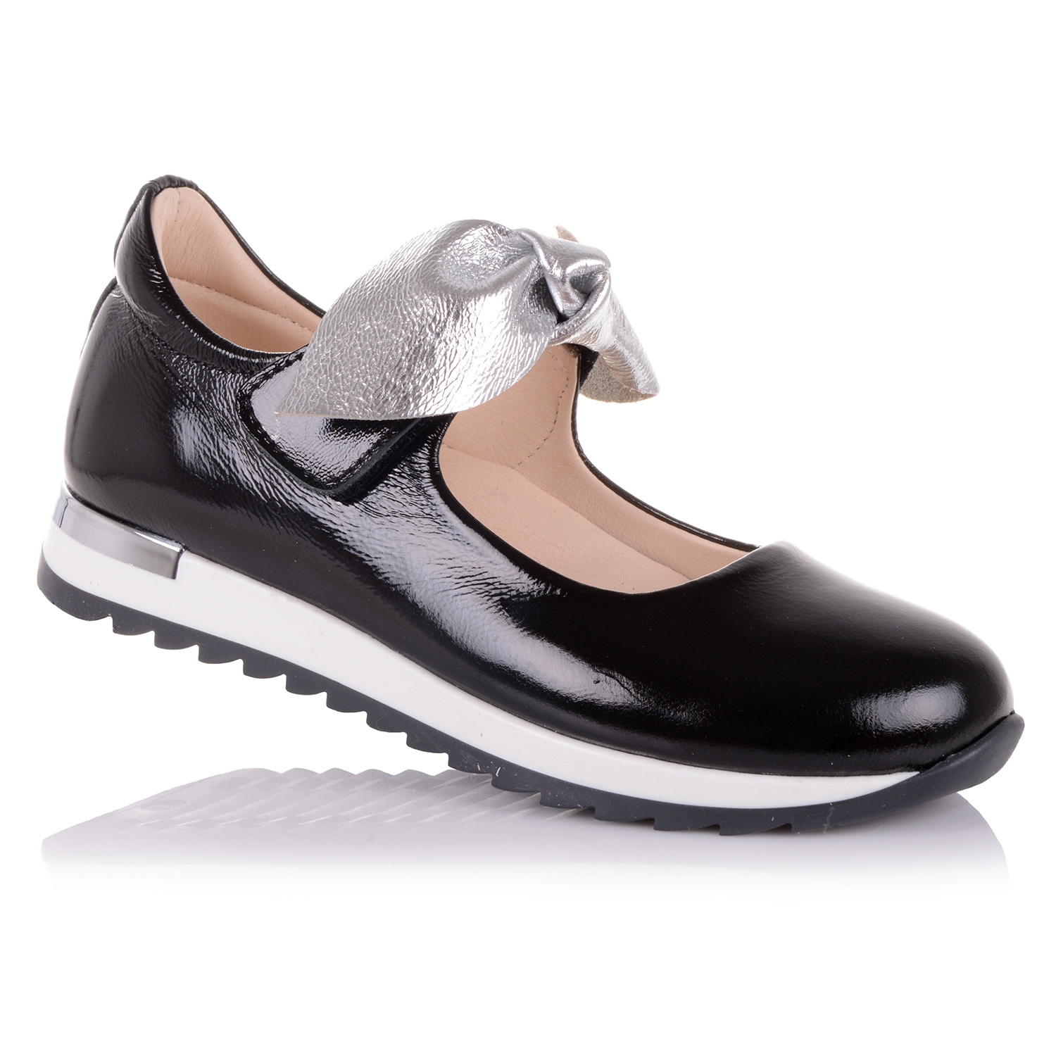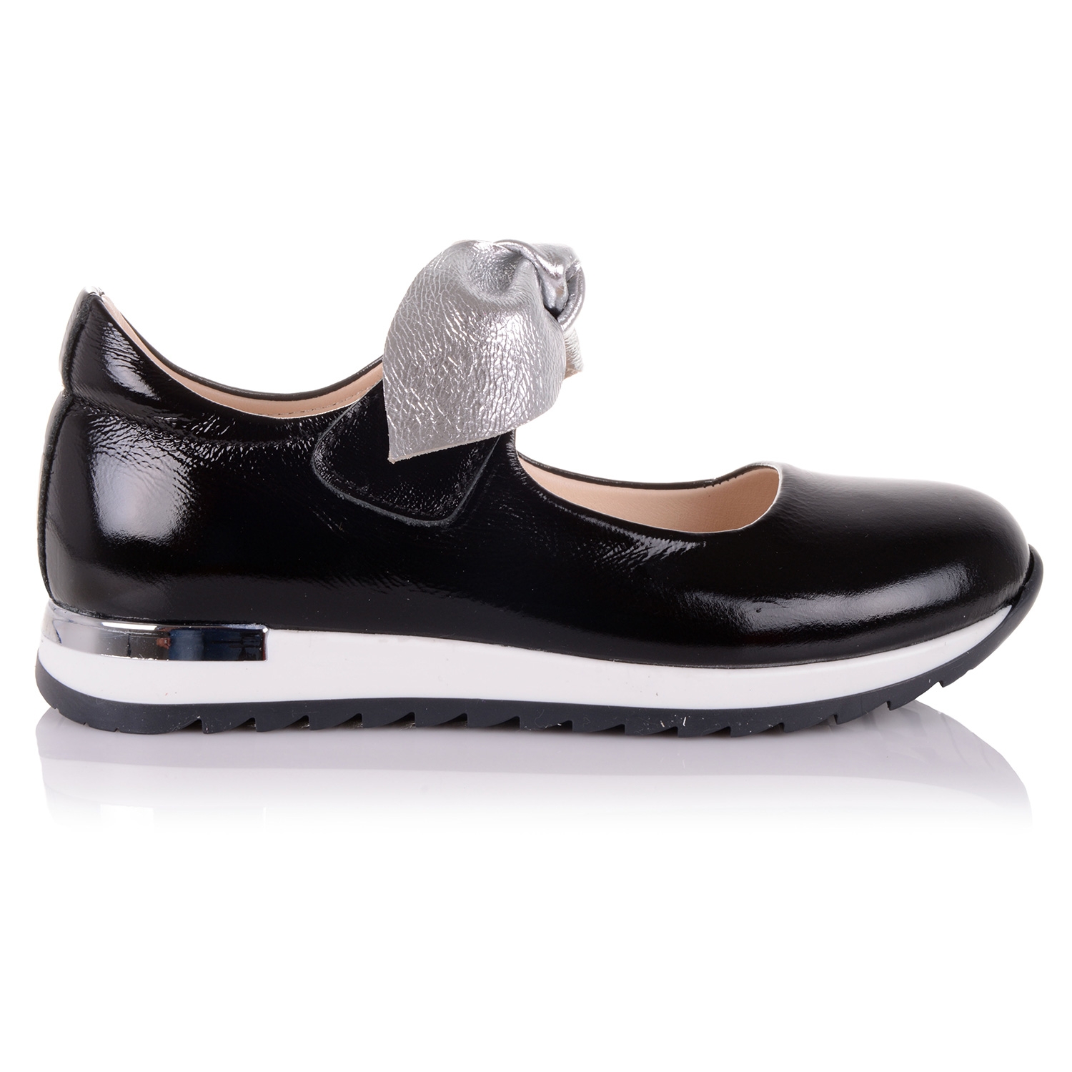 Супер-стильные туфли на кроссовочной подошве- оригинальный симбиоз удобства и красоты! Туфли выполнены из натуральной лаковой кожи черного цвета с большим серебристым бантом, подойдут практически под любой гардероб. Нога фиксируется липучкой. Внутренняя мягкая кожаная стелька "SOFT EFFECT" с супинатором и твердый задник обеспечивают физиологически правильное положение ножки. Подошва износостойкая из термокаучука, обеспечивает амортизацию, комфортную походку и хорошее сцепление с твердой поверхностью. Обувь такого качества и дизайна приковывает взгляды!