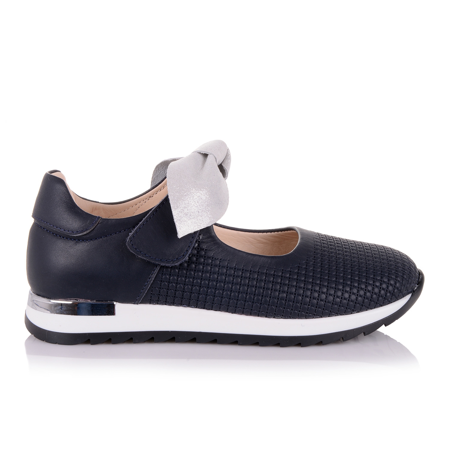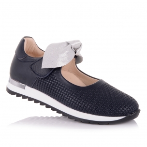 Супер-стильные туфли на кроссовочной подошве- оригинальный симбиоз удобства и красоты! Туфли выполнены из натуральной кожи темно-синего цвета с большим серебристым бантом, подойдут практически под любой гардероб. Нога фиксируется липучкой. Внутренняя мягкая кожаная стелька "SOFT EFFECT" с супинатором и твердый задник обеспечивают физиологически правильное положение ножки. Подошва износостойкая из термокаучука, обеспечивает амортизацию, комфортную походку и хорошее сцепление с твердой поверхностью. Обувь такого качества и дизайна приковывает взгляды!