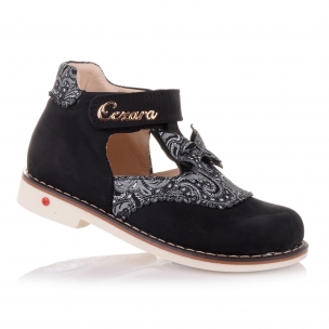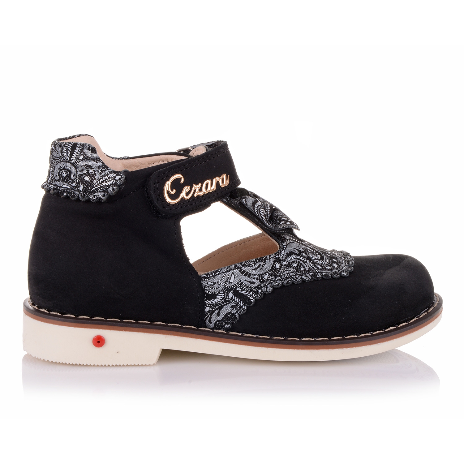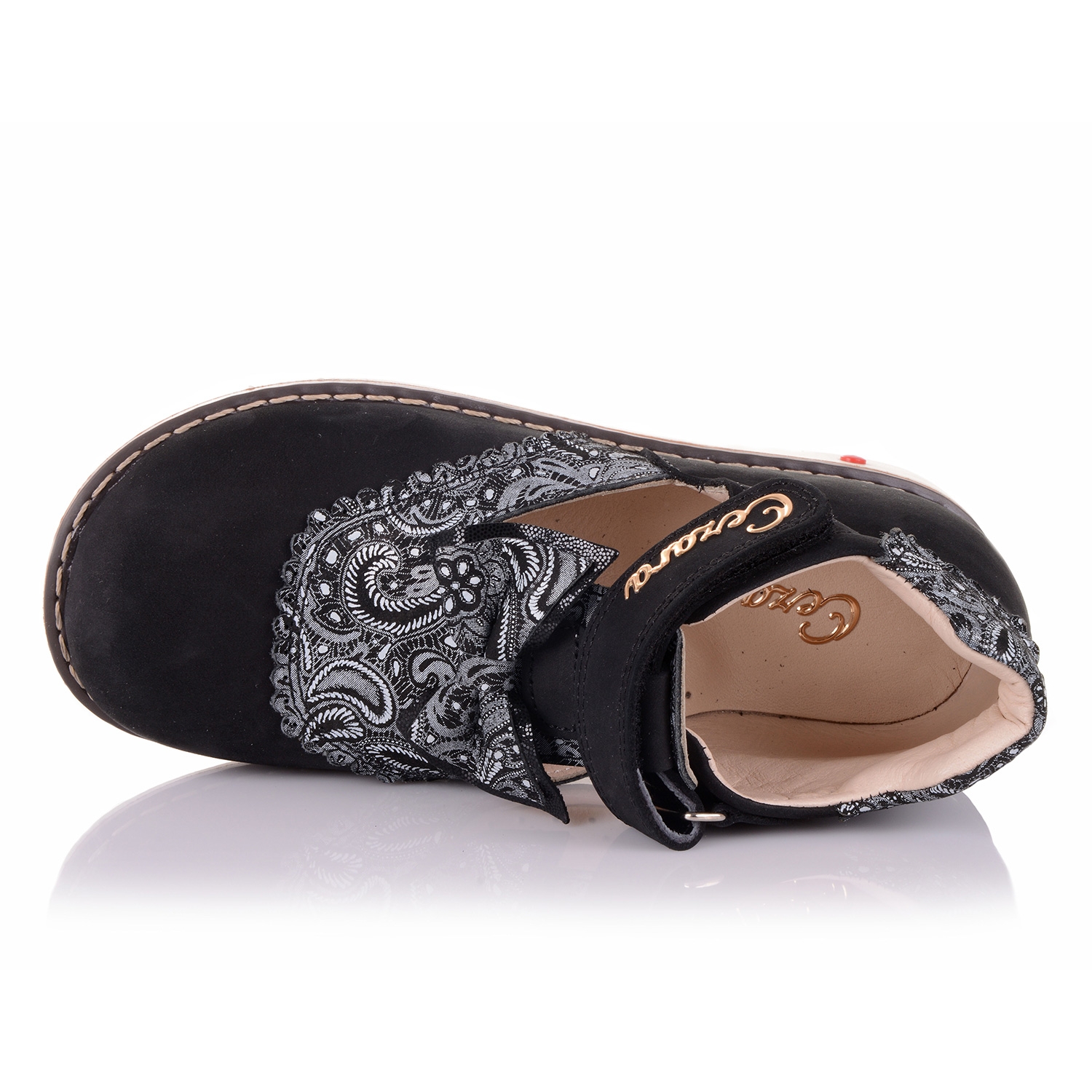 Стильные ортопедические туфельки турецкой фирмы Цезара для девочки из натурального нубука черного цвета с оригинальным вставками цветочного принта. Удобная фиксация на липучку позволяет подобрать туфли на ногу разной полноты и высоты свода. Каблук Томаса с удлиненным внутренним краем обеспечит правильную постановку ноги. Анатомическая кожаная стелька с супинатором поддержит свод стопы и поспособствует здоровому развитию мышц. О фиксации голенища и щиколотки позаботятся укрепленные берцы и жесткий задник. А хрупкие суставы будут защищены от чрезмерных нагрузок благодаря амортизационной вставке. Одевая пару обуви такого качества, Ваш ребенок будет чувствовать себя комфортно и эксклюзивно. Соответствие размера: большемерят (возьмите на размер меньше).