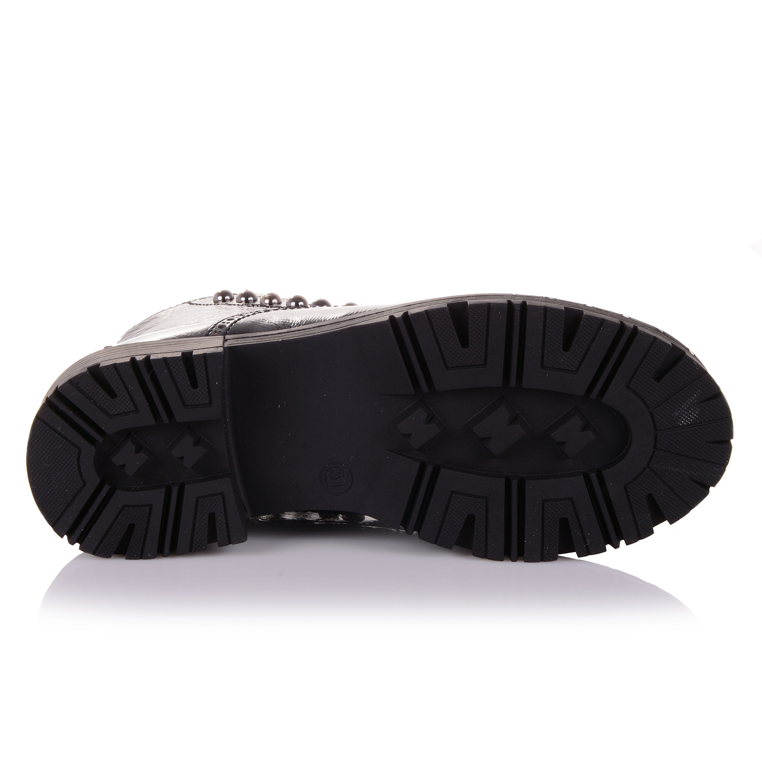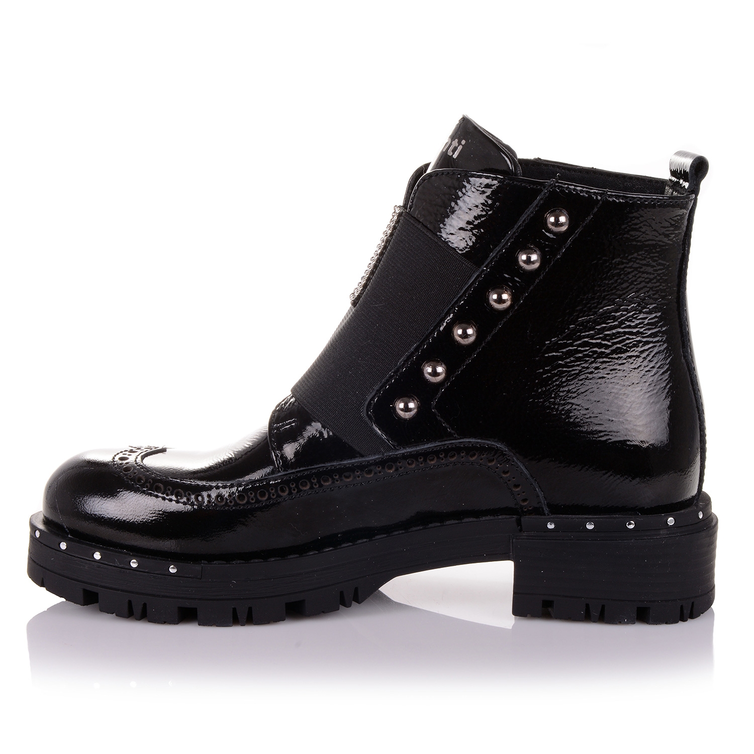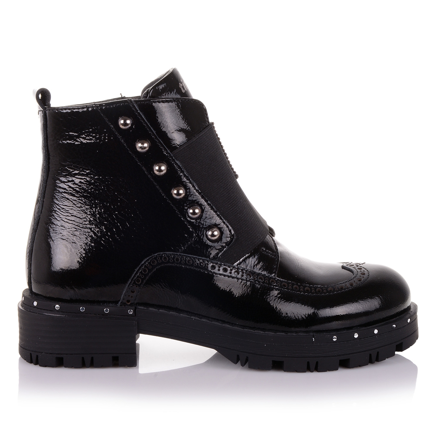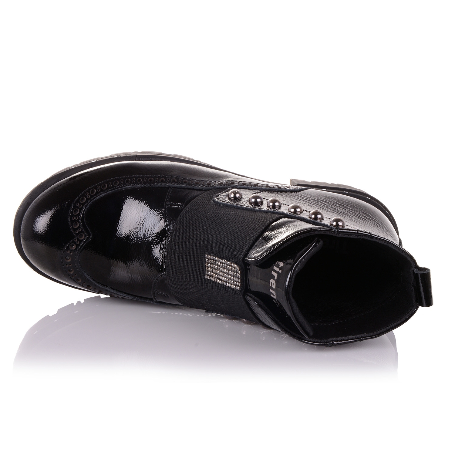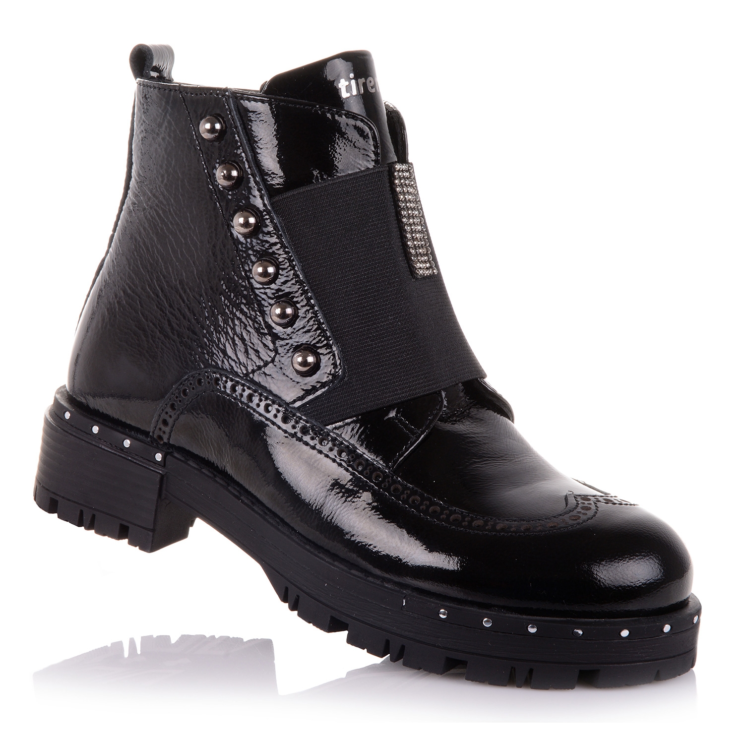 Стильные и универсальные демисезонные ботинки, с которыми можно создать огромное количество образов. Обувь выполнена в лаковой коже черного цвета, внутри плотный флис. Резинка со стразами имеет декоративную и практическую функции поддержания стопы. Анатомическая стелька с твердым супинатором и мягкой прослойкой в пяточной части, поддержит свод стопы и поспособствует здоровому развитию мышц и мягкой походке. Контрастная подошва белого цвета, плотная из термокаучука, достаточно хорошо гнется. Экспериментируйте и создавайте самые красивые образы с обувью Tirenti.