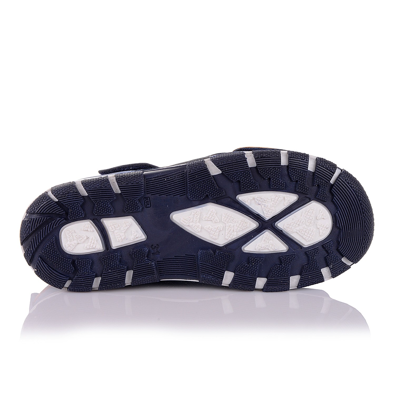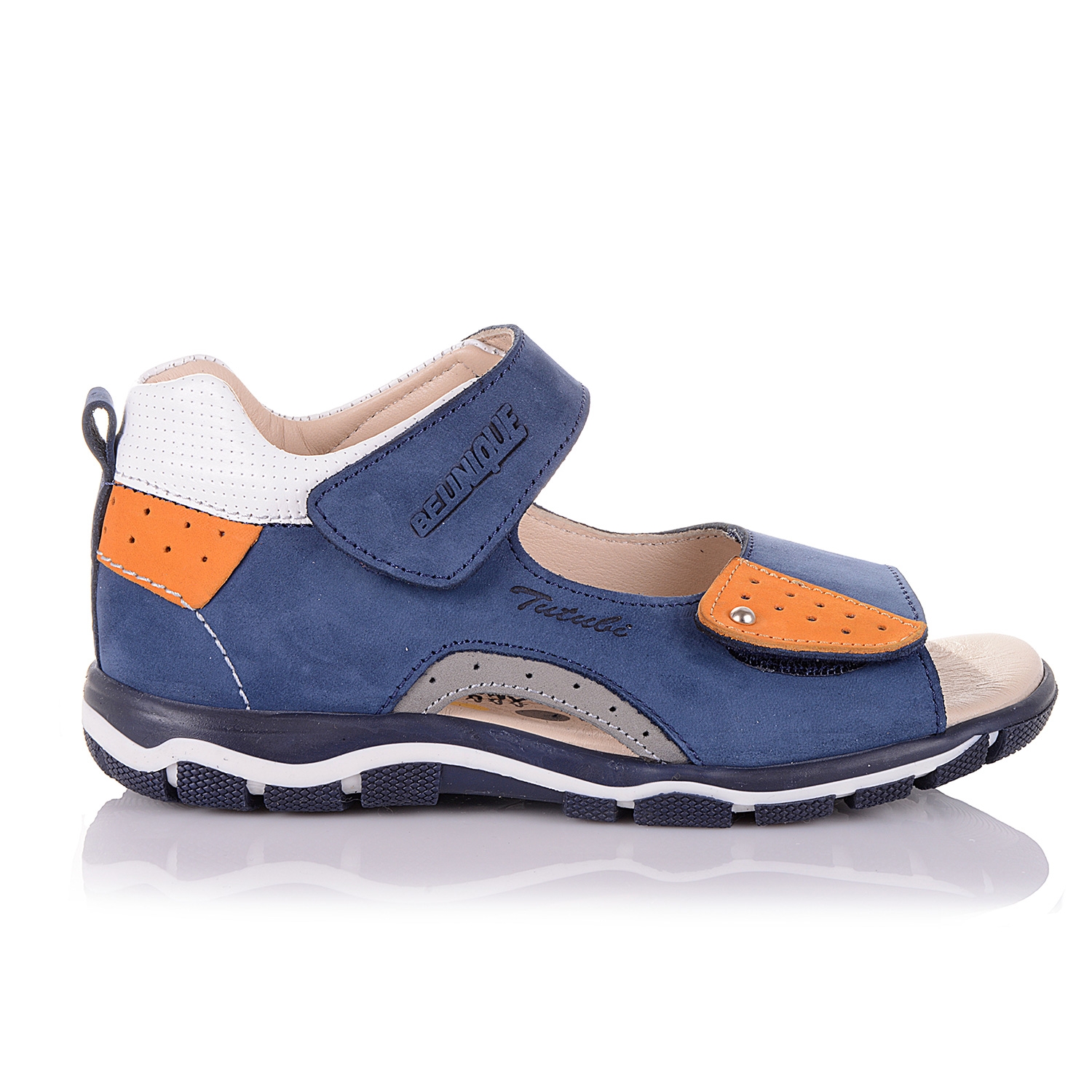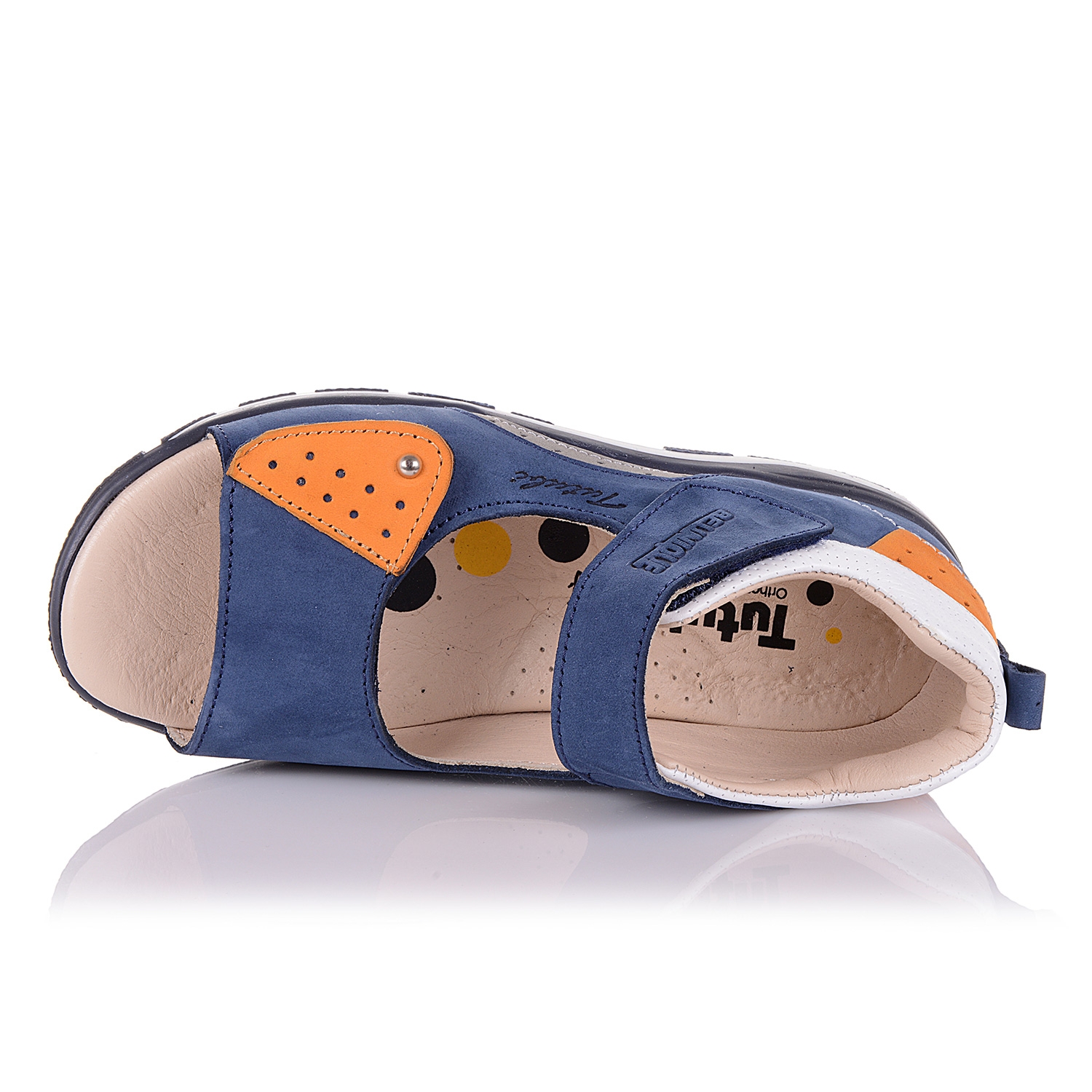 Босоножки синего цвета с оранжевыми вставками - ультрамодная модель этого сезона. Внутренняя и внешняя часть изделия выполнена из натуральной кожи. Удобная фиксация на две липучки позволяет подобрать обувь на ногу разной полноты и высоты свода. Стелька с супинатором и твердый задник обеспечивают физиологически правильное положение ножки. Легкая анатомическая износостойкая подошва из термокаучука с антишоковыми вставками, которые снимают ударную нагрузку на пяточную кость. Такая модель идеально подойдет для ежедневных прогулок