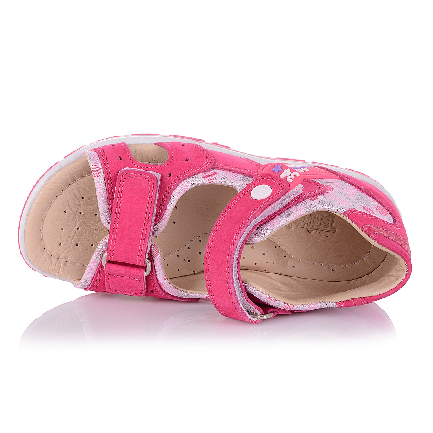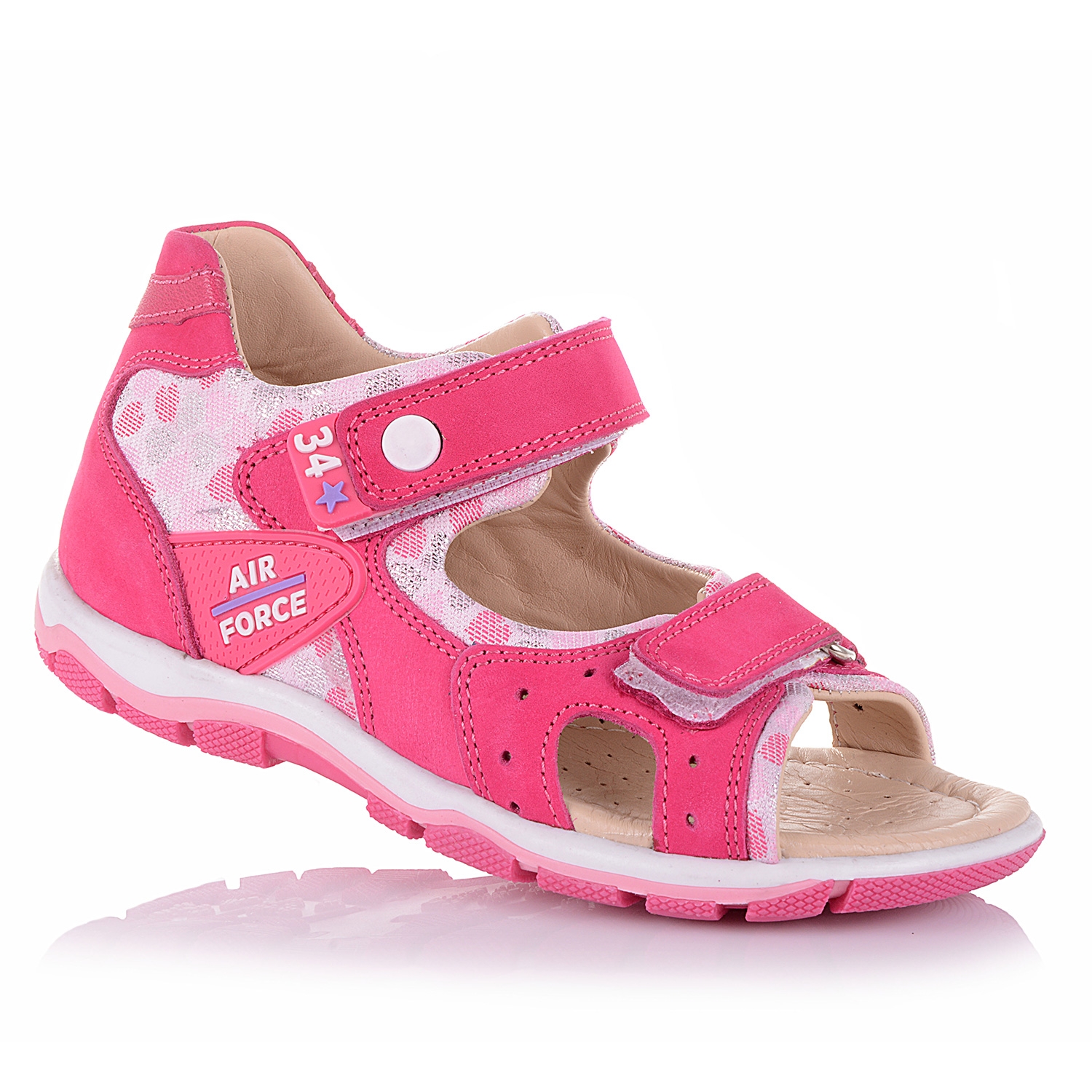 Яркие босоножки из эксклюзивного малинового нубука в сочетании с текстилем. Удобная фиксация на две липучки позволяет подобрать обувь на ногу разной полноты и высоты свода. Стелька с супинатором, твердый задник, углубление и защитная поддержка передней части стопы обеспечивают физиологически правильное положение ножки. Анатомическая износостойкая подошва из термокаучука с антишоковыми вставками, которые снимают ударную нагрузку на пяточную кость. Такая модель идеально подойдет для ежедневных прогулок.