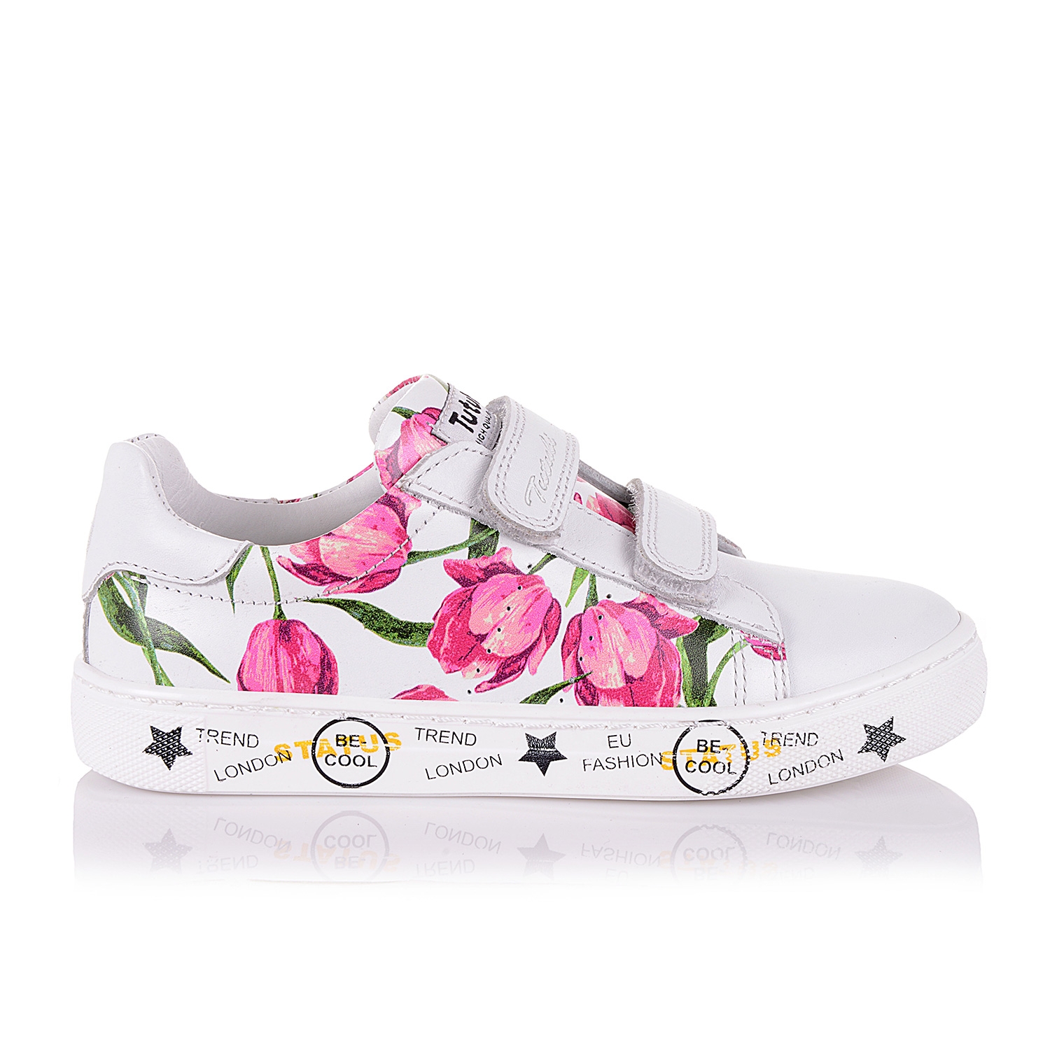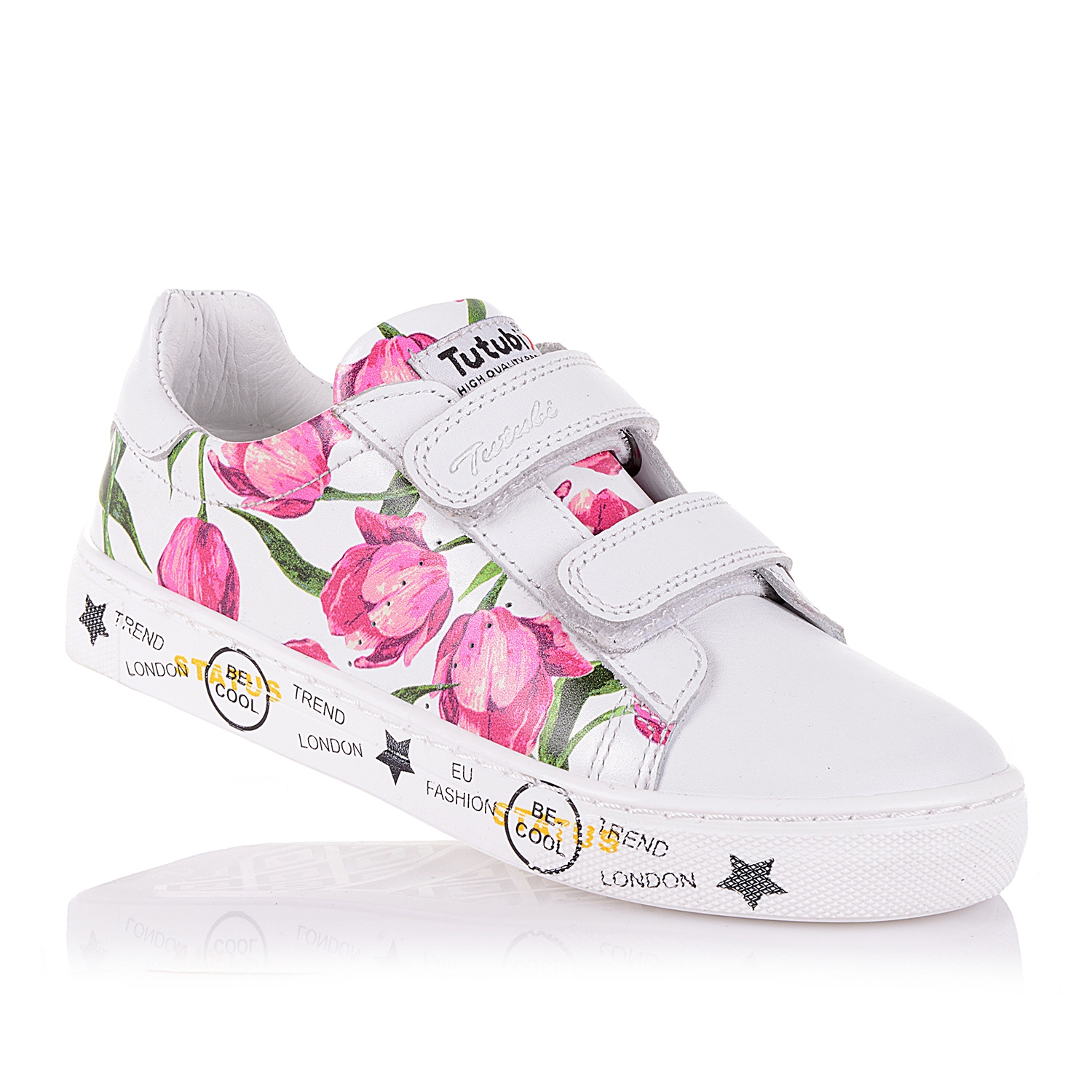 Стильные кроссовки из натуральной кожи белого цвета с узорами. Внутренняя мягкая кожаная стелька с супинатором и твердый задник обеспечивают физиологически правильное положение ноги, а удобная фиксация на две липучки позволит выбрать обувь на ногу разной полноты и высоты свода. Подошва, износостойкая из термокаучука- мягкая, при ходьбе амортизирует. Шикарный выбор как для спорта, так и для ежедневных прогулок. Ваш ребенок останется доволен.
