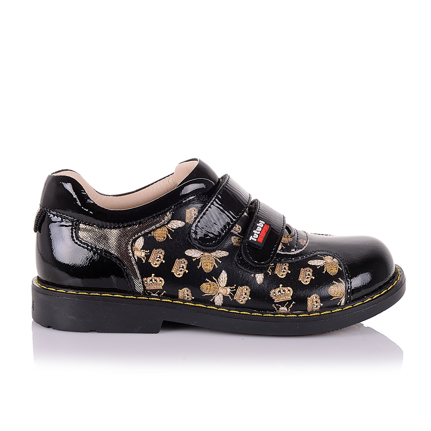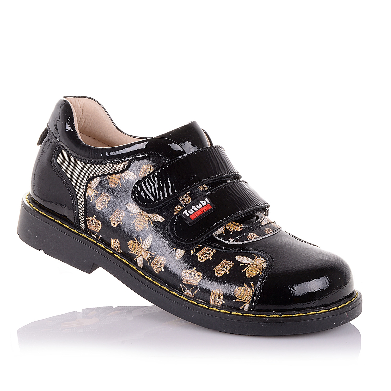 Элегантные туфли на девочку актуальны как к городскому образу, так и к школьной форме. Выполнена модель из натуральной кожи черного цвета в сочетании с лаковой кожей. Нога удобно фиксируется двумя липучками. Кожаная анатомическая стелька с твердым супинатором и мягкой прослойкой в пяточной части, поддержит свод стопы и поспособствует здоровому развитию мышц и мягкой походке. О фиксации щиколотки позаботится жесткий задник. Подошва плотная из термокаучука с каблуком Томаса. Любители экстравагантной классики оценят данную модель по достоинству. Рекомендовано украинскими ортопедами для ежедневной профилактики плоскостопия.