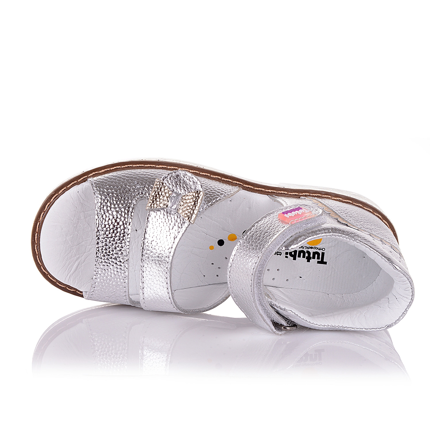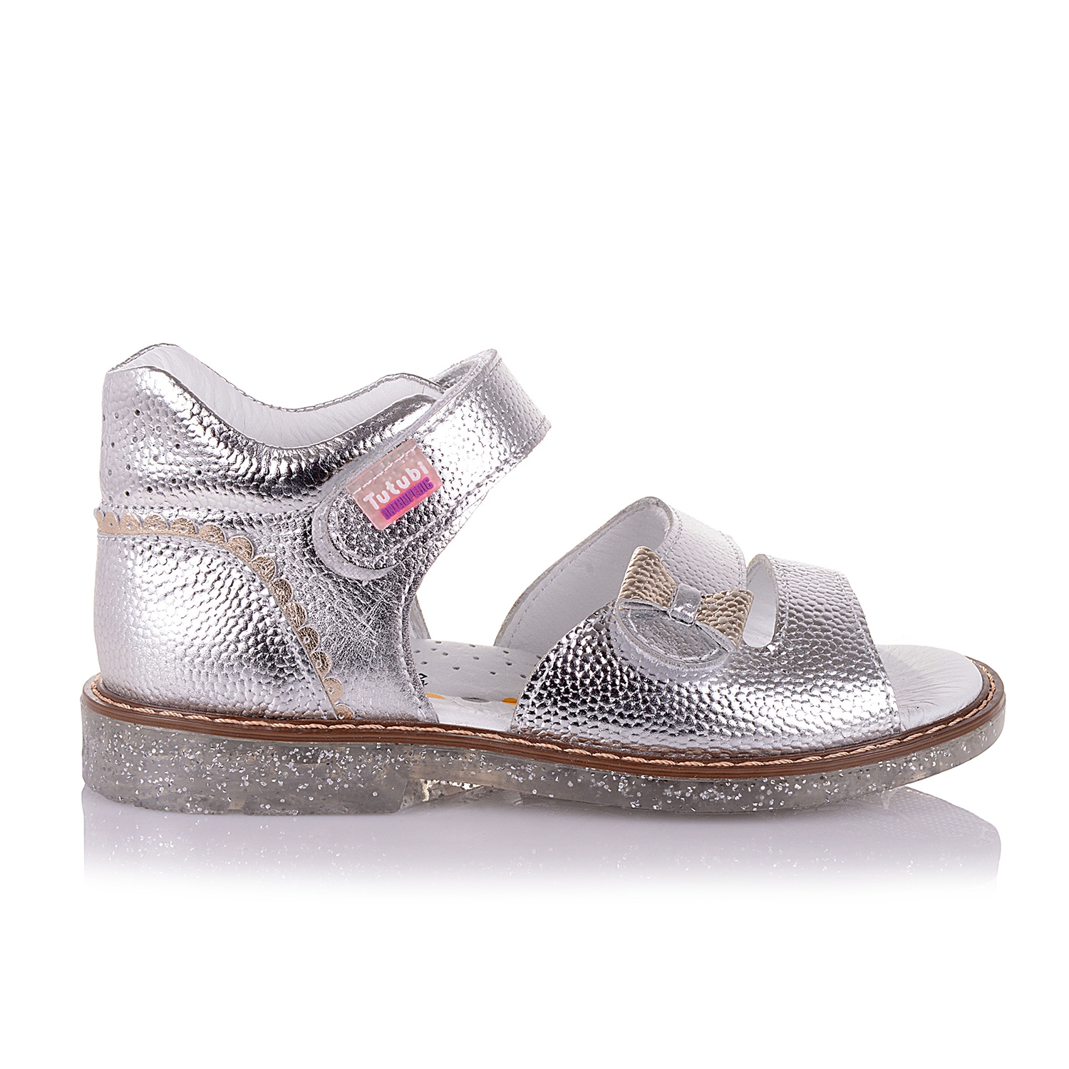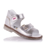 Модная новинка- ортопедические босоножки из натуральной кожи серебристого цвета смотрятся очень оригинально. Удобная фиксация двумя липучками позволяет подобрать обувь на ногу разной полноты и высоты свода. Кожаная стелька с супинатором и твердый задник обеспечивают физиологически правильное положение ножки. Подошва, износостойкая из термокаучука, со скошенным каблуком Томаса и антишоковыми вставками, которые снимают ударную нагрузку на пяточную кость. Обувь прочная и износостойкая, ваш ребенок будет чувствовать себя в ней комфортно и уверенно.