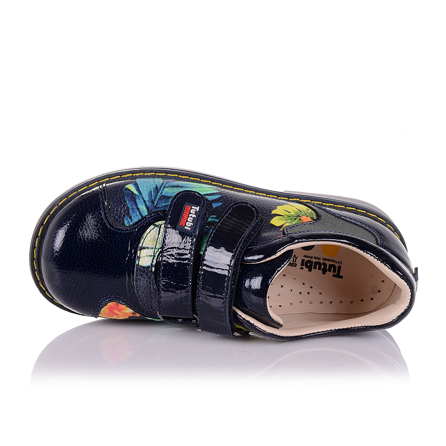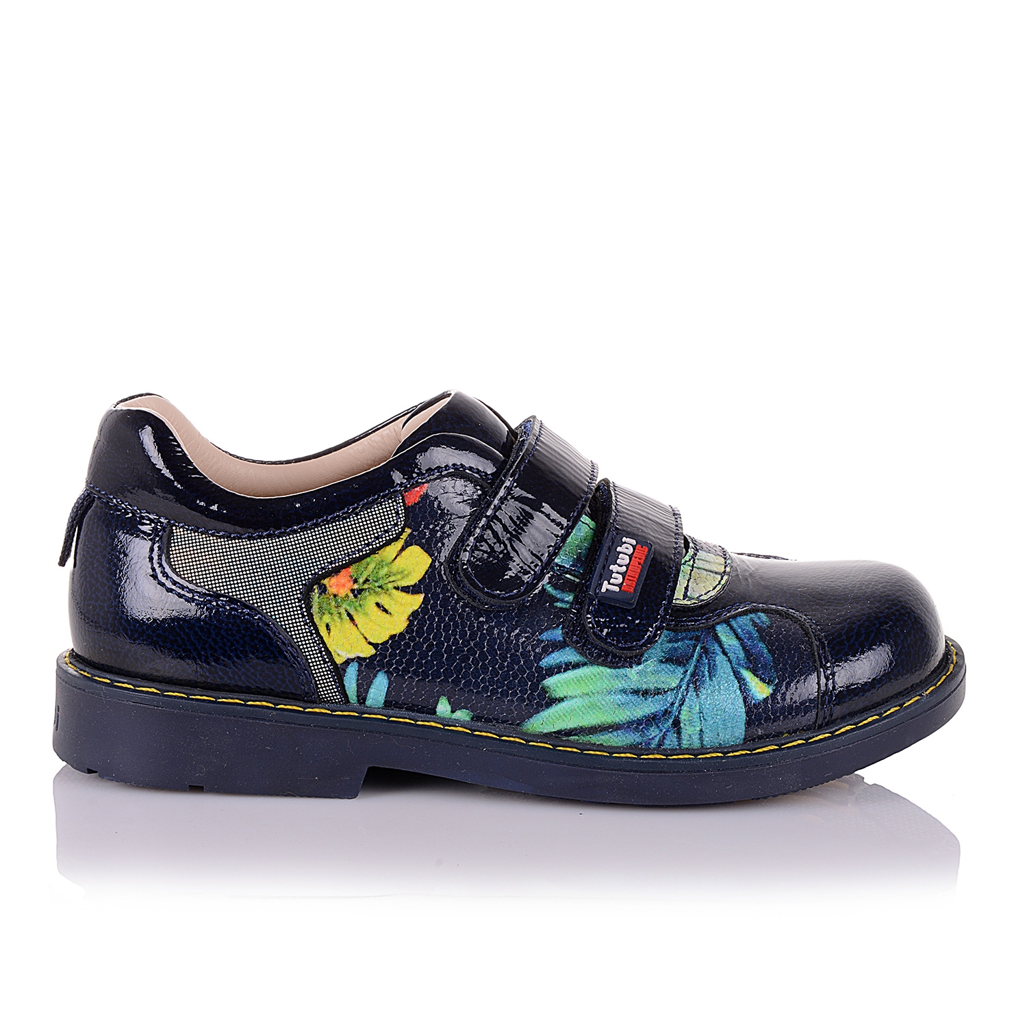 Элегантные туфли на девочку актуальны как к городскому образу, так и к школьной форме. Выполнена модель из лаковой кожи синего цвета в сочетании с цветочным принтом. Нога удобно фиксируется двумя липучками. Кожаная анатомическая стелька с твердым супинатором и мягкой прослойкой в пяточной части, поддержит свод стопы и поспособствует здоровому развитию мышц и мягкой походке. О фиксации щиколотки позаботится жесткий задник. Подошва плотная из термокаучука с каблуком Томаса. Любители экстравагантной классики оценят данную модель по достоинству. Рекомендовано украинскими ортопедами для ежедневной профилактики плоскостопия.
