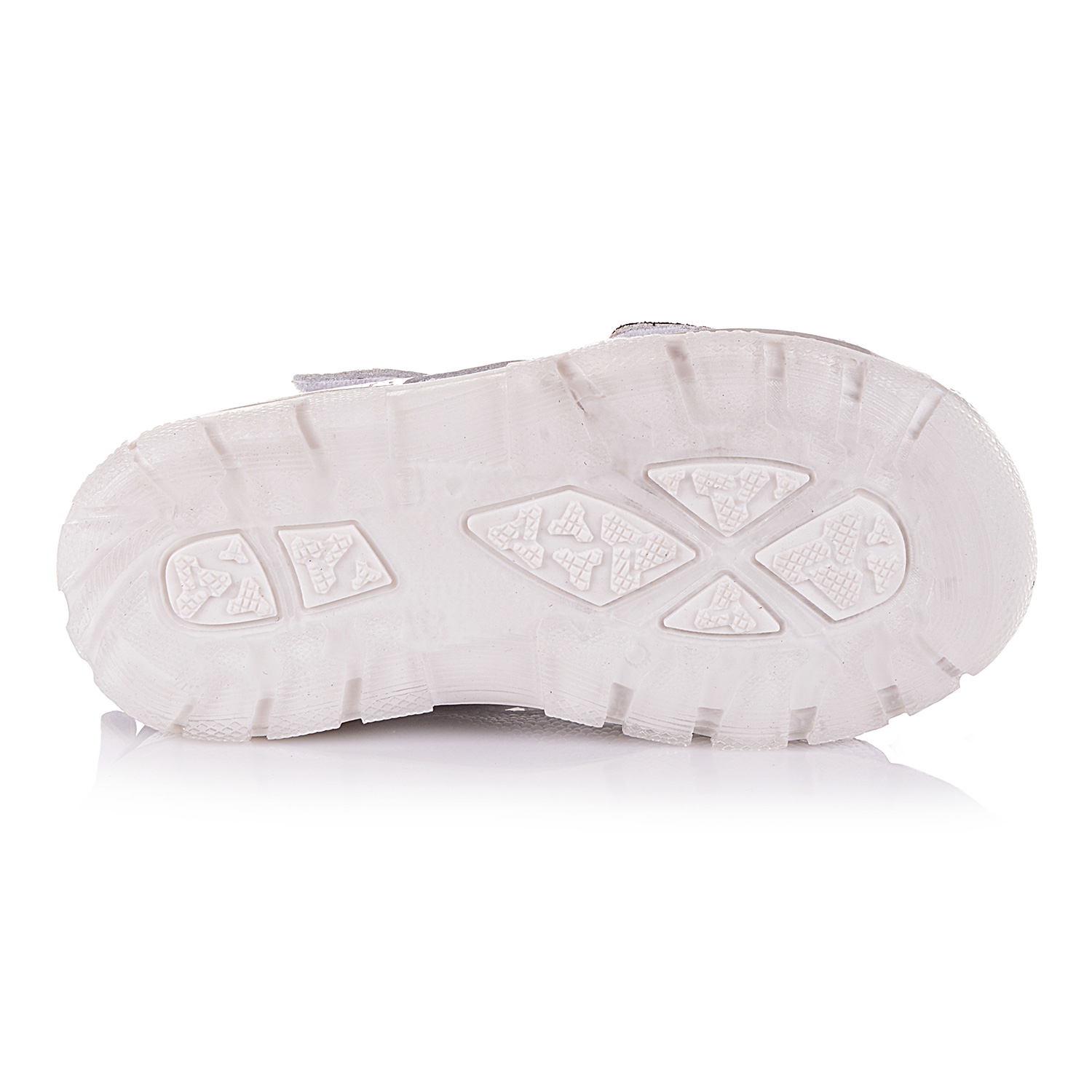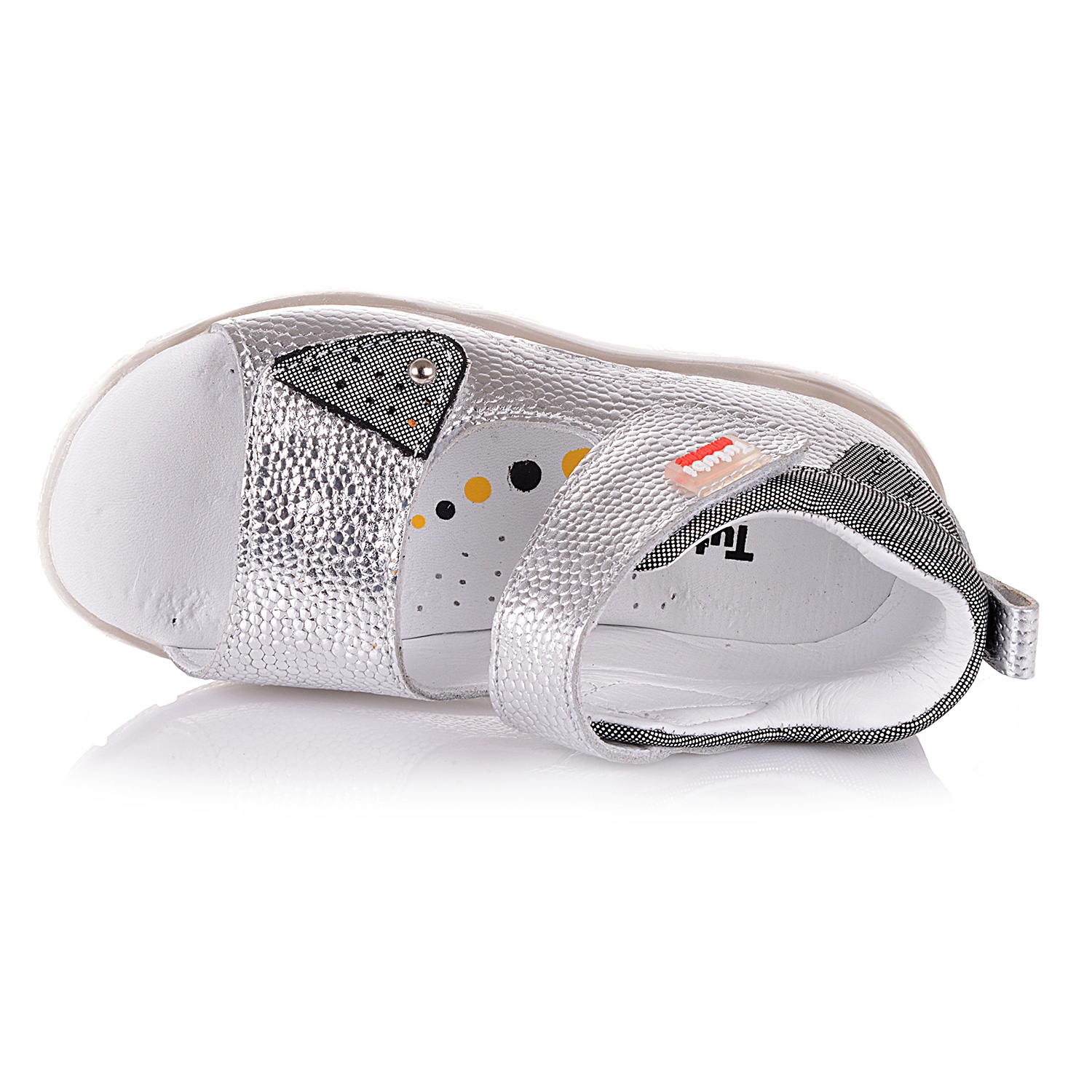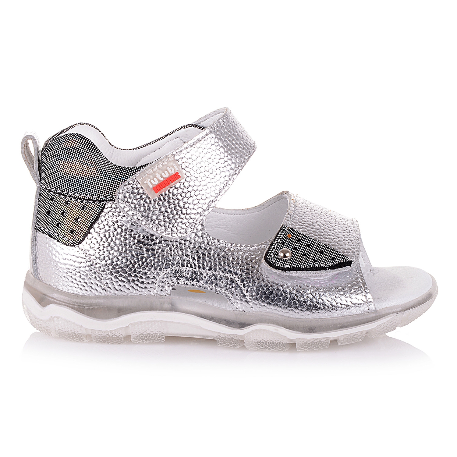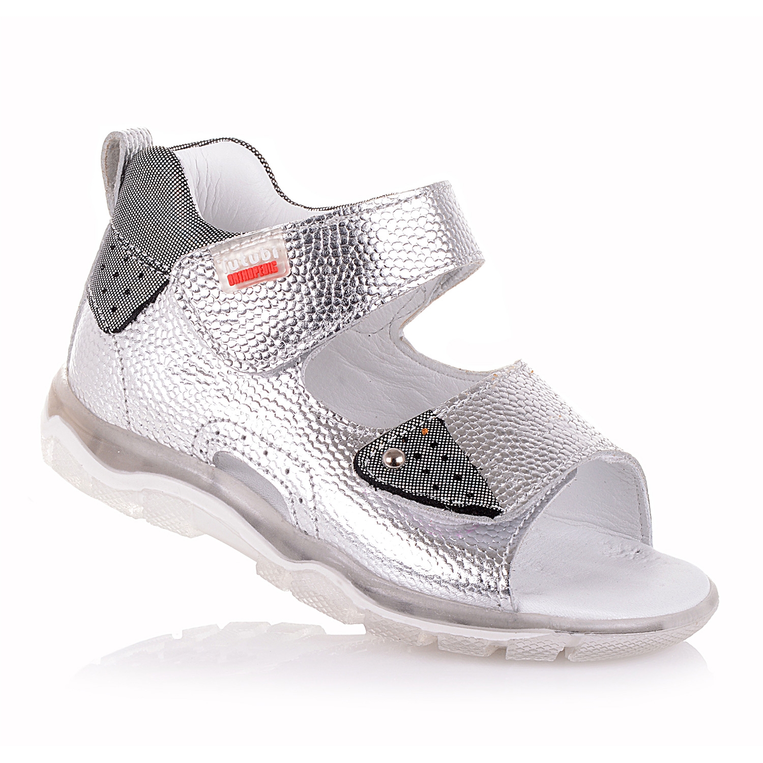 Надзвичайно гарні та зручні босоніжки сріблястого кольору забезпечують легкість та максимальний комфорт під час ходи. Взуття виготовлене із натуральної шкіри – як зовні, так и внутрішньо. За допомогою липучок босоніжки зручно фіксувати на ніжці, незалежно від її повноти та висоти підйому. Завдяки устілці з супінатором та твердій задній частині взуття ніжку легко утримувати у фізіологічно правильному положенні. Легка анатомічна підошва виготовлена із термокаучука, має антишокові вставки, які зменшують навантаження на п'яту. Така модель взуття ідеально підходить для щоденних прогулянок.